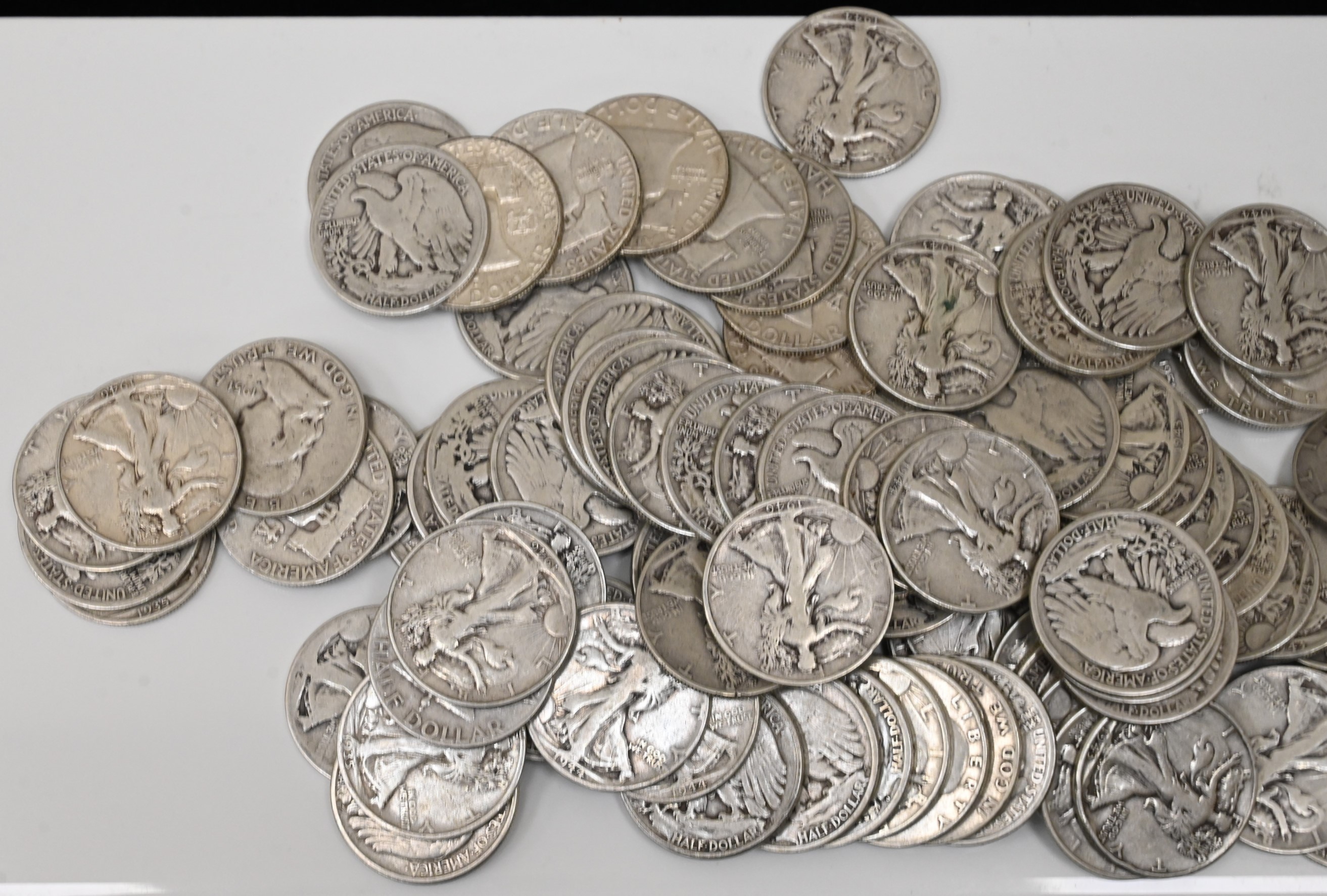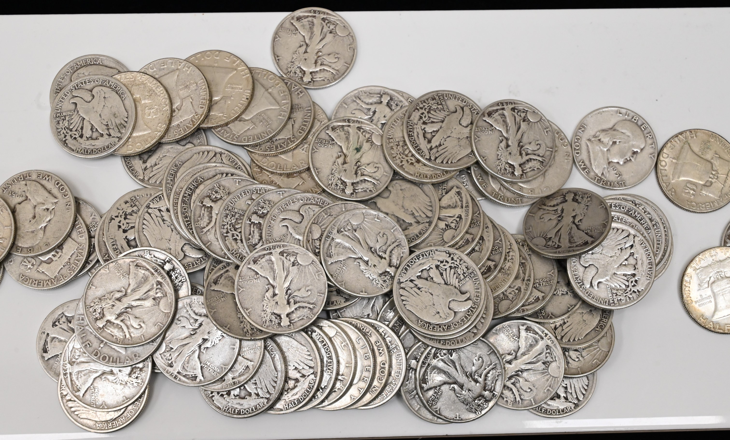 Fifty Dollars Face Value of 90% Walking Liberty and Franklin Half Dollars.