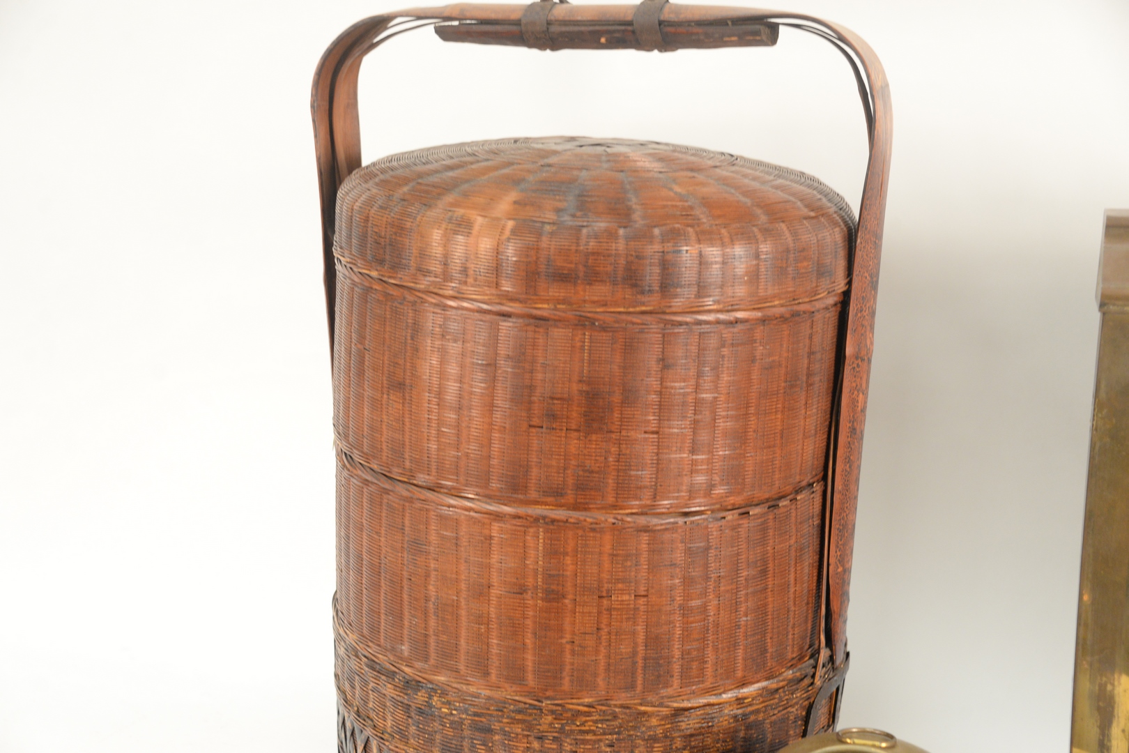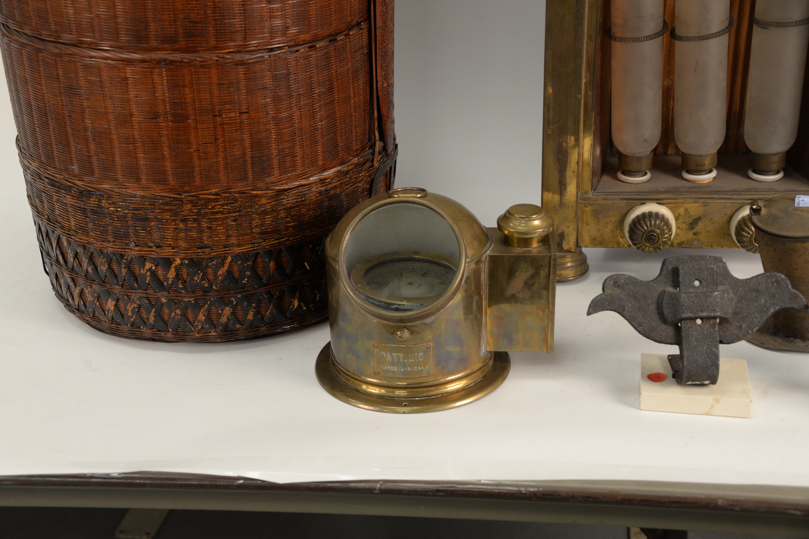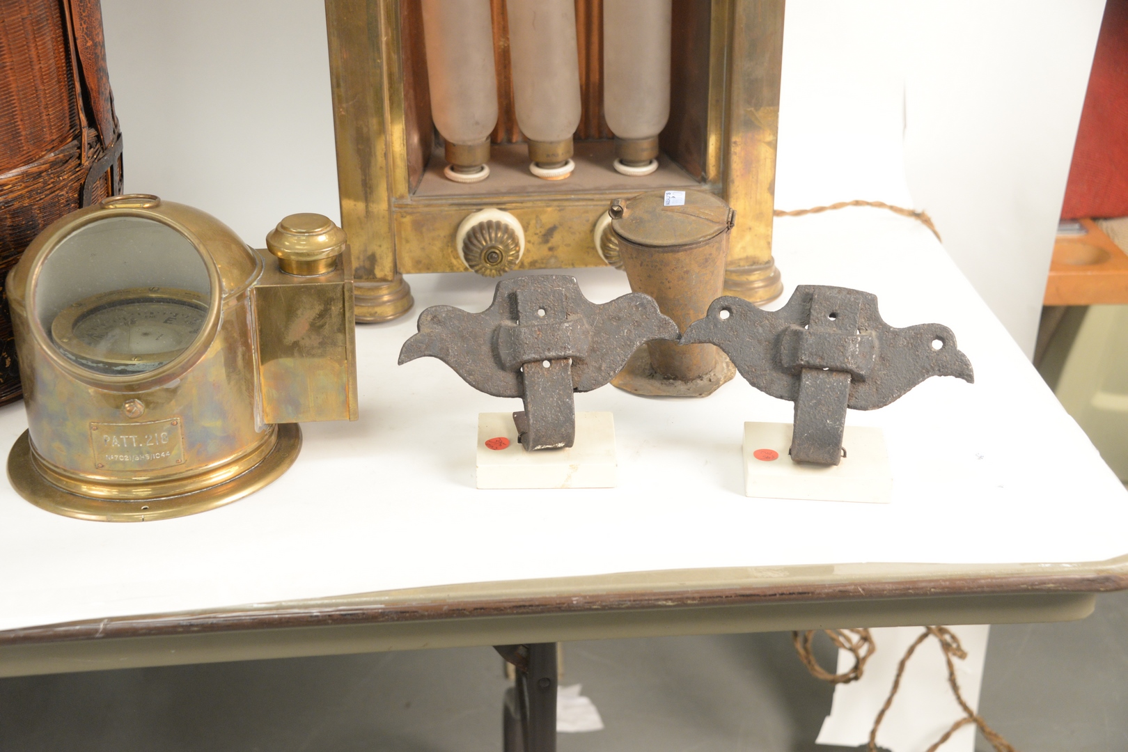 Lot 104: Five Piece Group, to include pair of American Iron Eagle Snow Catchers, height 5 1/2 inches, 19th century, Argentine brass cable foster space heater a English, brass binnacle, number 1044, marked Sestrel along with a Chinese bamboo wedding basket,