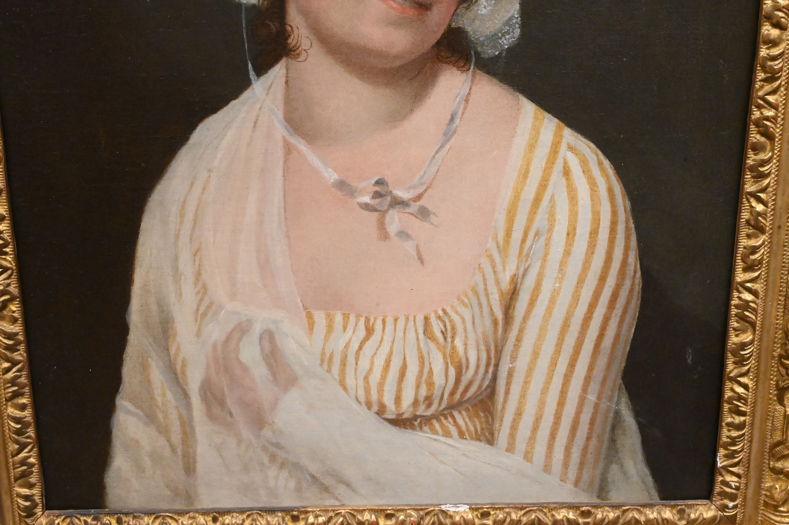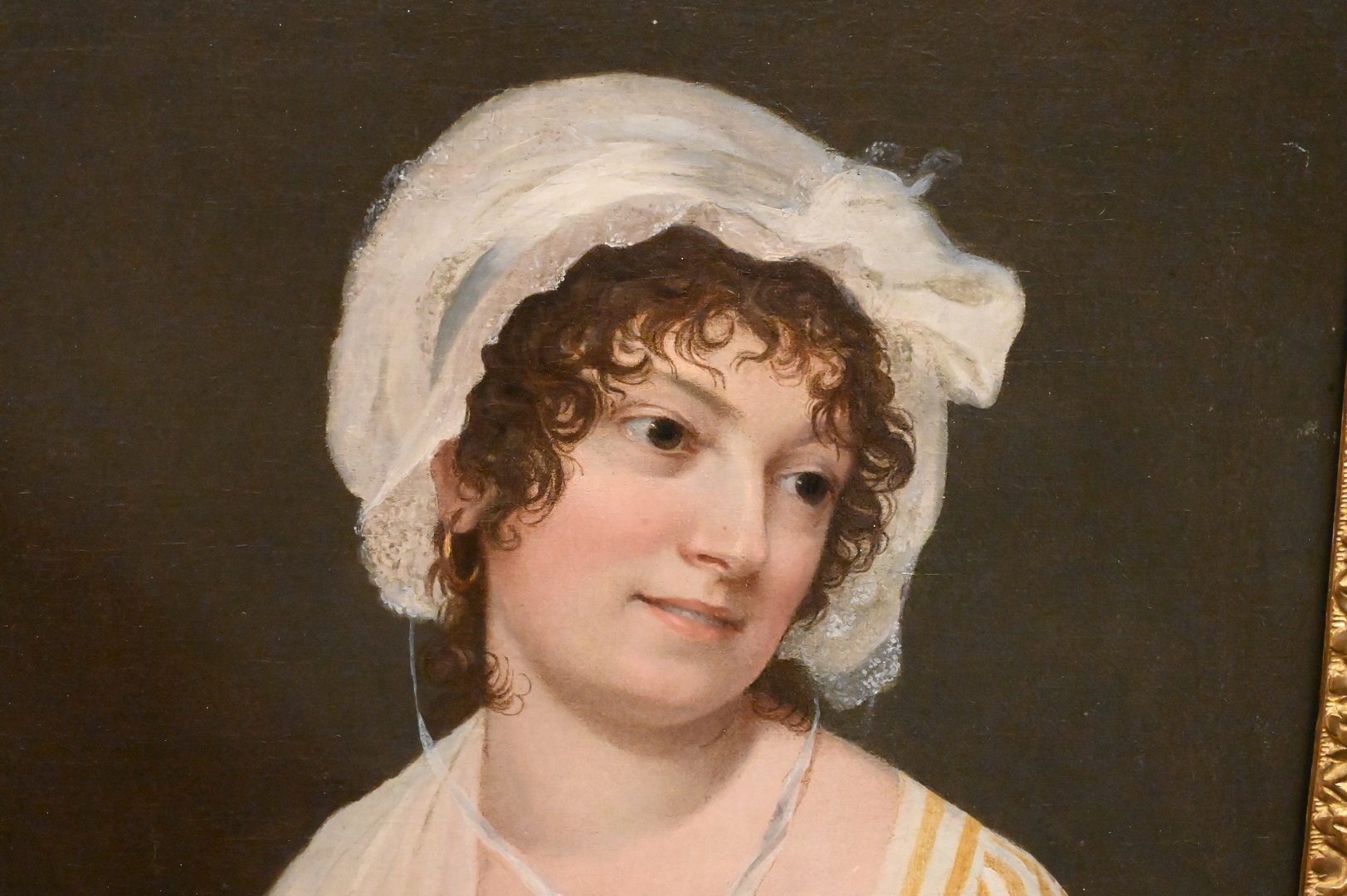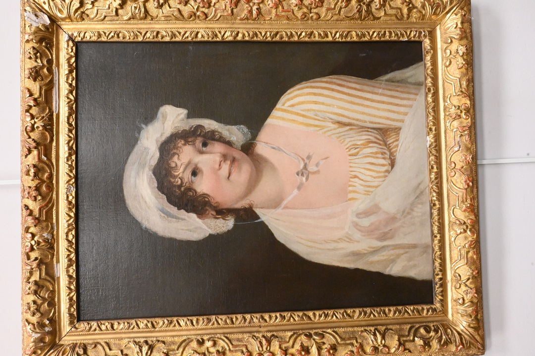 French School Portrait, oil on canvas, young woman wearing a bonnet, in 18th/19th century gilt frame, unsigned, 21 1/2″ x 16 1/2″.