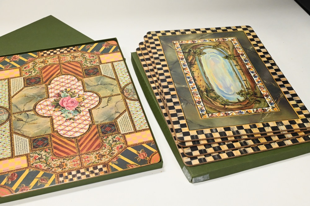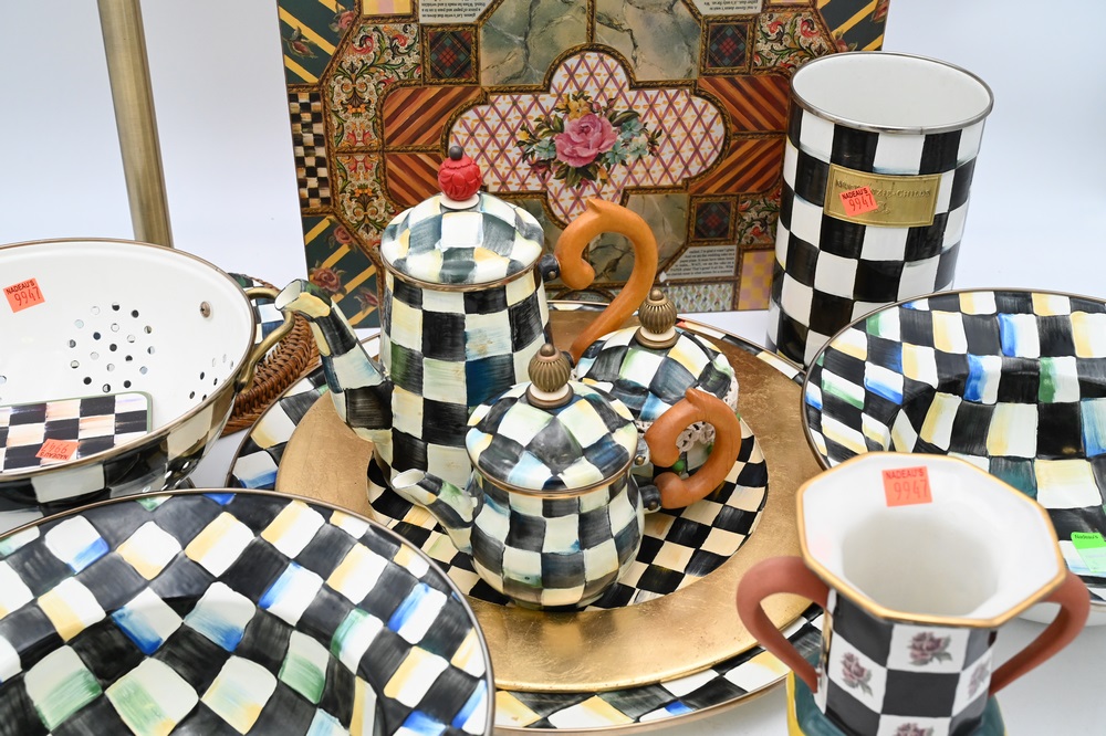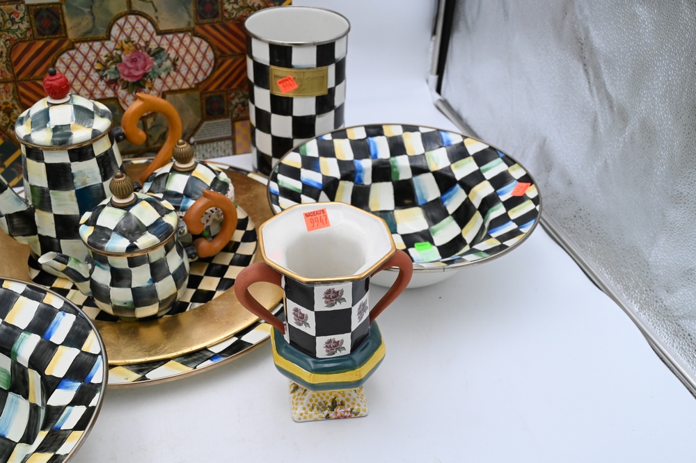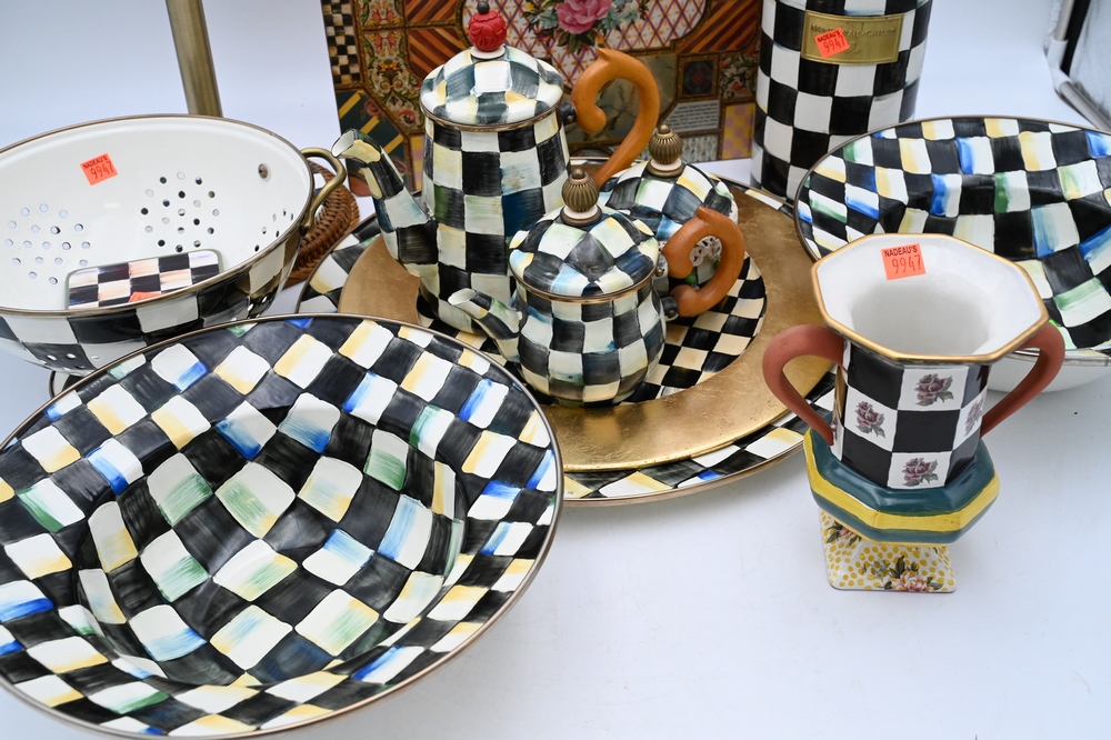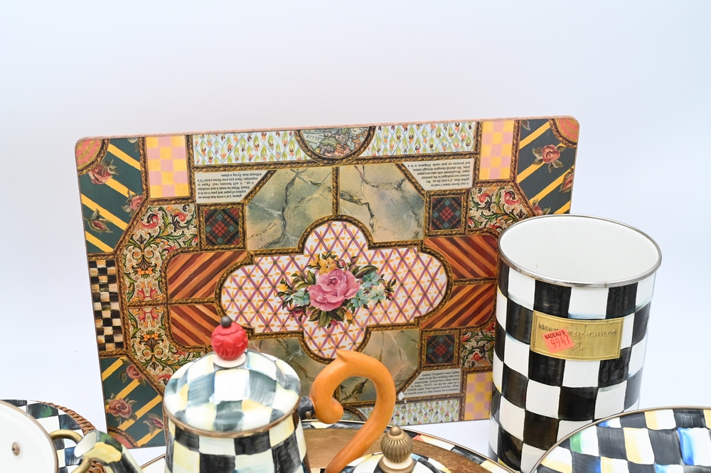 Lot 104: Large Group of Assorted Mackenzie-Childs Kitchenware, to include two enameled painted 1995 serving bowls, country check utensil holder, paper towel holder, large tray, 12 placemats, teaset, etc., diameter of charger 16 inches.