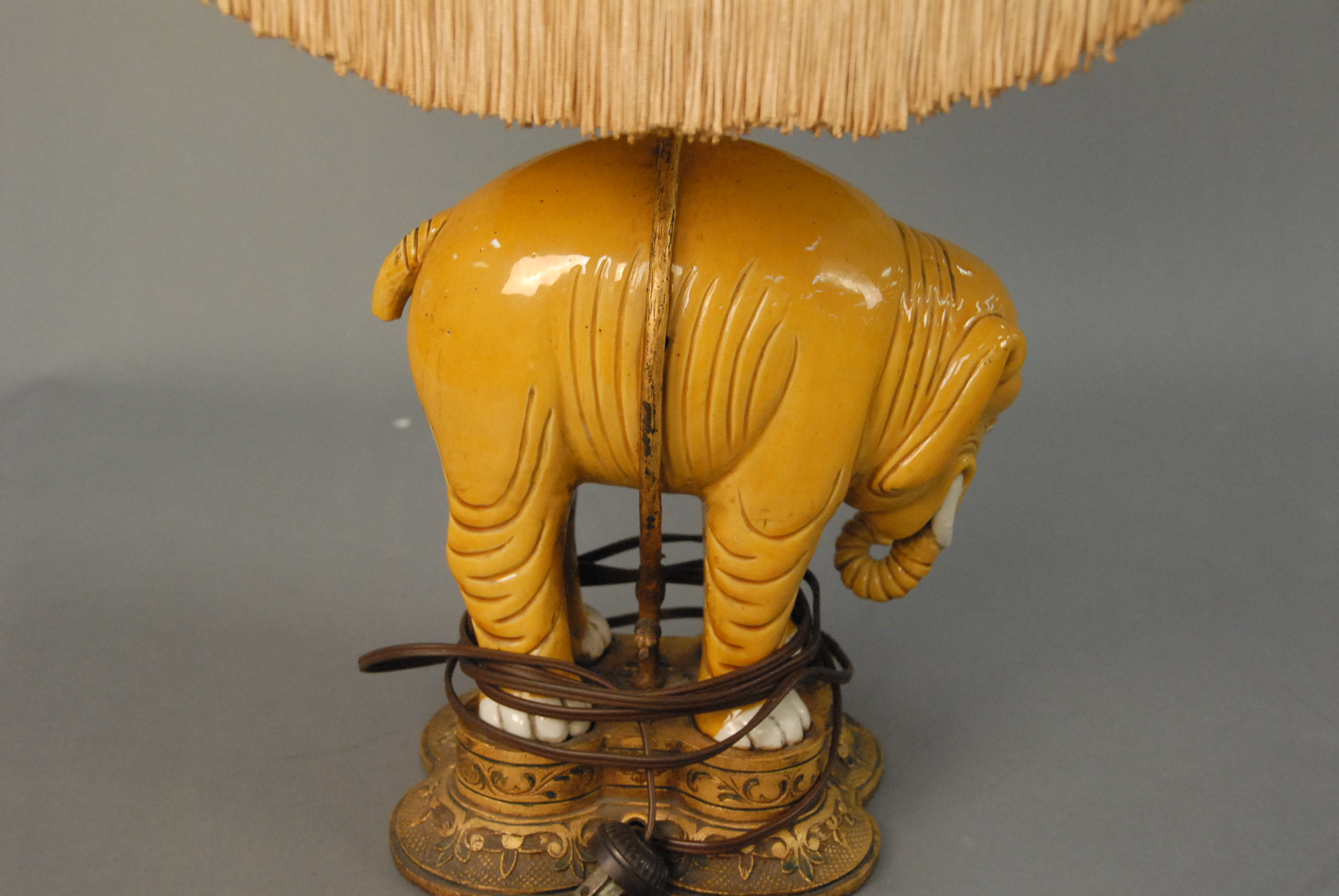 Oriental porcelain elephant figure made into a table lamp on wood base with silk shade.