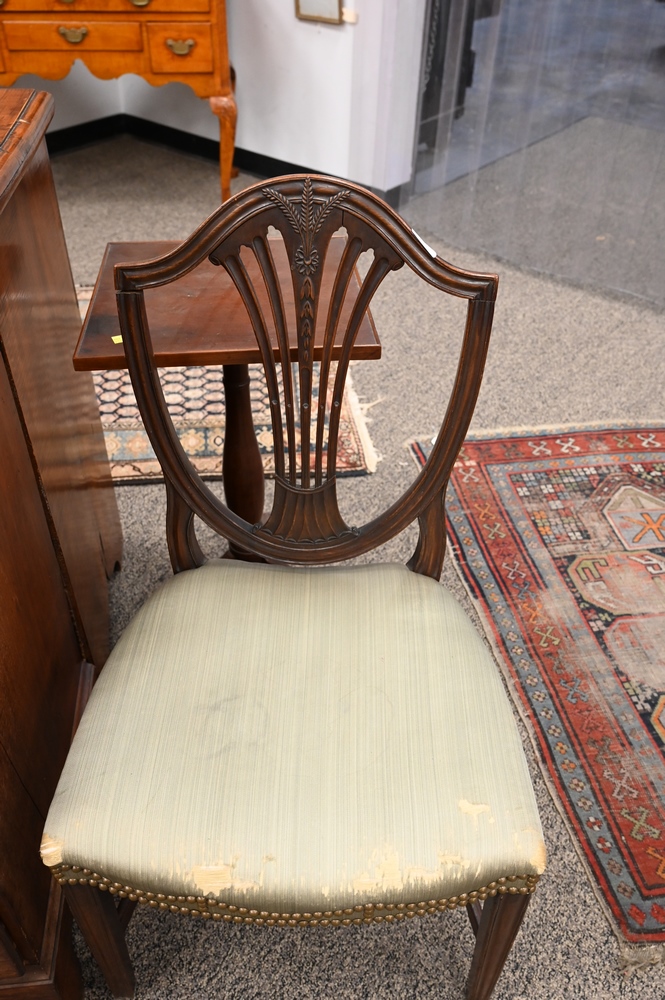 Lot 104: Pair of Hepplewhite Mahogany Side Chairs, mahogany with ash front and side seat rails and beech rear seat rail, each with shield shaped backs with carved wheat, fully upholstered seats, set on square tapered molded legs, circa 1800, American or English, Mabel Brady Garvan Collection., height 37 1/4 inches. Provenance: J. K. Beard, Richmond, Virginia; sold to Francis P. Garvan (1875–1937), New York; gift to Yale University Art Gallery, New Haven, Conn., 1930.