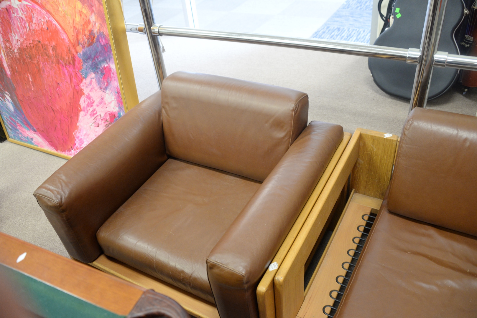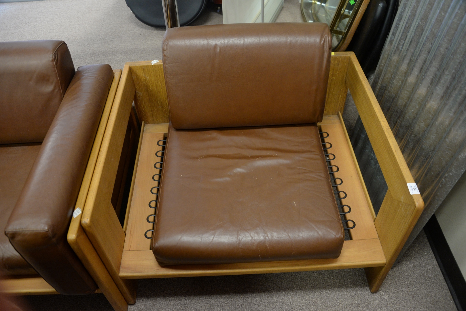 Lot 104: Pair of Tobia Scarpa Lounge Chairs having oak frame with brown vinyl cushions, width 36 inches, depth 31 inches, (one chair missing cushions).