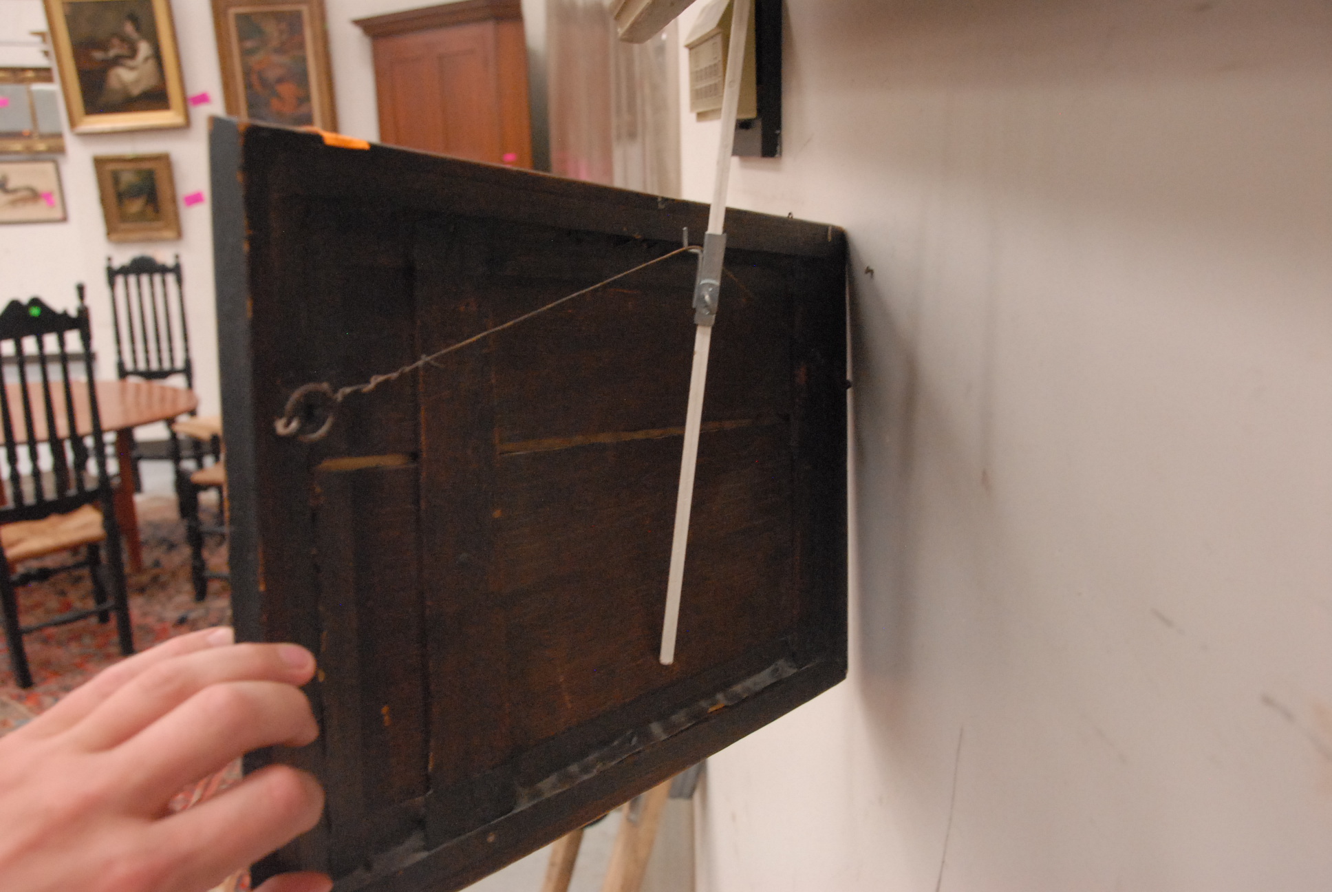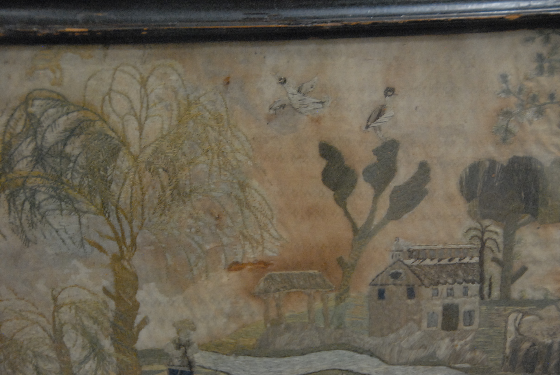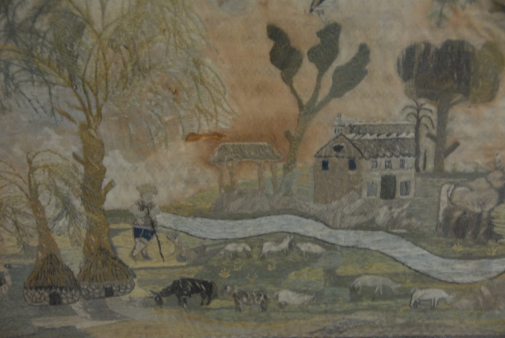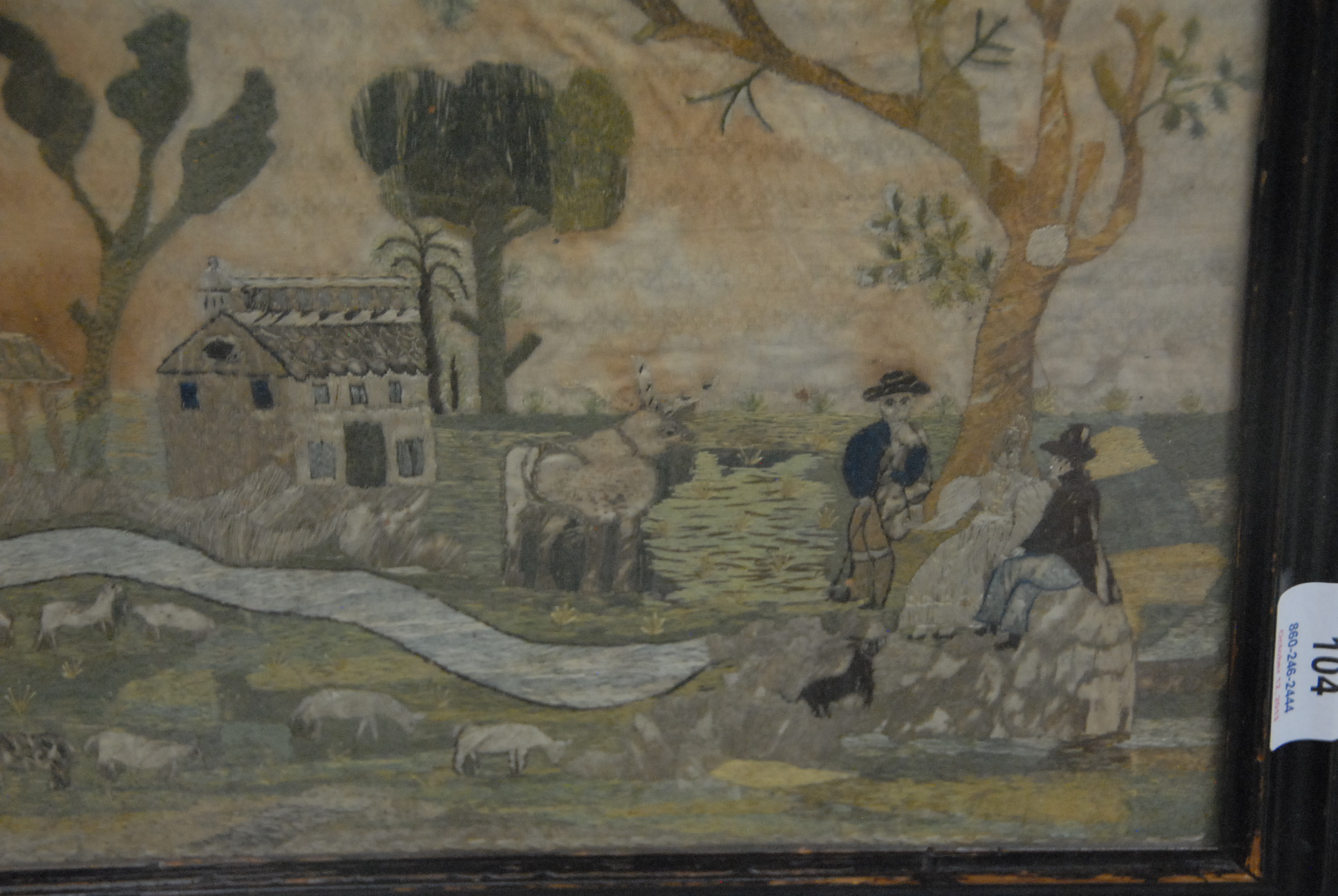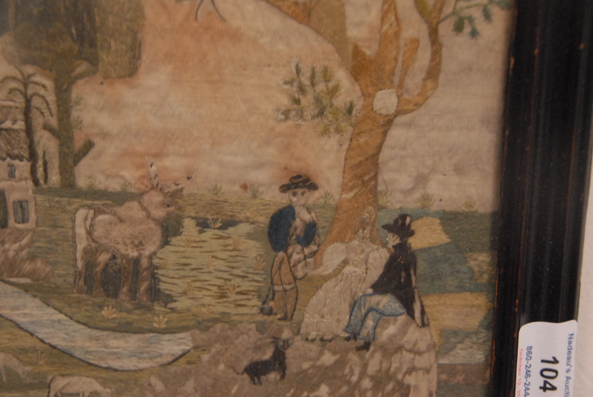 Lot 104: Silk needlework with house, farm animals, shepardess, trees and birds, two men, and one woman. 10 x 16