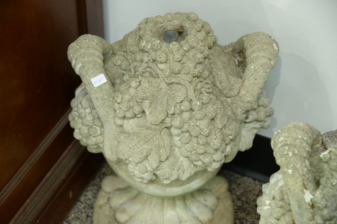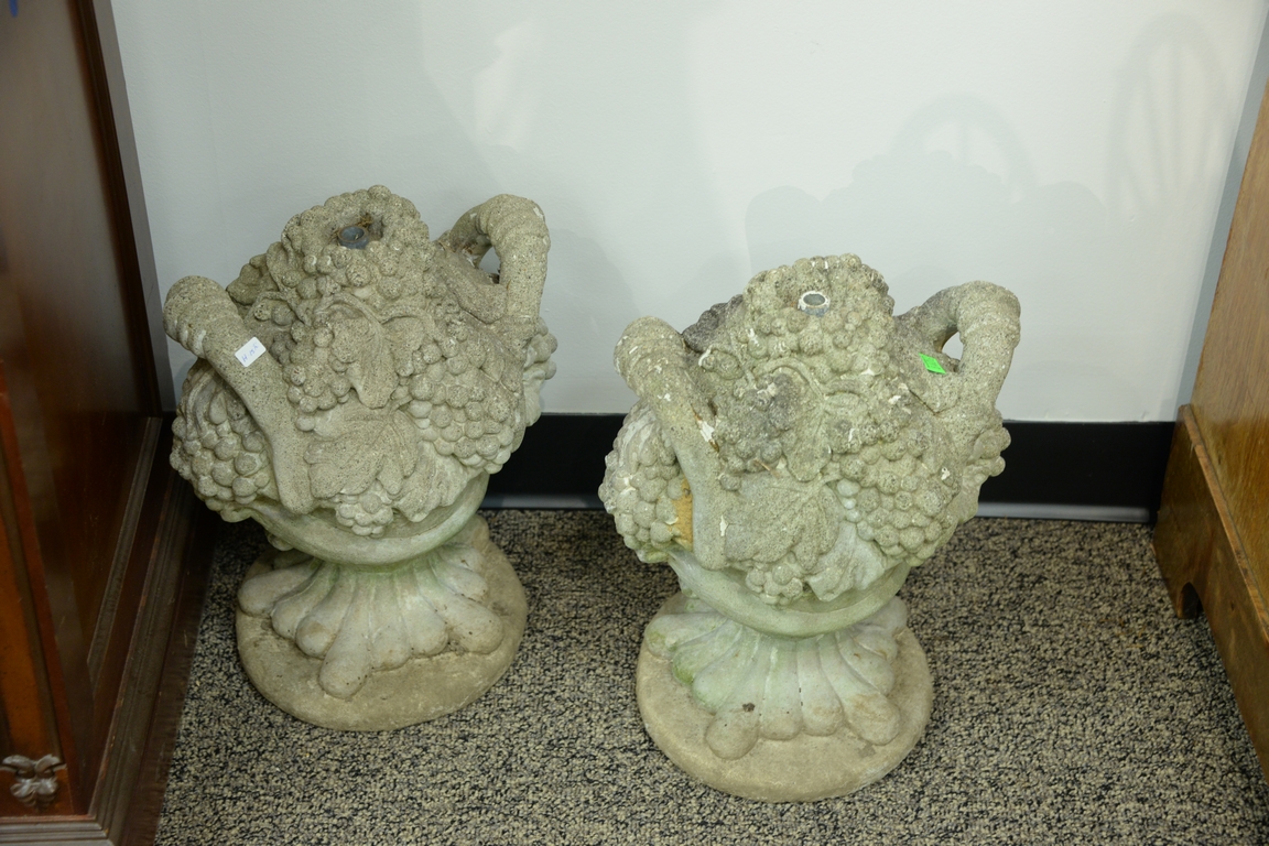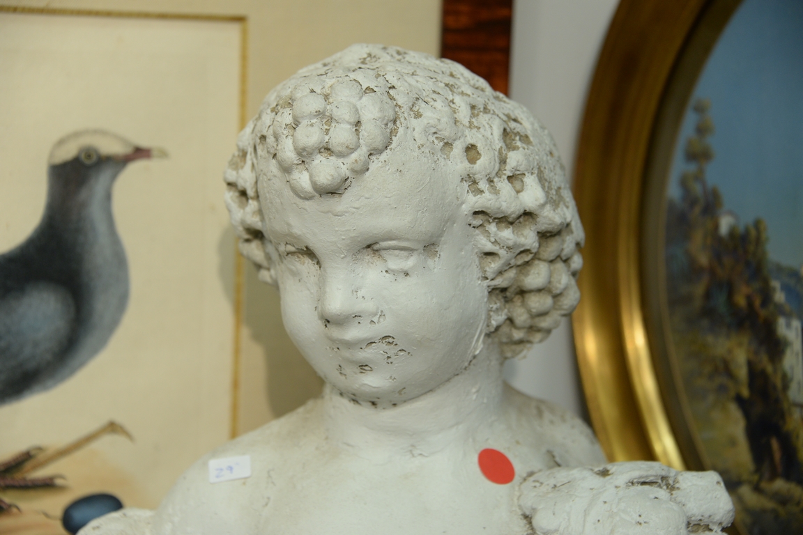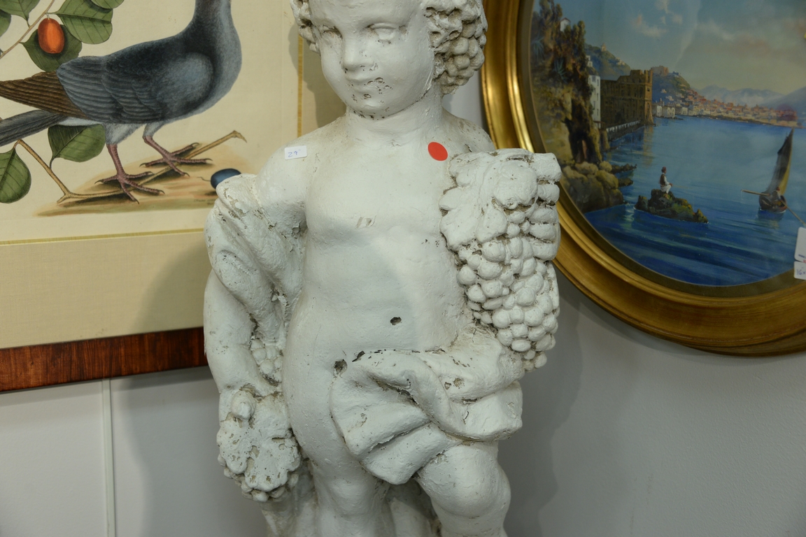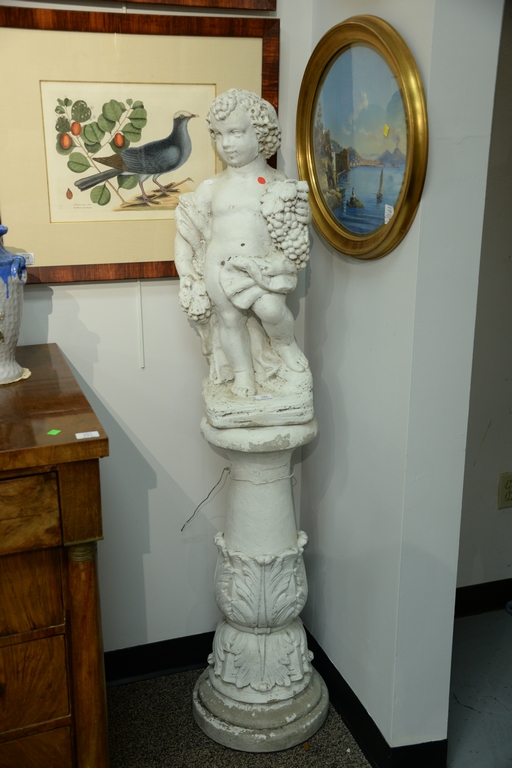 Three piece lot to include cement putti figure on cement pedestal, total ht. 61in. and pair of cement garden fruit baskets ht. 15 1/2in. Provenance: Collection of Anne Jones Willis and the late John Ralph Willis, New Jersey