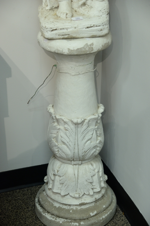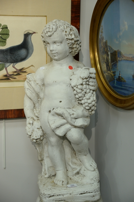 Lot 104: Three piece lot to include cement putti figure on cement pedestal, total ht. 61in. and pair of cement garden fruit baskets ht. 15 1/…