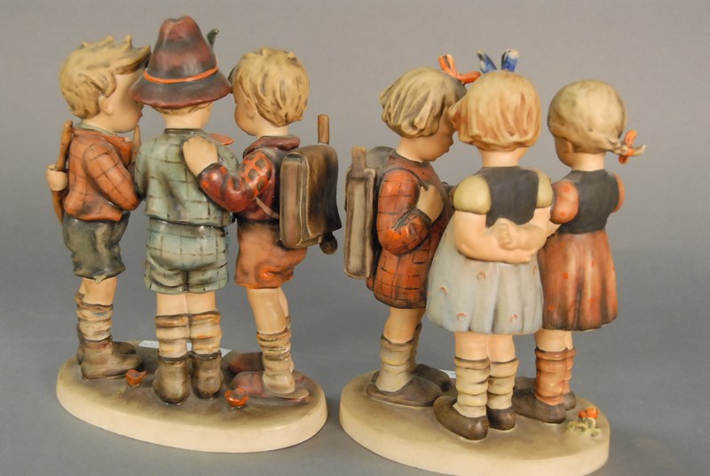 Two Hummels, School Boys and School Girls, each marked with full bee, ht. 9 1/2in.