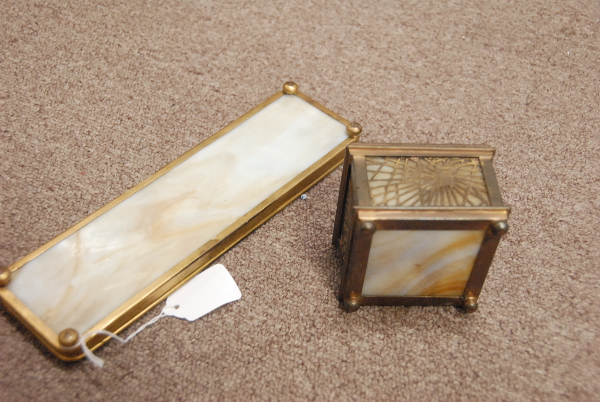 Two piece lot Tiffany Studios slag glass and metal pen tray and ink bottle no liner.
