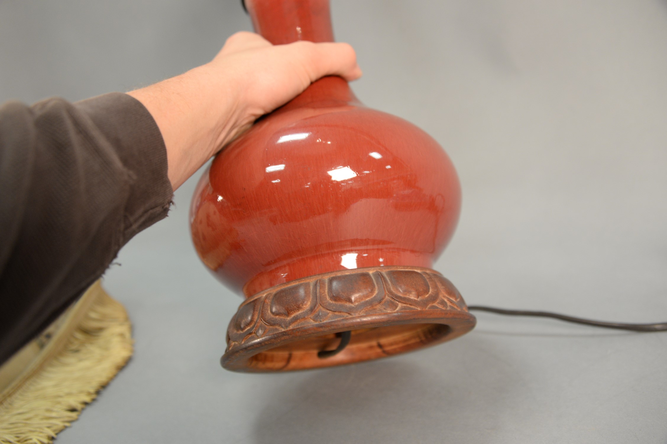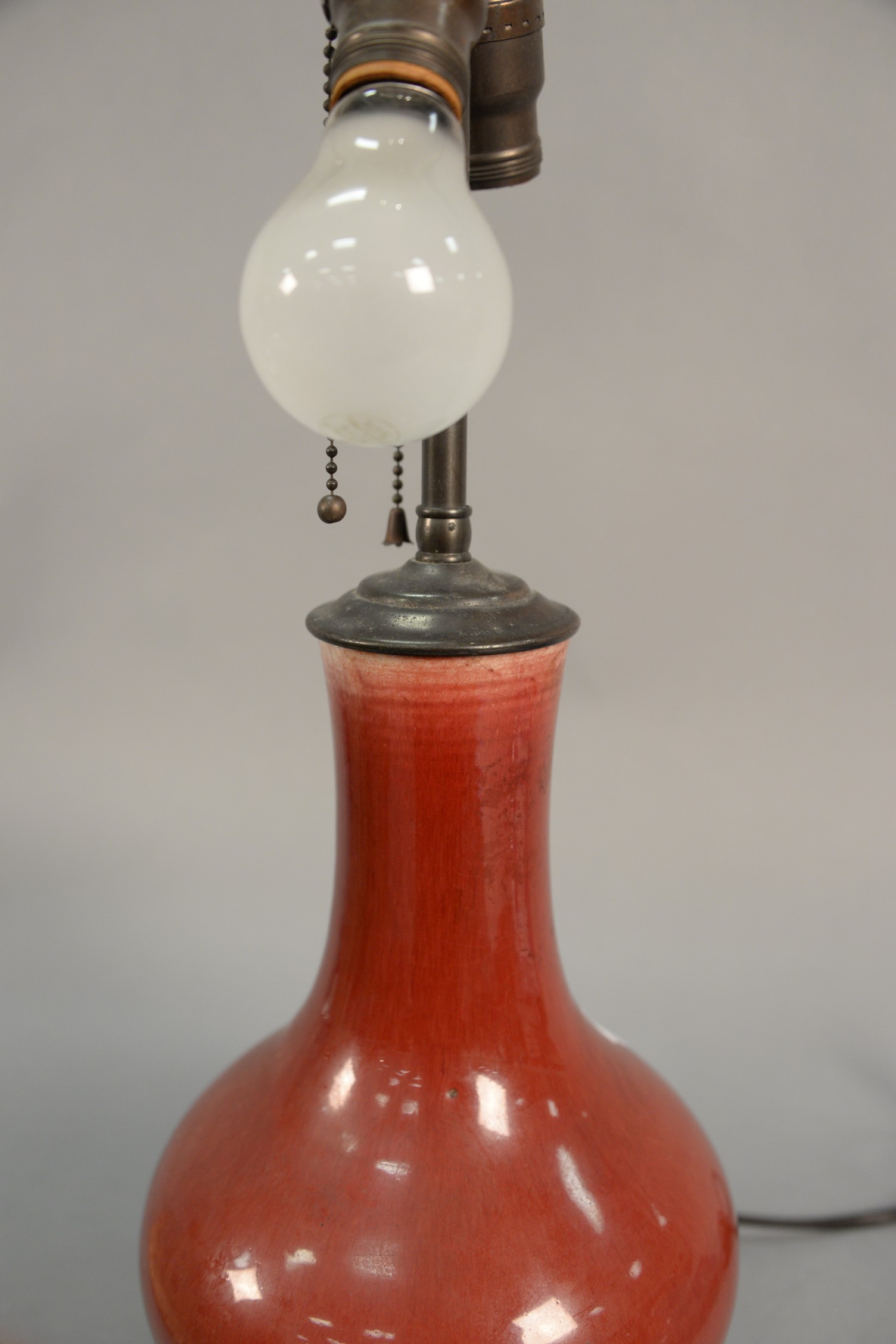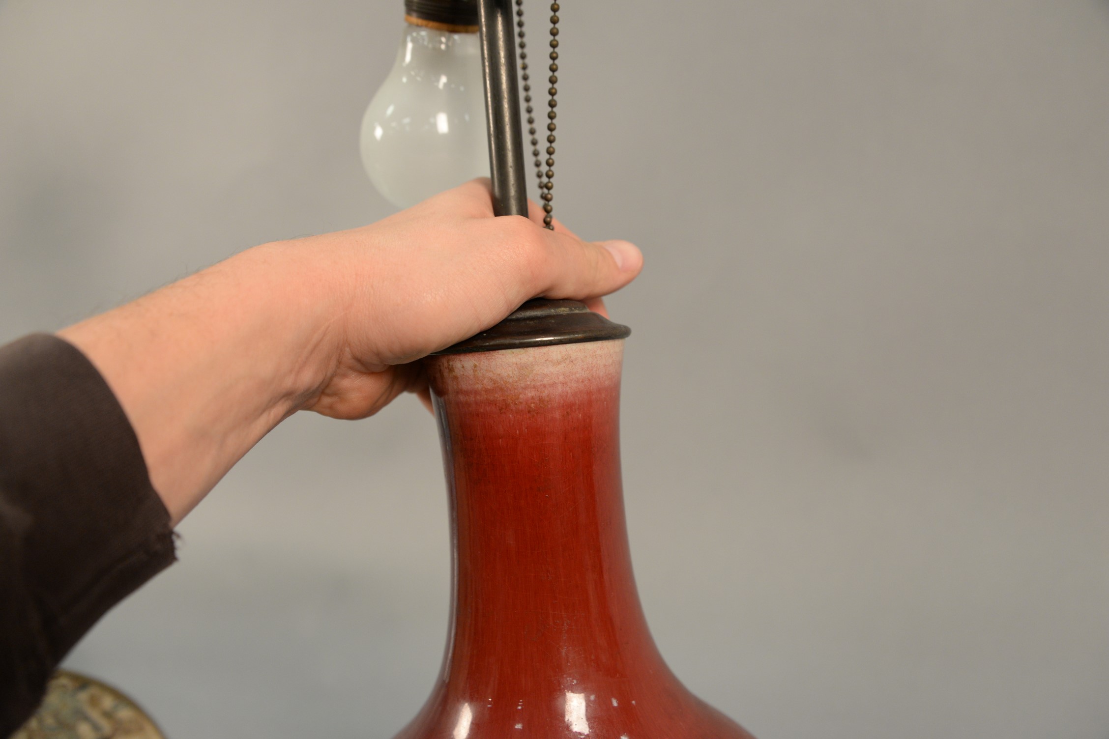 Lot 105: Chinese porcelain Sang de Boeuf globular vase, oxblood glazed with globular body and slender neck, made into a table lamp with silk…