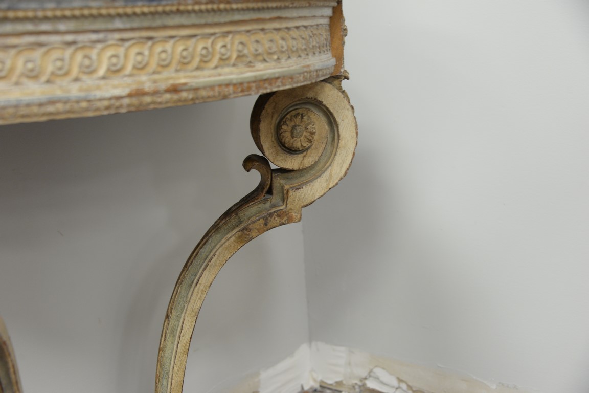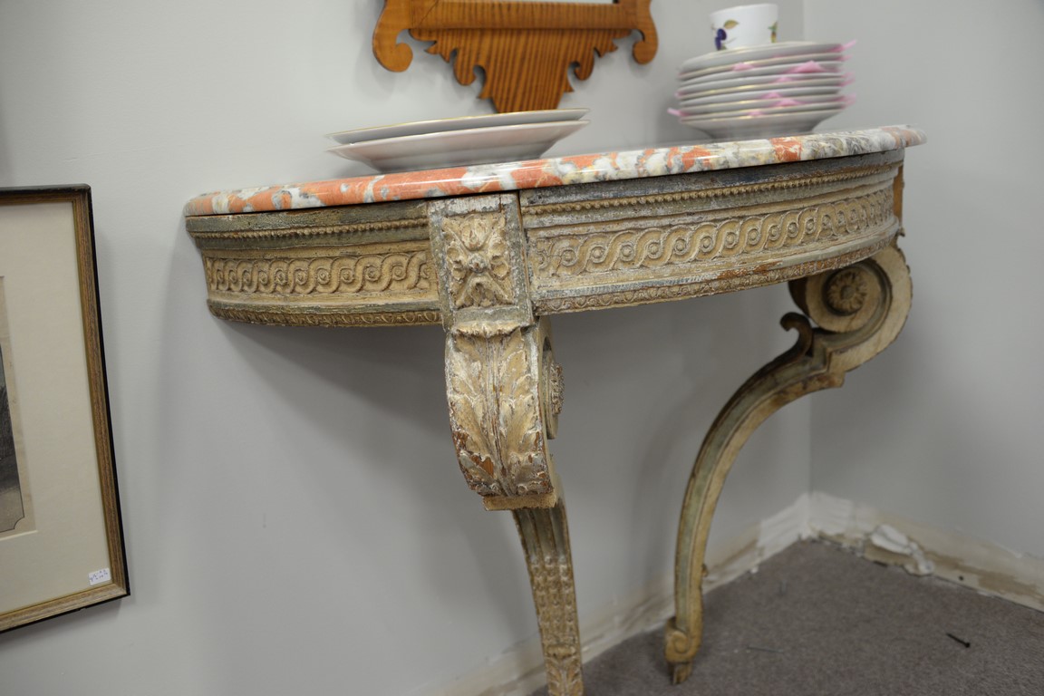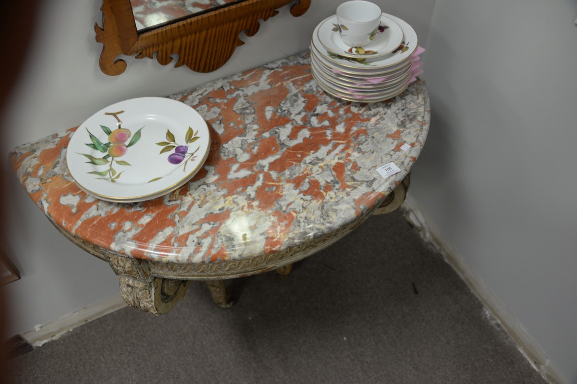 Lot 105: Continental style marble top console table with figured marble. ht. 27 1/2 in. wd. 34 in. dp. 17 in.