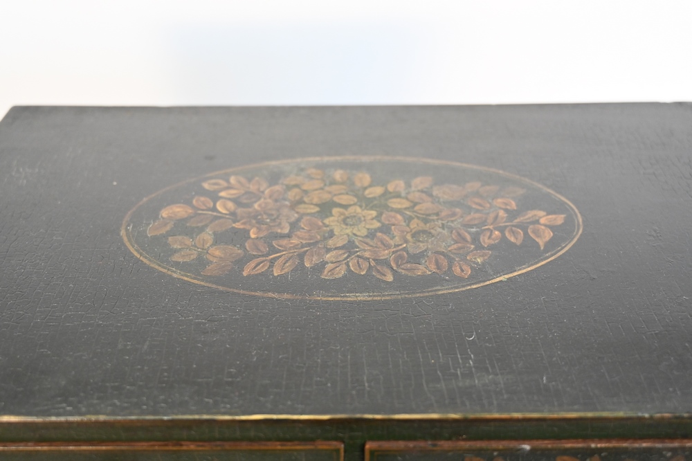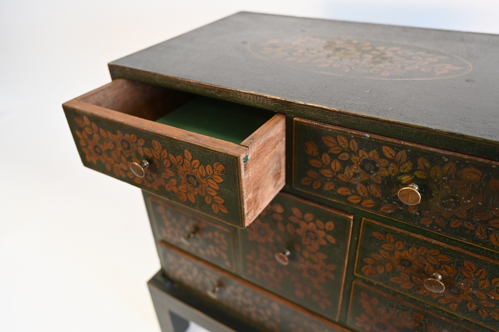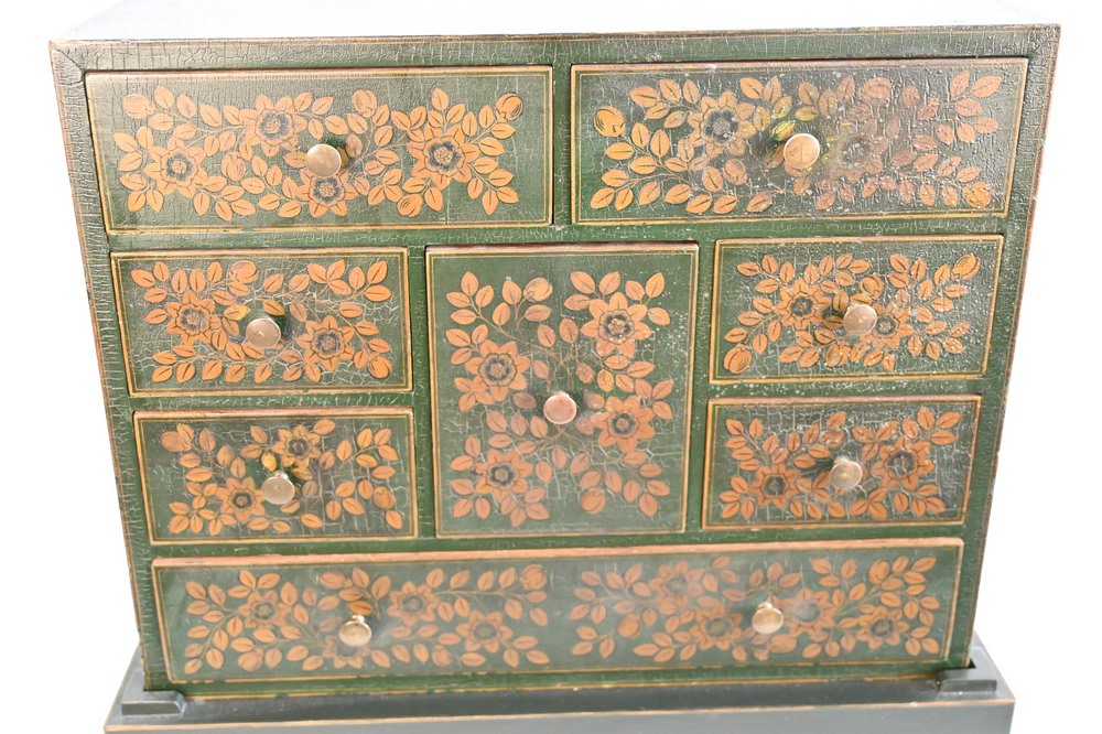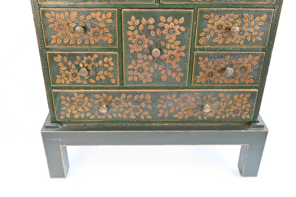 Diminutive Chest Having Eight Drawers, set in fitted base having green paint and painted foliate motif, height 22 inches, width 20 i…