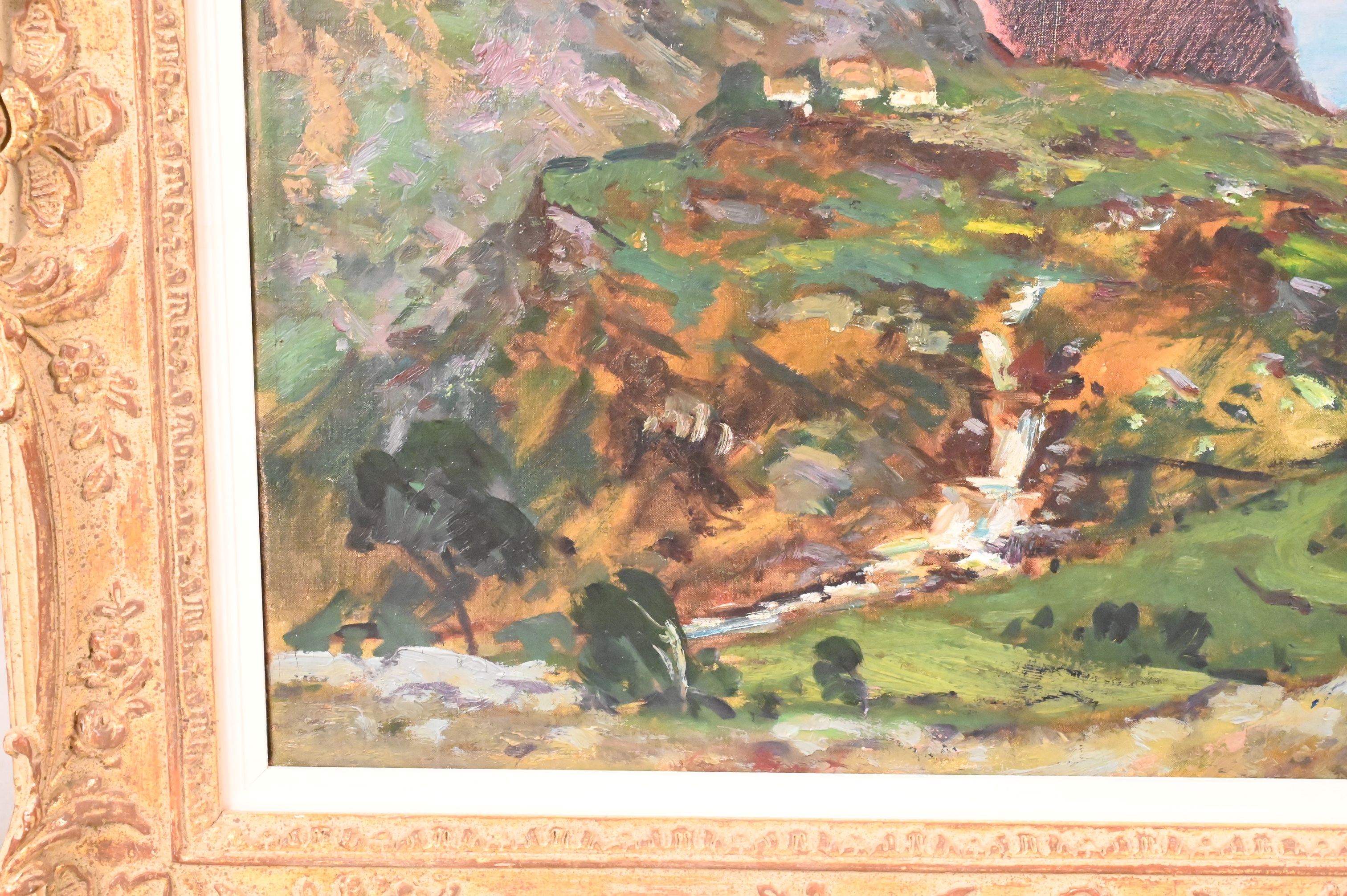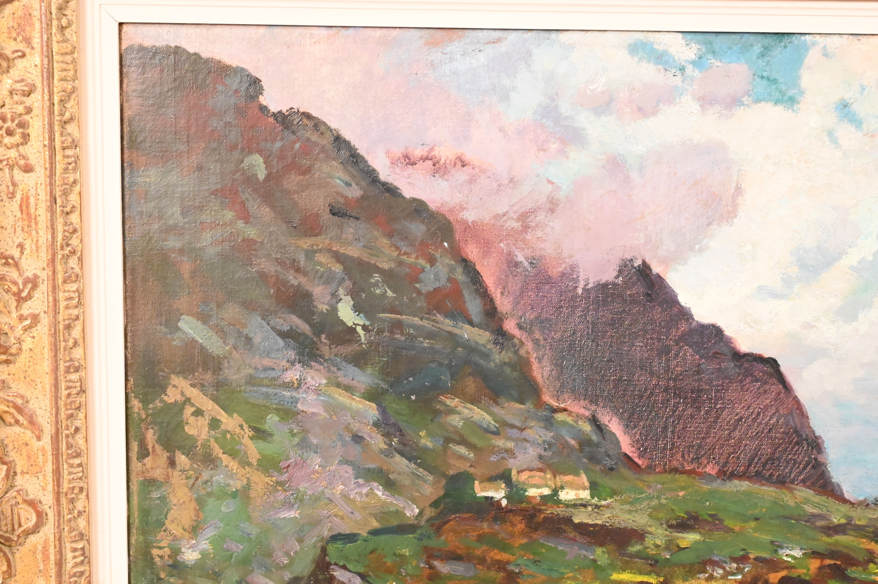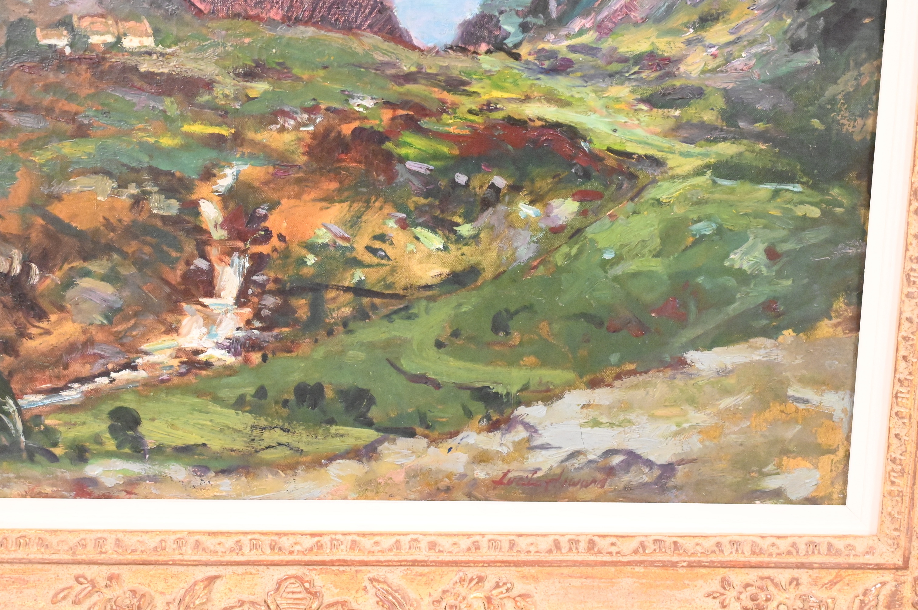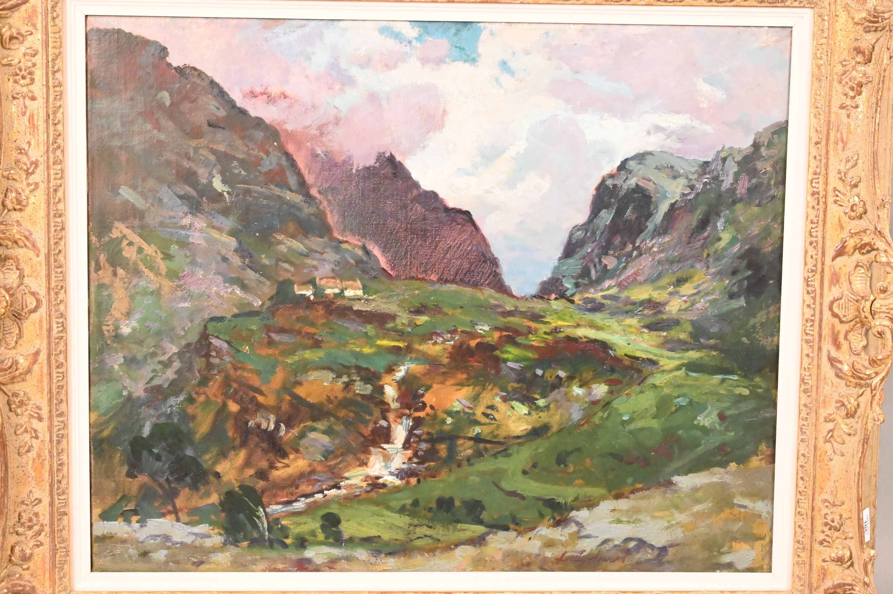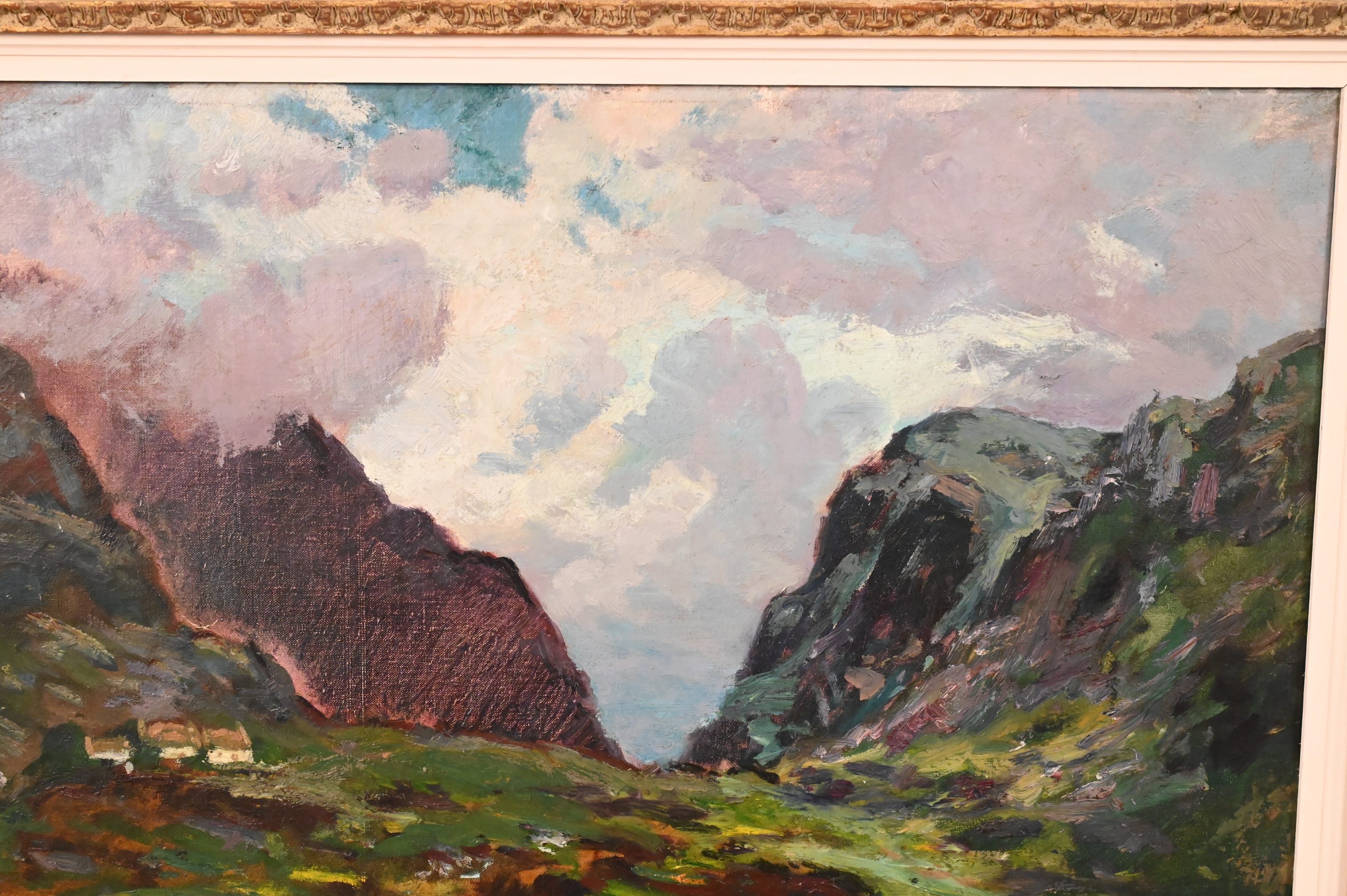 A mountainous landscape depicting the Gap of Dunloe with steep rocky slopes, a verdant valley, and a cascading stream leading the eye into the distance. Executed with bold, painterly brushwork and moderate texture, emphasizing terrain and atmospheric depth.