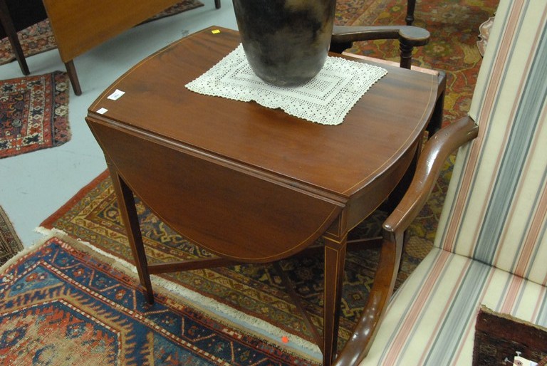 Federal mahogany drop leaf table with line inlay and stretcher base, early 19th century. ht. 27in. top: 30 x 20 Provenance: Estate of Judy McDonough Gengras of Stoner Drive, West Hartford, Connecticut.