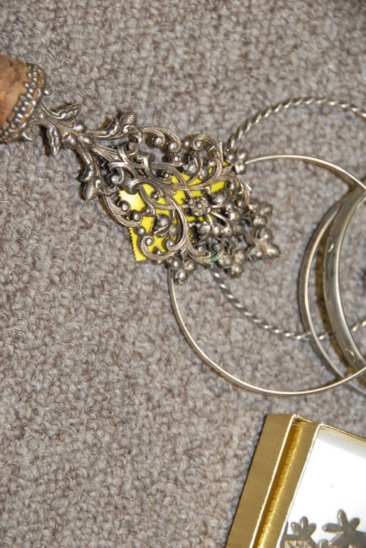 Group lot sterling silver bracelet, large sterling silver necklace, snowflake, silver pin, sterling silver wine cork with fleur de lis style stop.