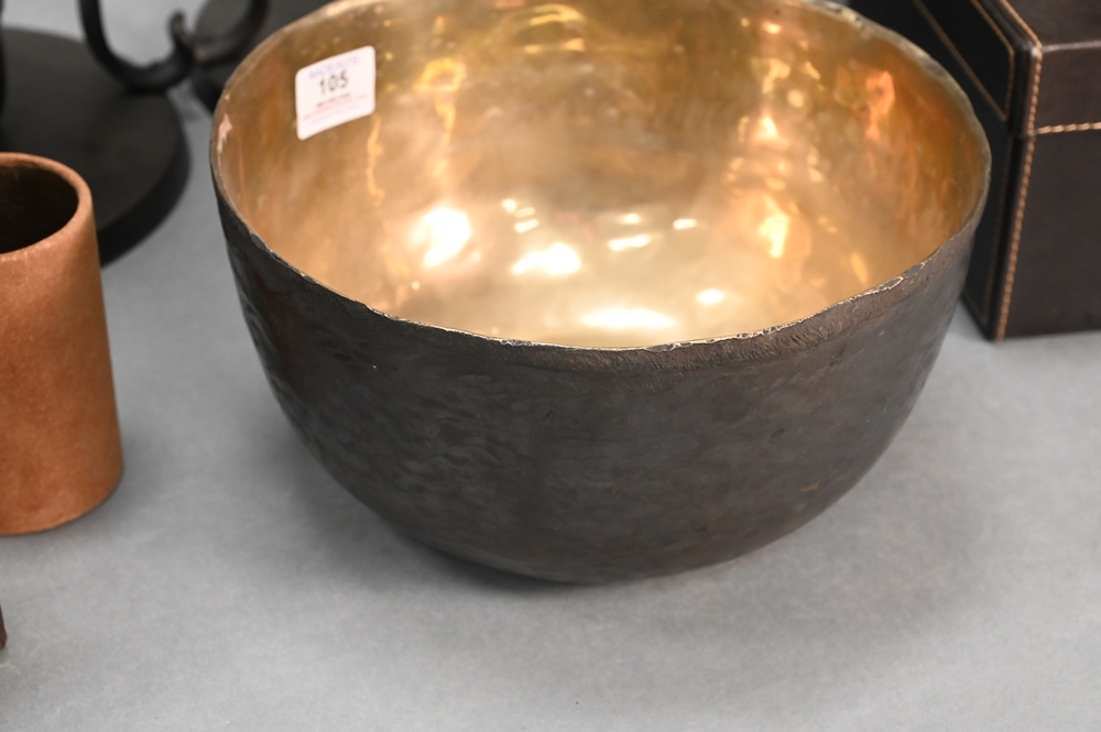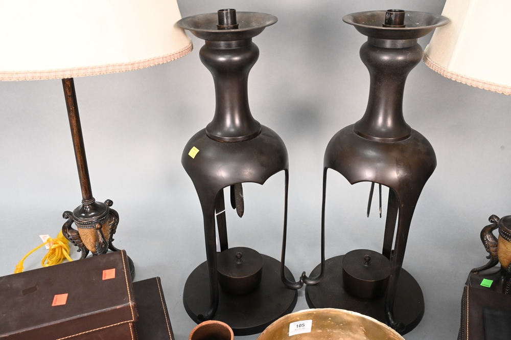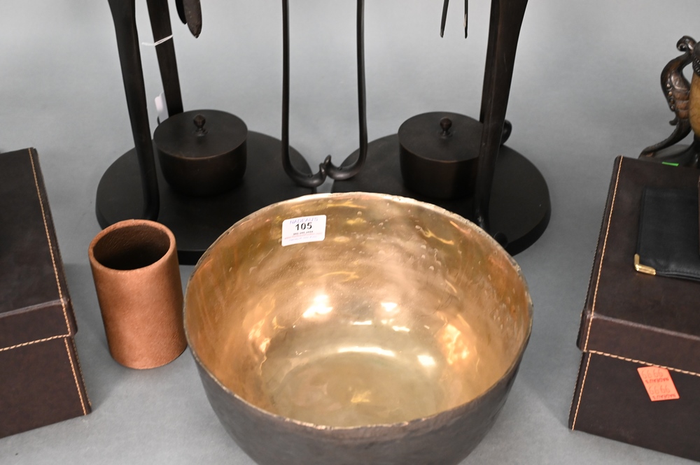 Lot 105: Group of Decorative Items, to include a pair of bronze Japanese style candlesticks, pair of decorative table lamps, a hand hammered silvered bowl, and a group of leather boxes and desktop items from Estate of Peggy and David Rockefeller, height 34 inches.