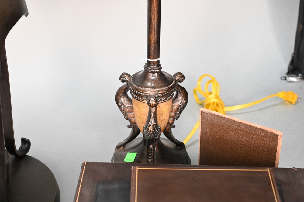 Group of Decorative Items, to include a pair of bronze Japanese style candlesticks, pair of decorative table lamps, a hand hammered silvered bowl, and a group of leather boxes and desktop items from Estate of Peggy and David Rockefeller, height 34 inches.