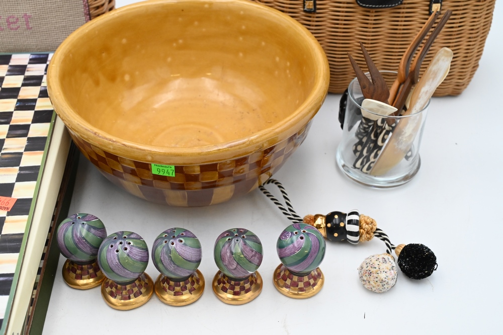 Large Group of Mackenzie-Childs, to include a painted redware bowl, 16 placemats of two different patterns, checkered and “The Restaurant”, 5 salt and peppers, 2 Kate Spade wicker purses, glass with dog, along with misc. items.