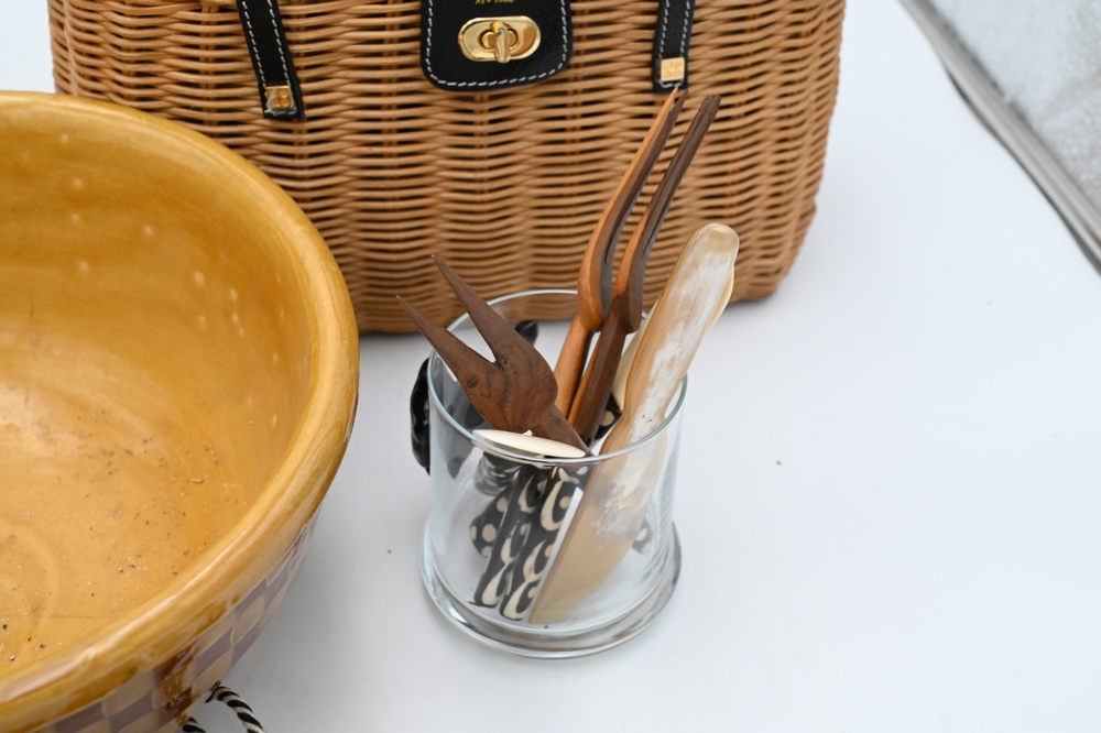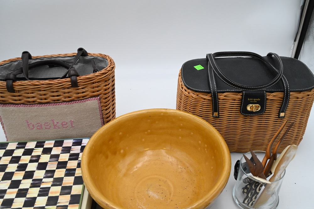Lot 105: Large Group of Mackenzie-Childs, to include a painted redware bowl, 16 placemats of two different patterns, checkered and “The Restaurant”, 5 salt and peppers, 2 Kate Spade wicker purses, glass with dog, along with misc. items.