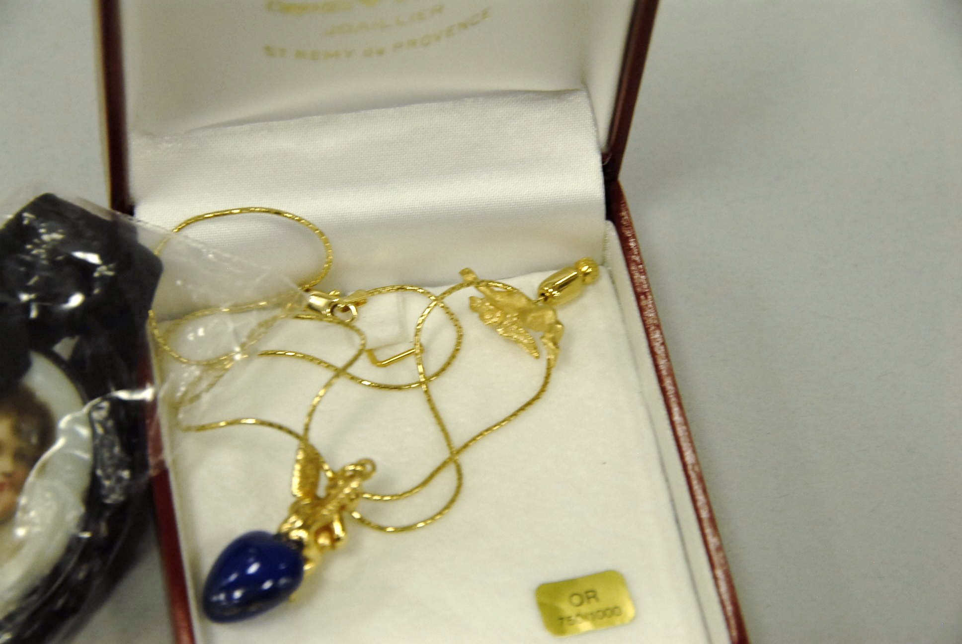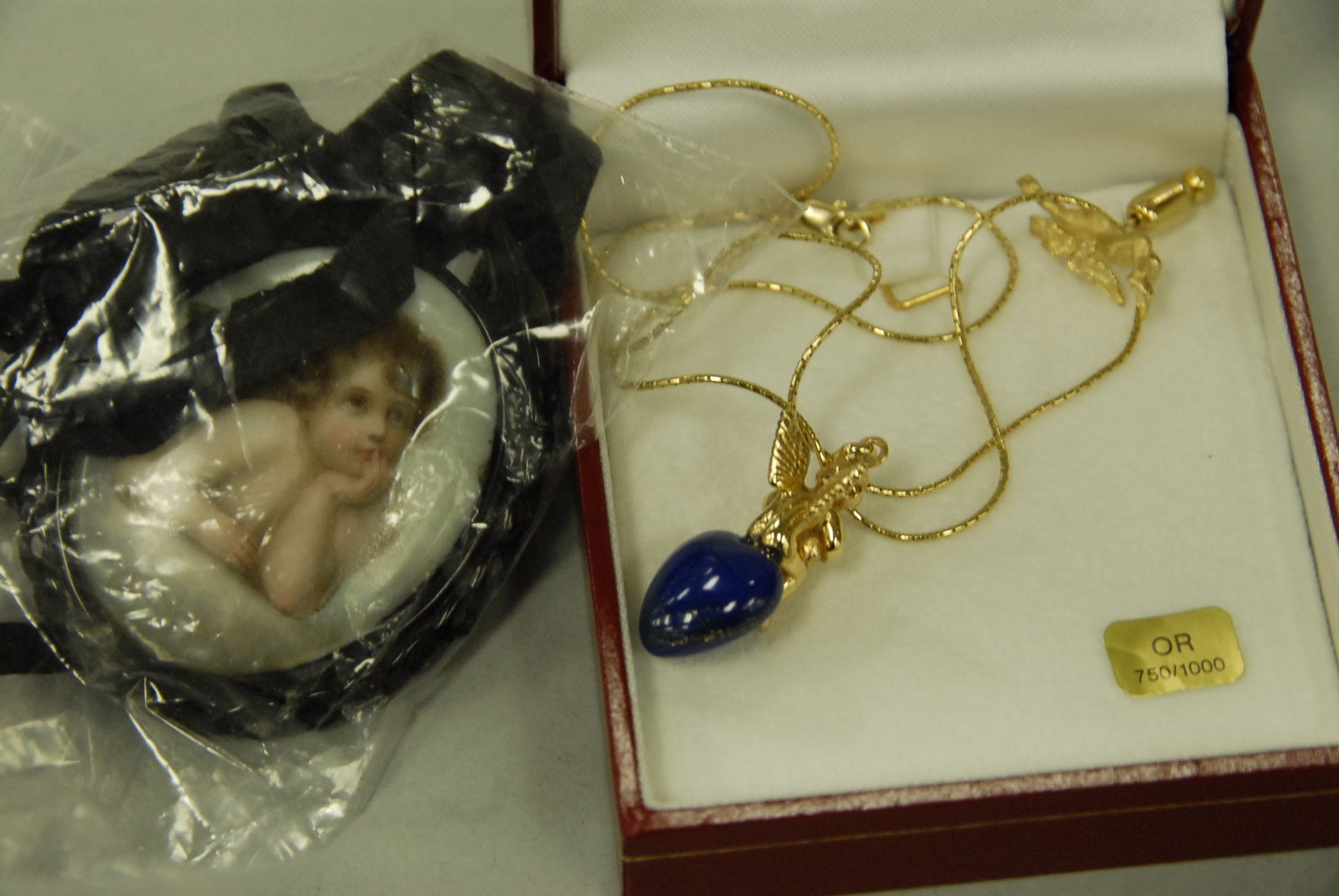 Lot of jewelry: 18k gold cherub pin, 14k gold chain, 18k cherub pendant and a painted oval porcelain of a putti