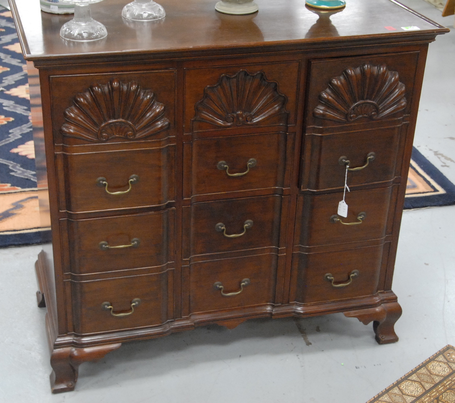 Lot 105: Margolis custom mahogany chest having dished rectangular top, front with triple shell carving and four short center drawers flanked …