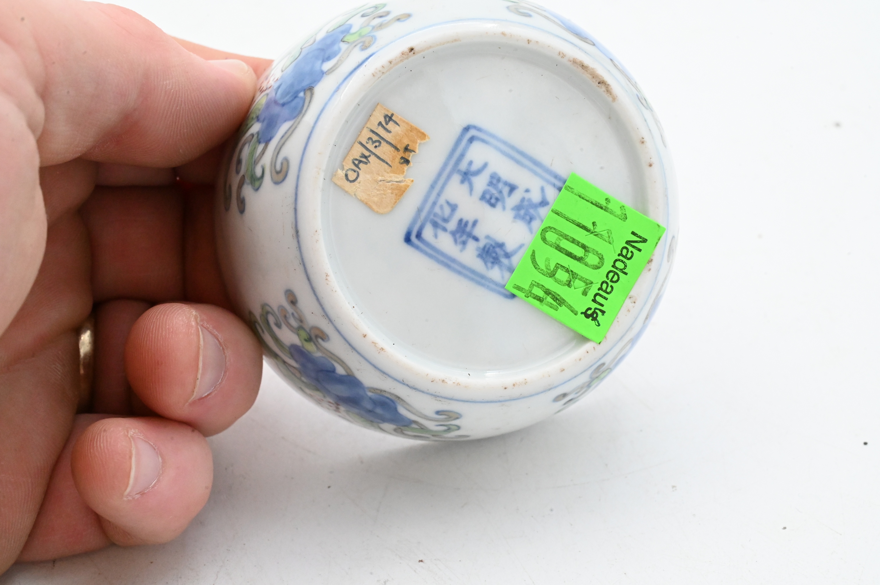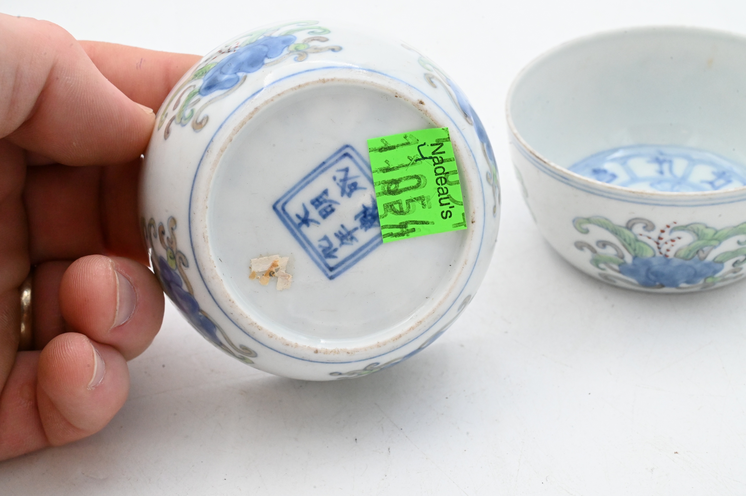 A pair of small Chinese porcelain cups, each decorated with underglaze blue and overglaze famille verte-style floral designs, the interiors with stylized medallions. Bases with underglaze blue marks. Presented in a fitted cloth box.