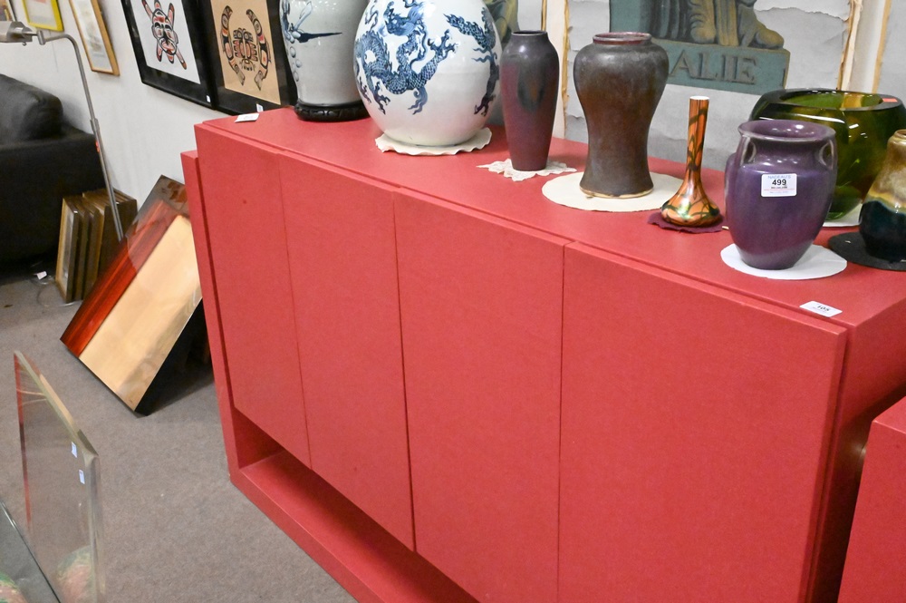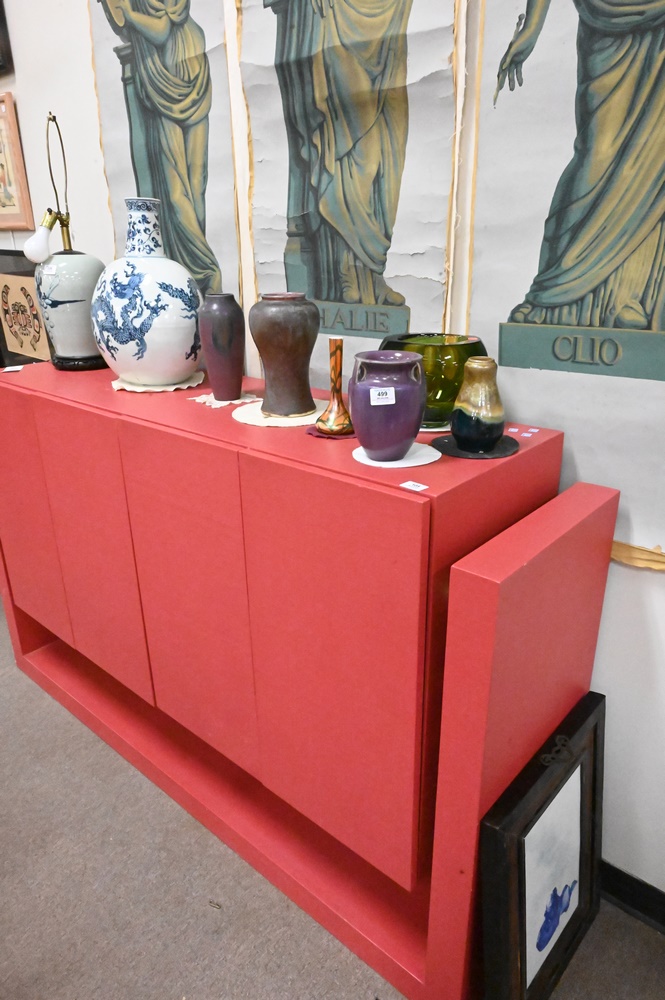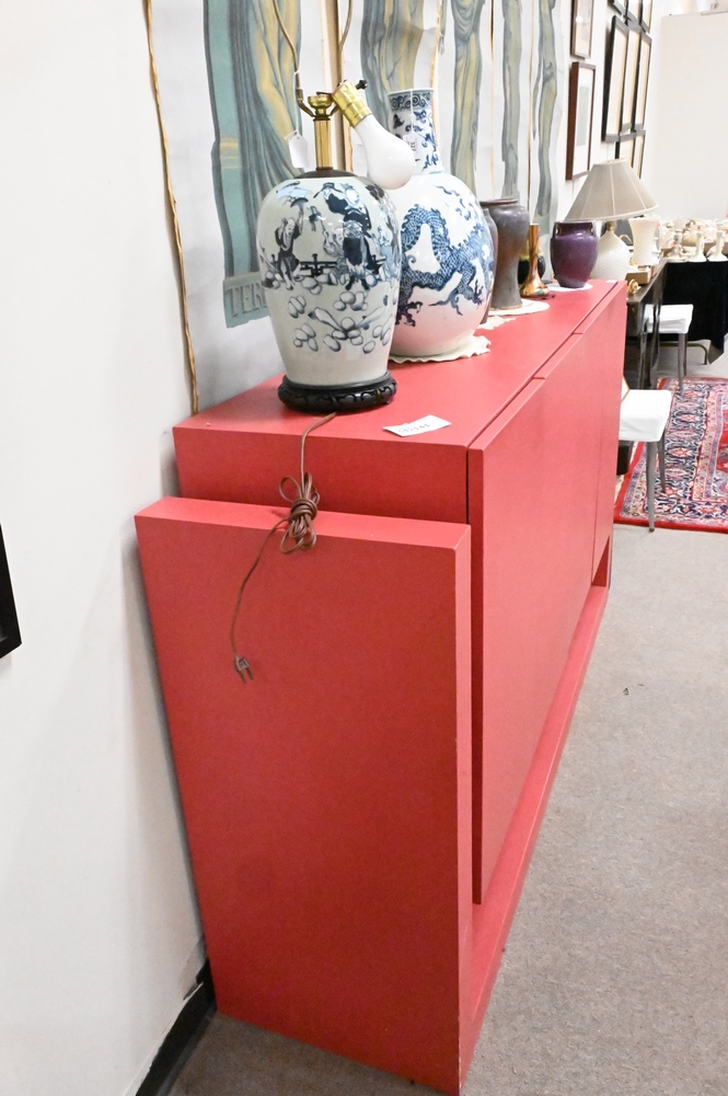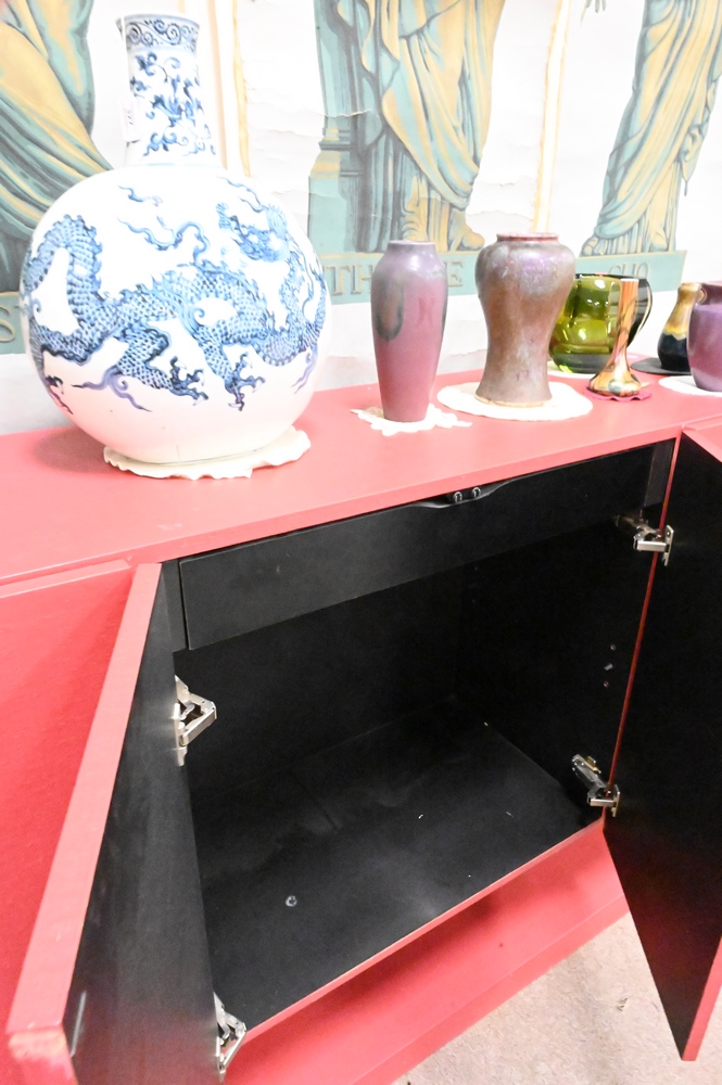 Lot 105: Post Modern Sideboard, having four doors opening to shelving, height 42 inches, width 72 1/4 inches, depth 18 1/4″.