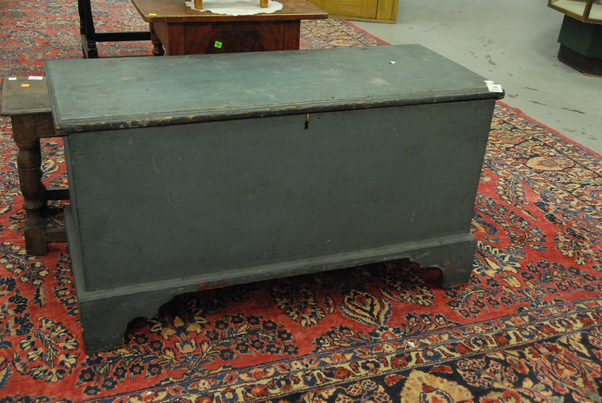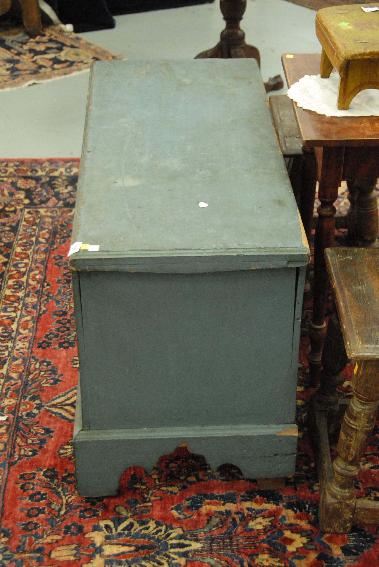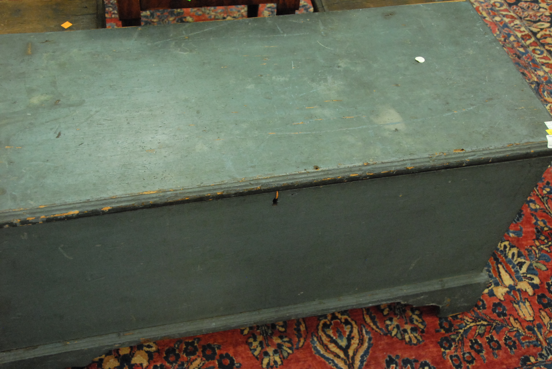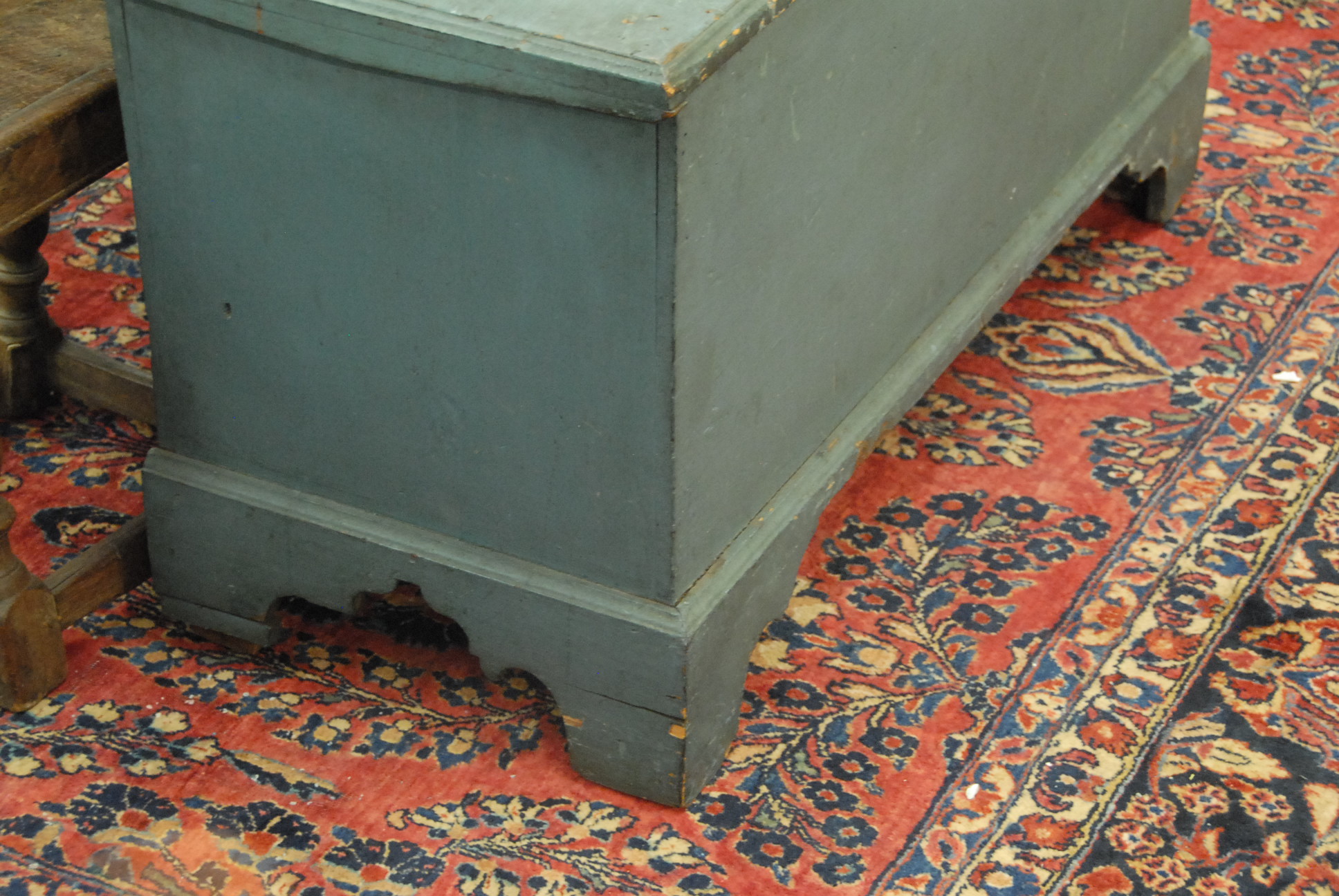 Lot 105: Primitive blanket chest having molded top and base with bracket feet in old blue paint with original snipe hinges. ht. 24in. wd. 43 1/2in. dp. 18in. Provenance: Being sold for Windsor Historical Society