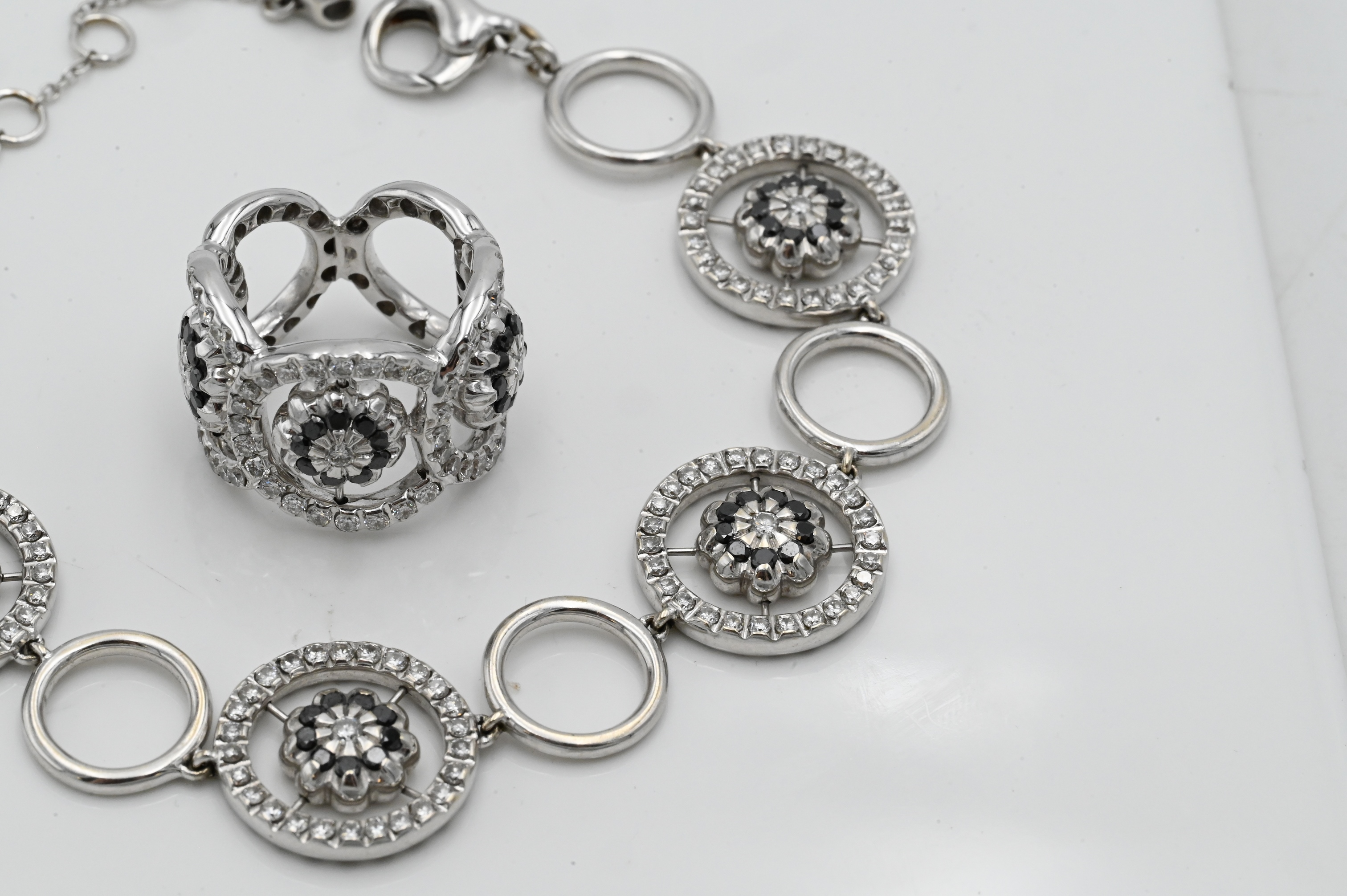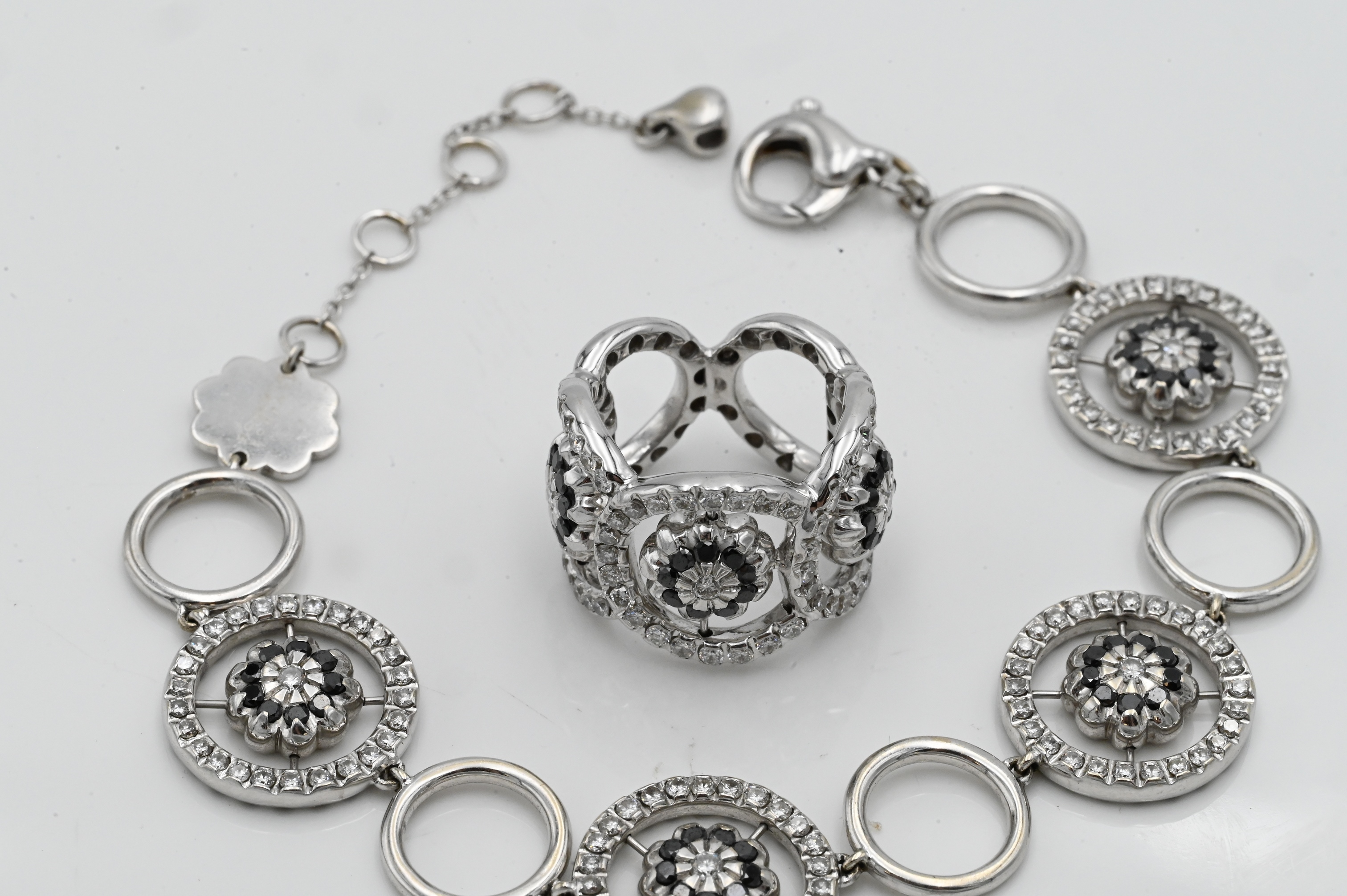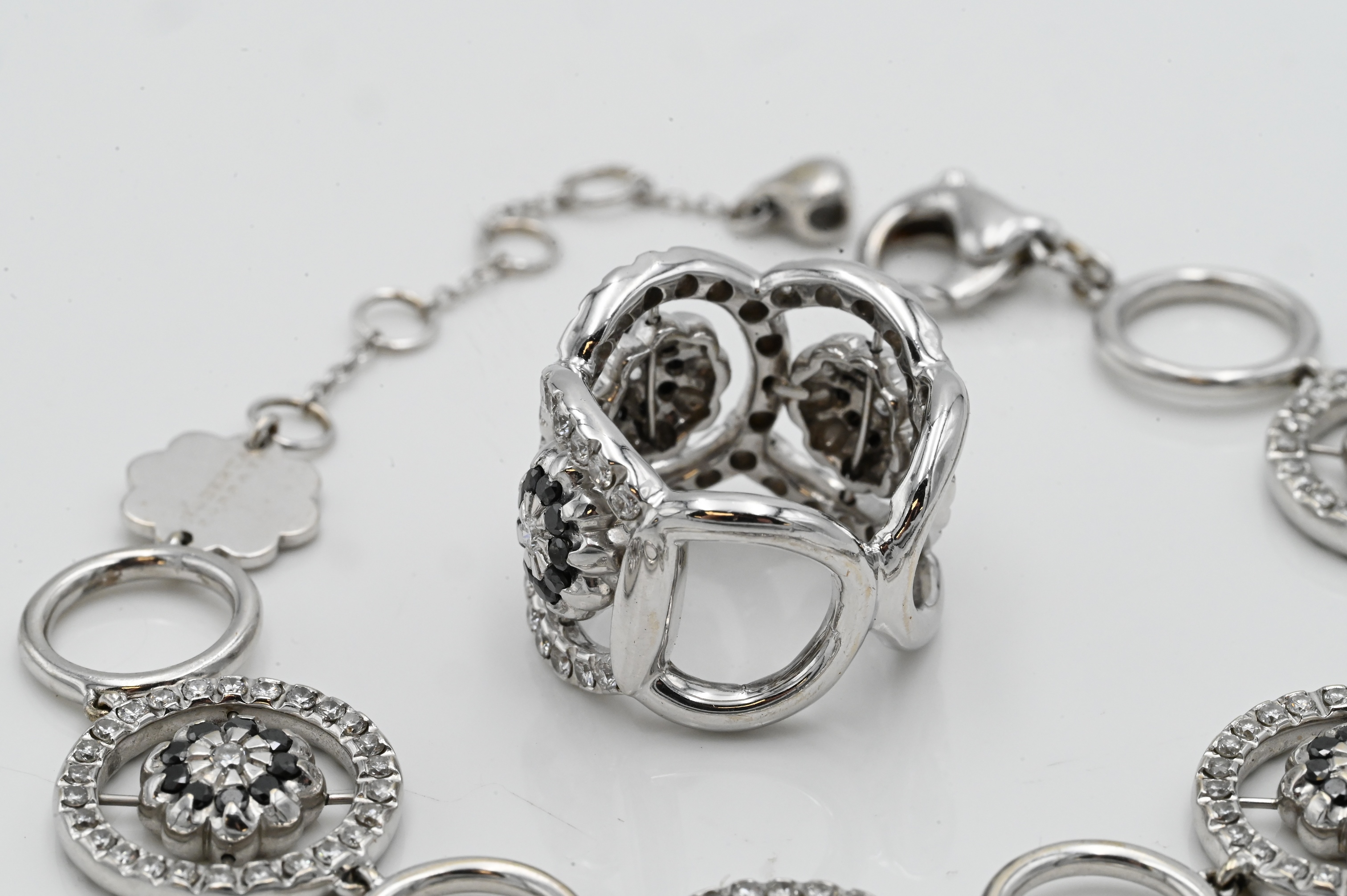 to include an 18 karat white gold bracelet and ring, each having diamond centers, surrounded with blue sapphires, along with circular diamond surrounds,ring size 6 1/2, length 8 1/2 inches, 48 grams