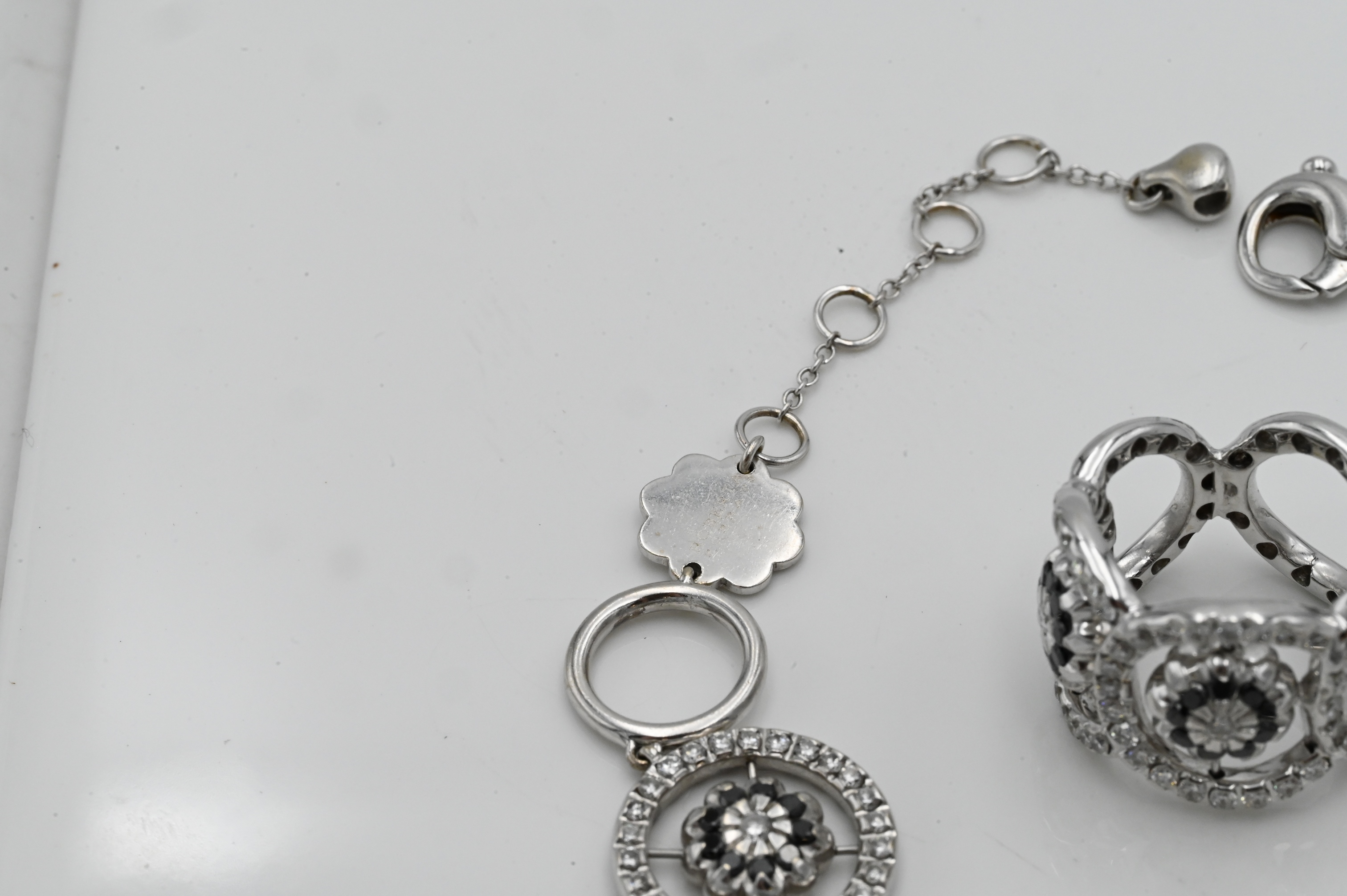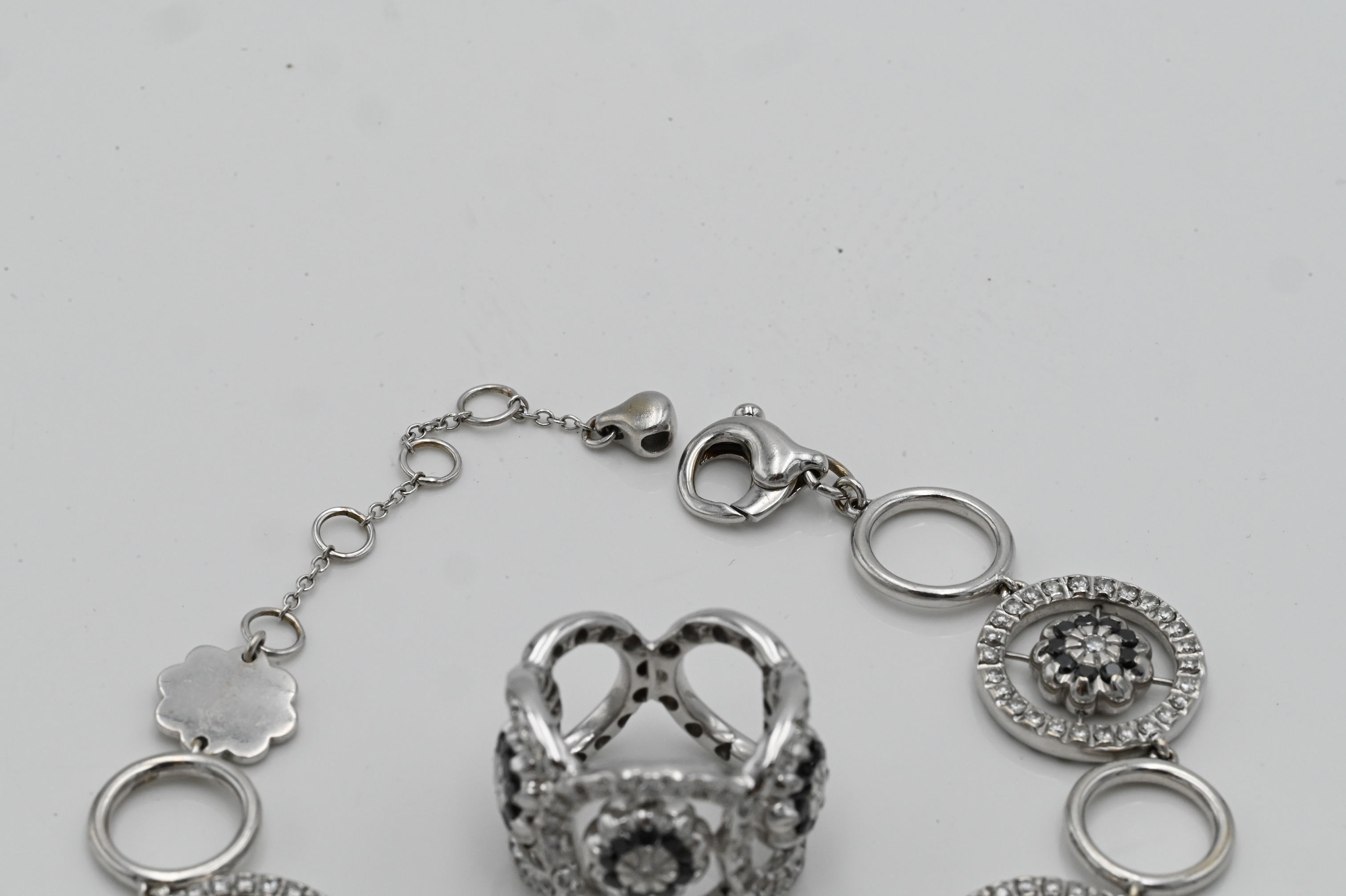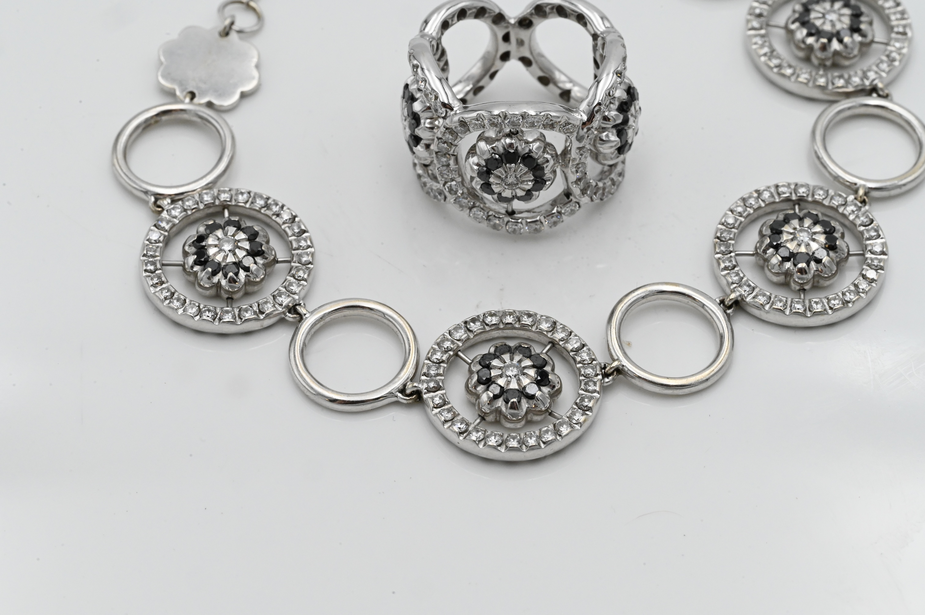 to include an 18 karat white gold bracelet and ring, each having diamond centers, surrounded with blue sapphires, along with circular diamond surrounds,ring size 6 1/2, length 8 1/2 inches, 48 grams