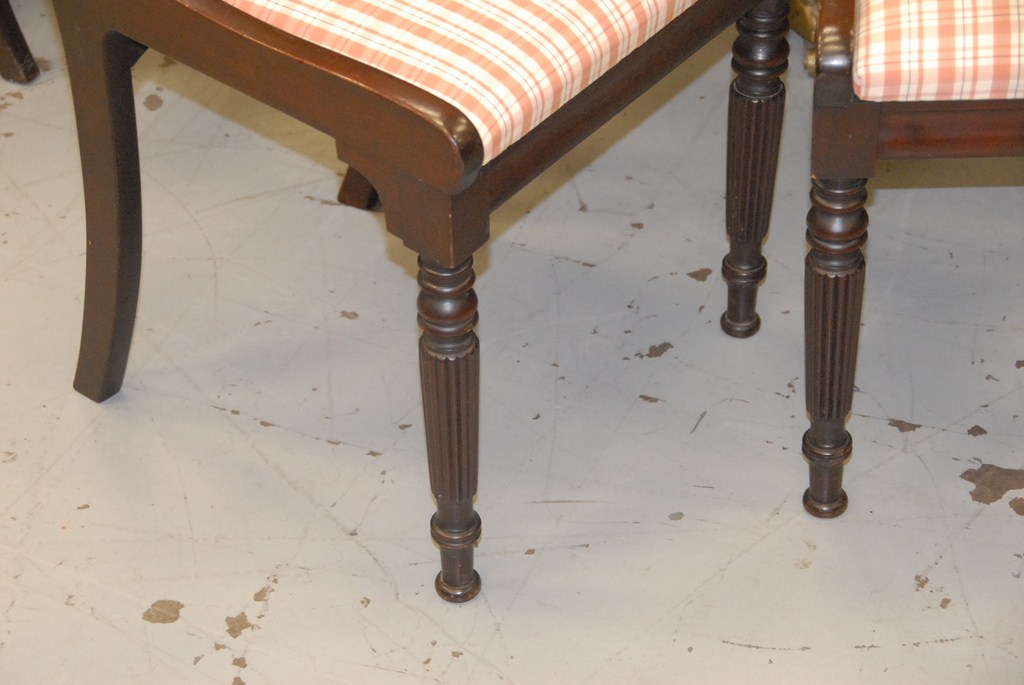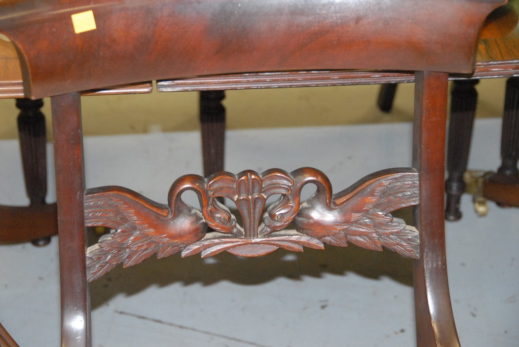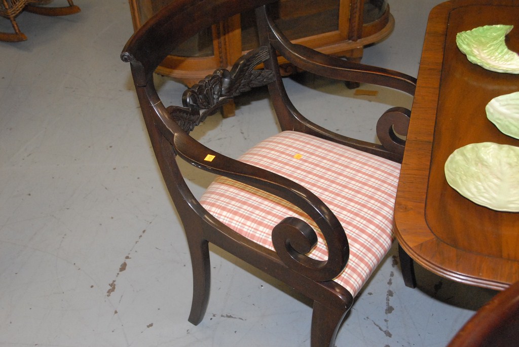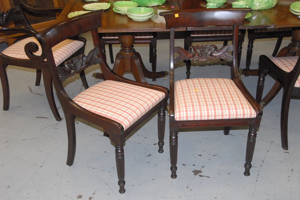 Lot 105: Set of eight Federal style dining chairs six side and two arms all with swan carved backs with upholstered slip seats.