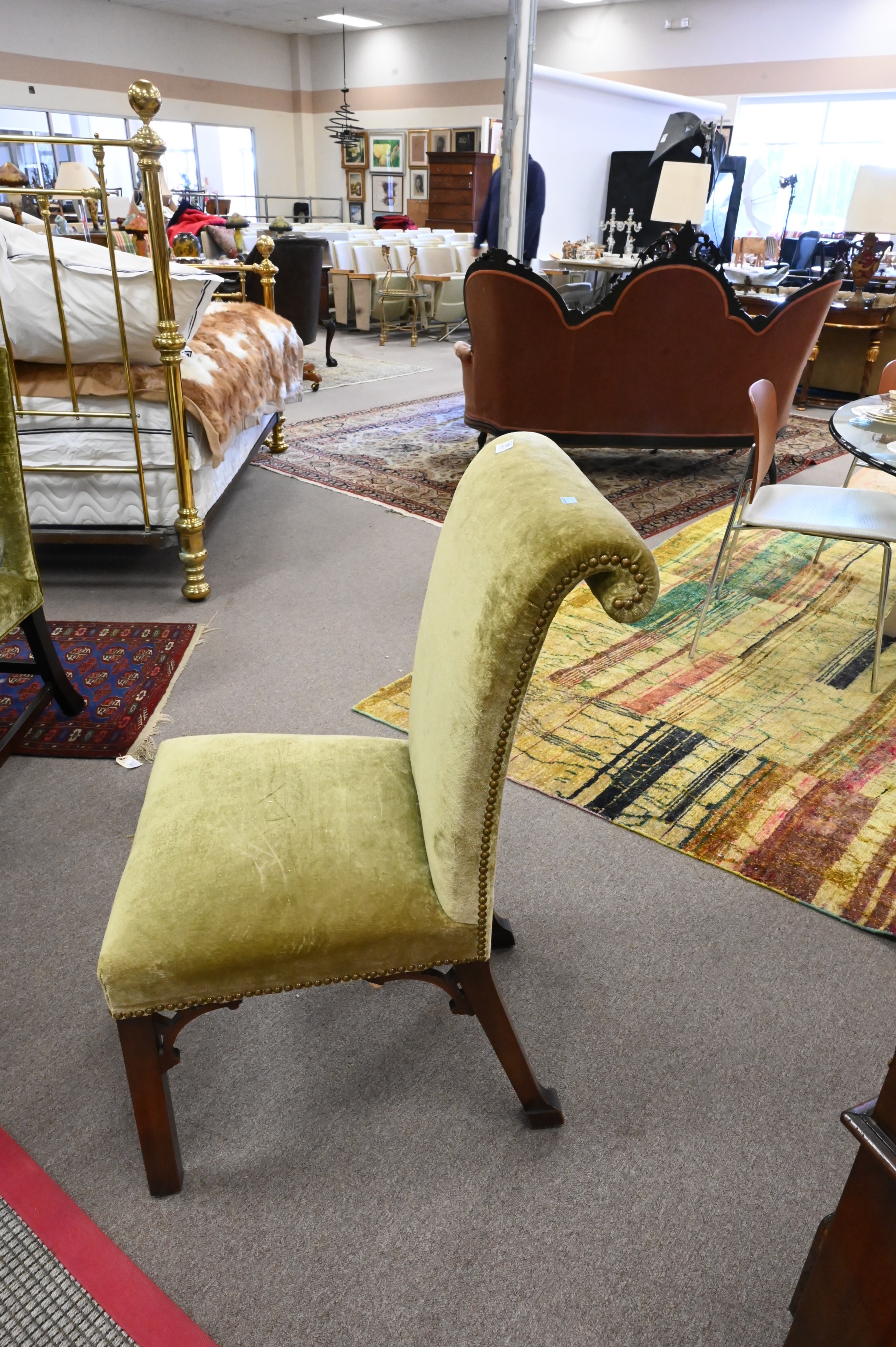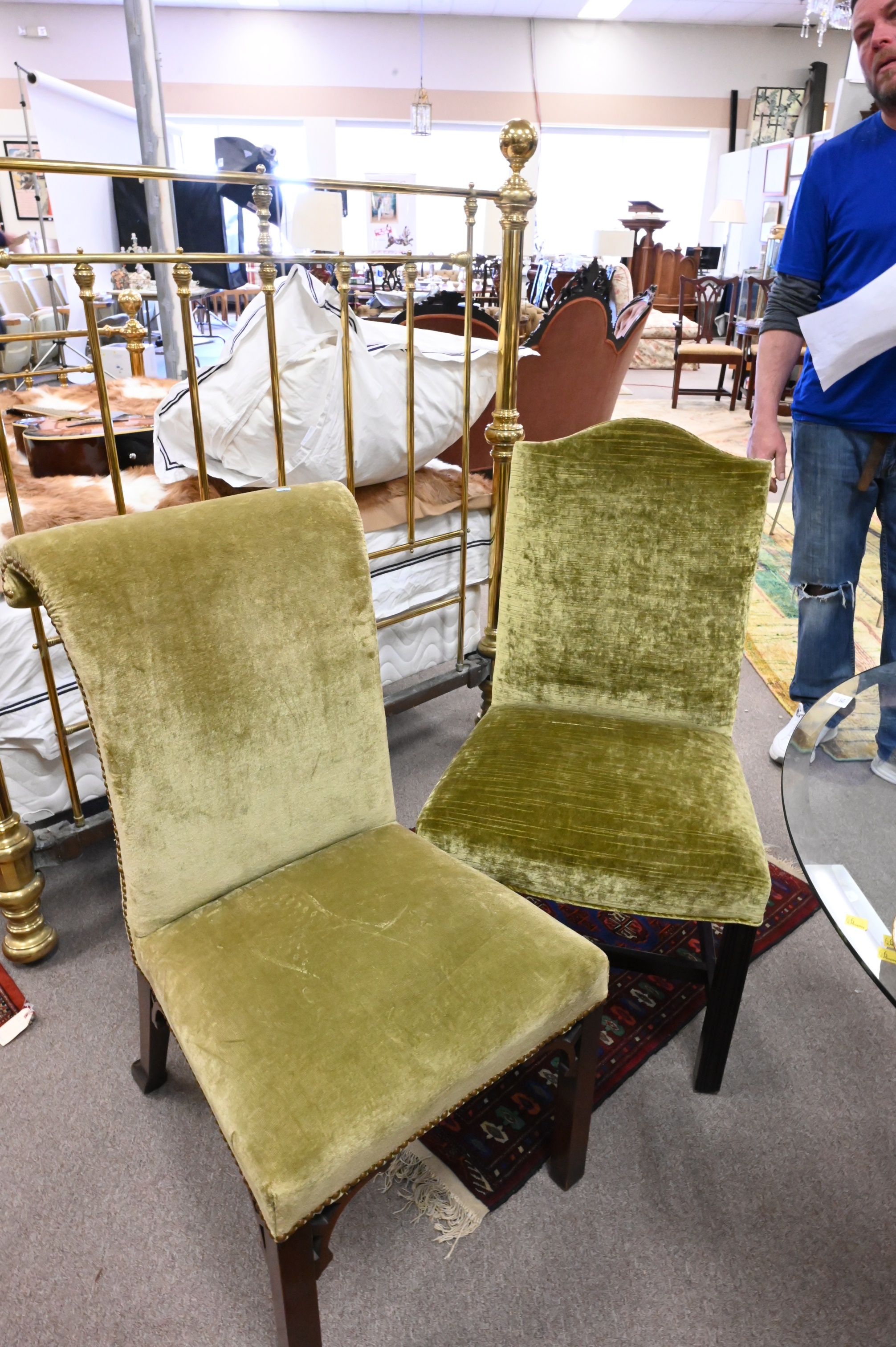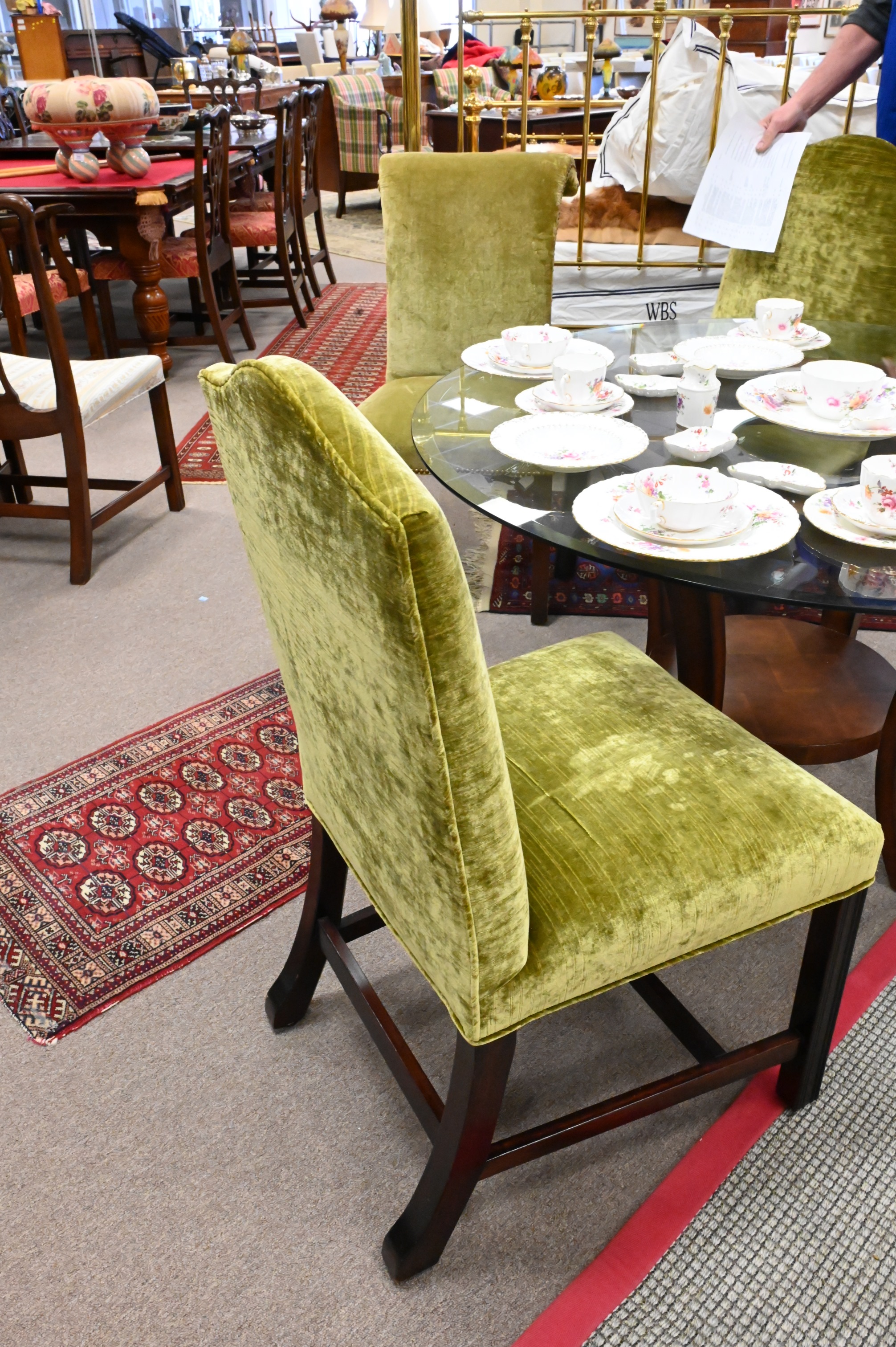 Set of Four Upholstered Dining Chairs, to include two pairs of similar formed chairs, one pair having rolled back.