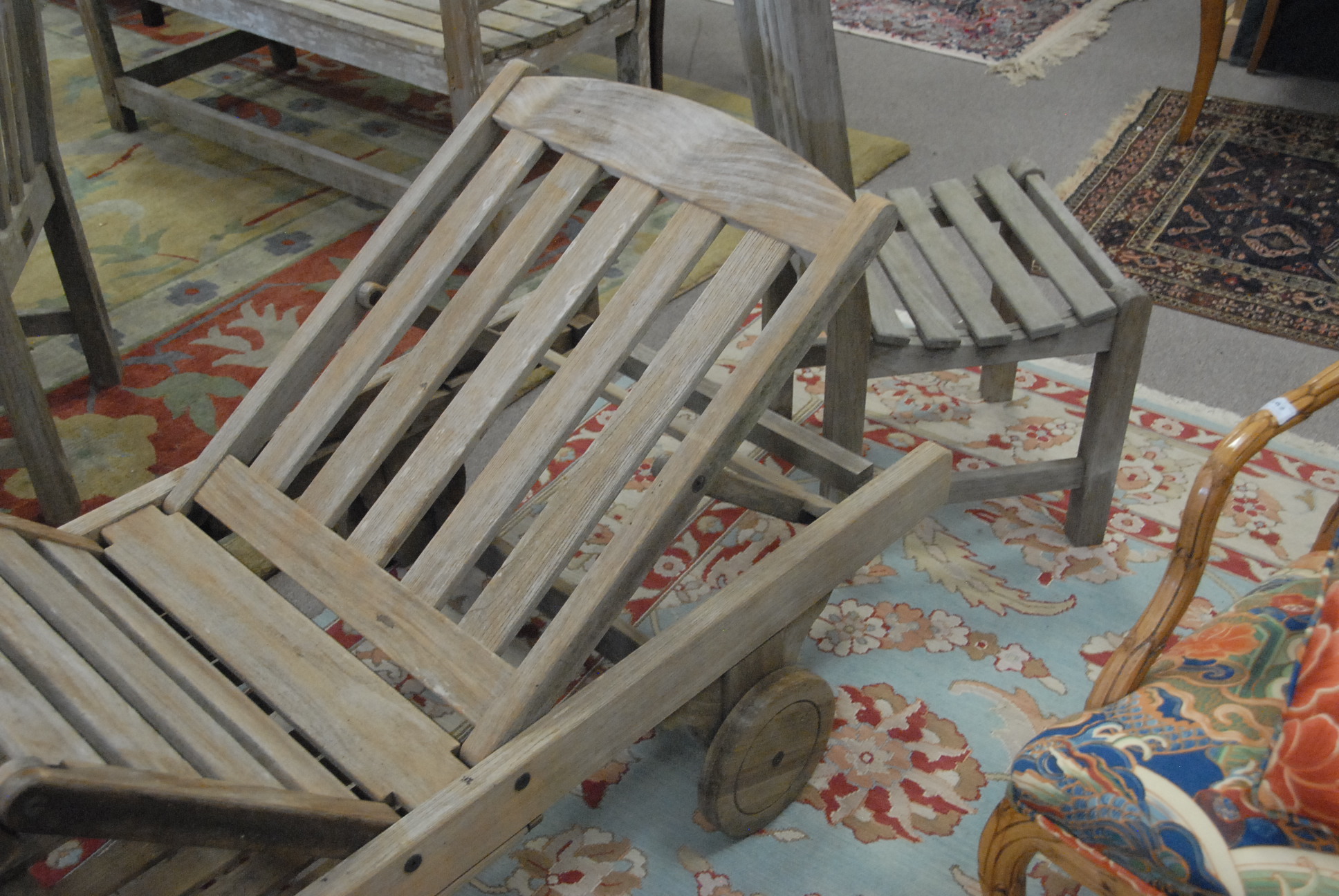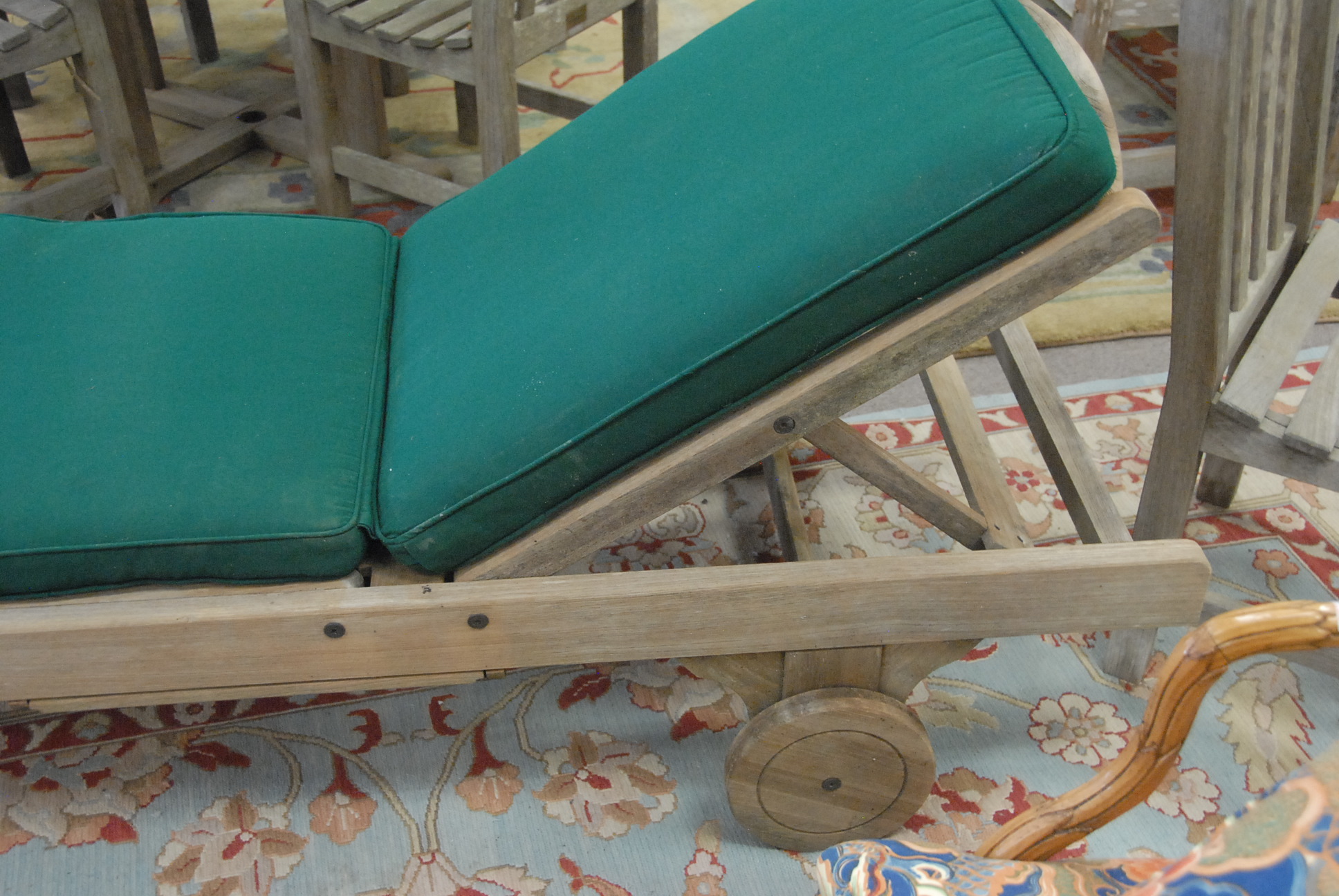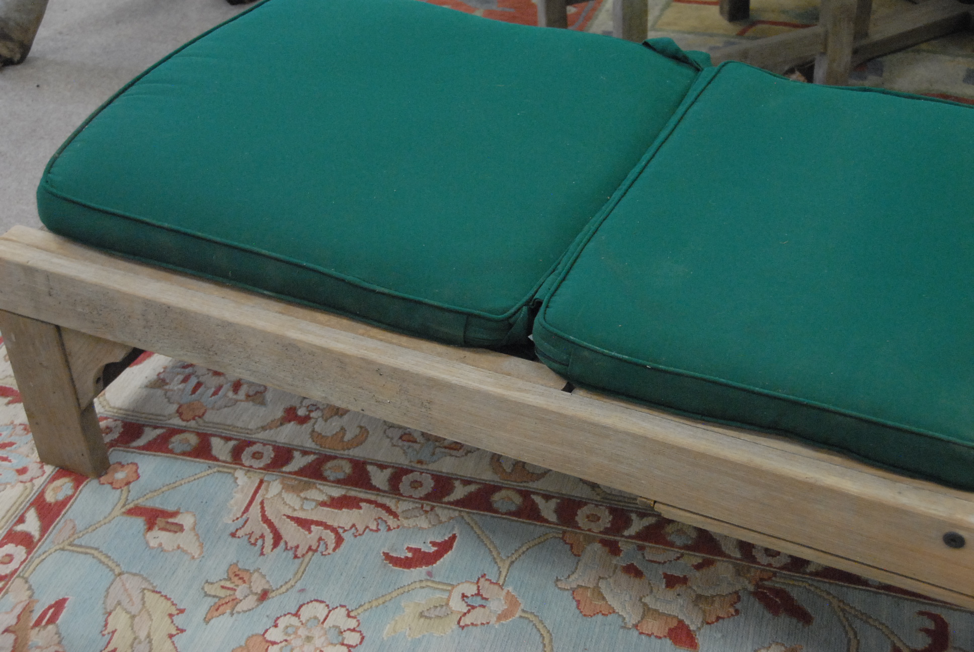 Smith & Hawken pair of teak lounges with adjustable head and leg supports, custom cushions, and pull out tables.lg 80 in. wd. 27 in.