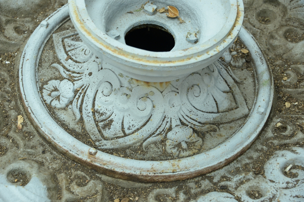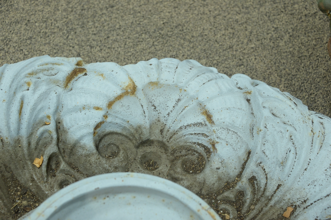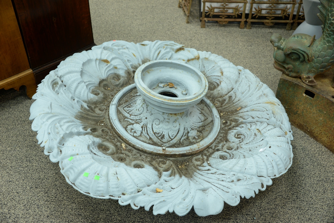 Lot 105: Victorian iron fountain base scroll and scallop shell design edge break missing piece on one side. dia. 53in. Provenance: Collecti…