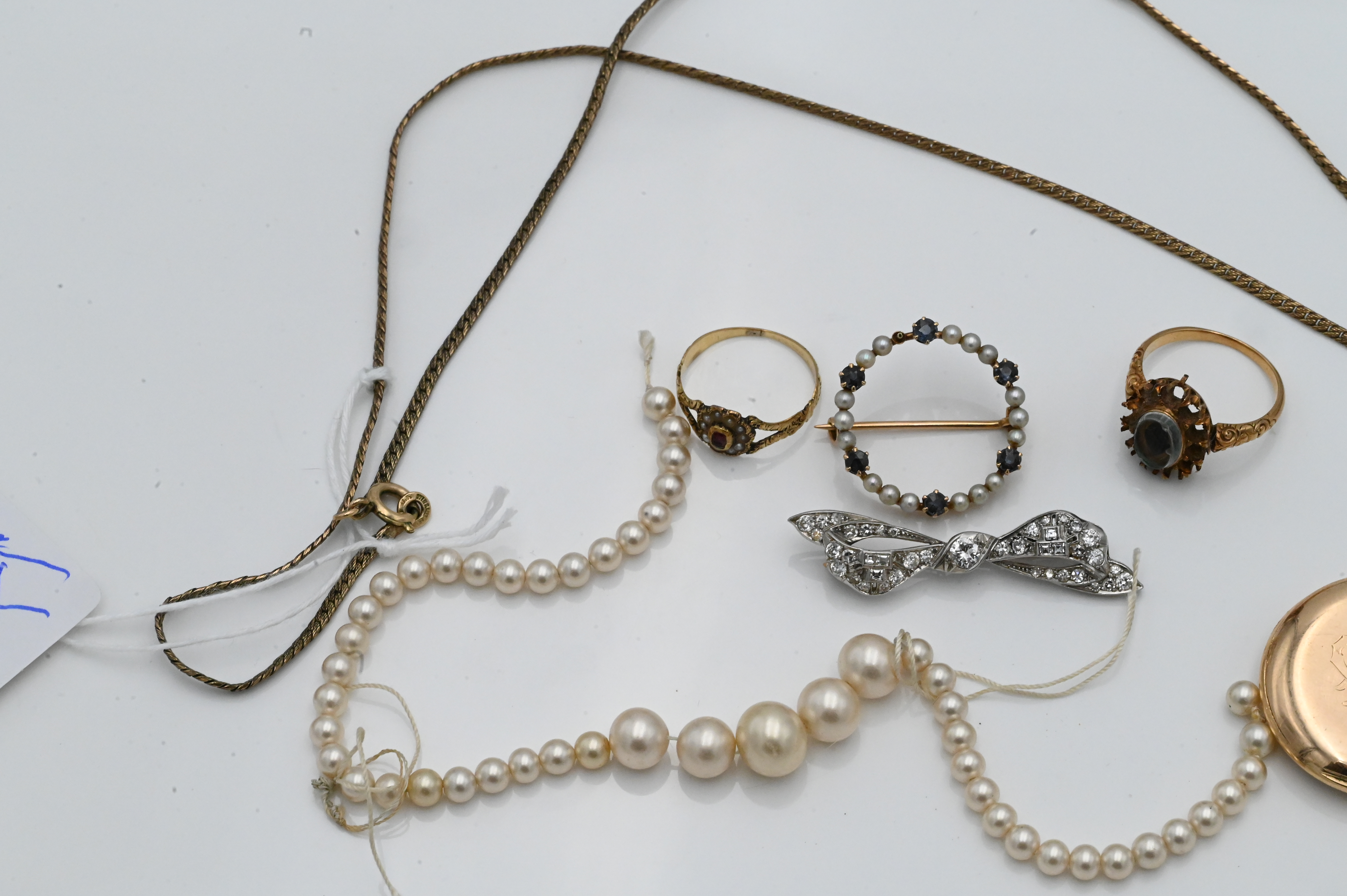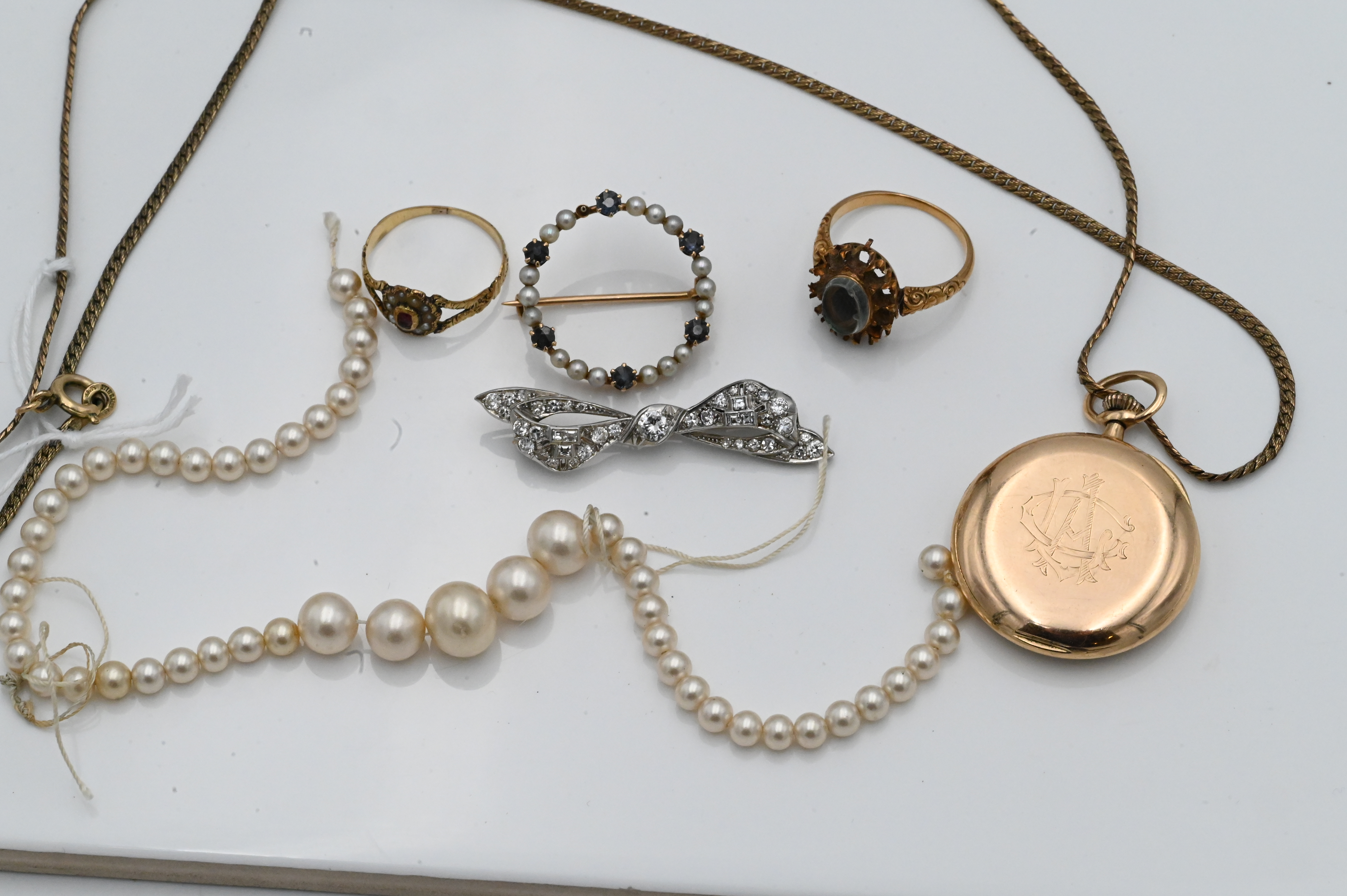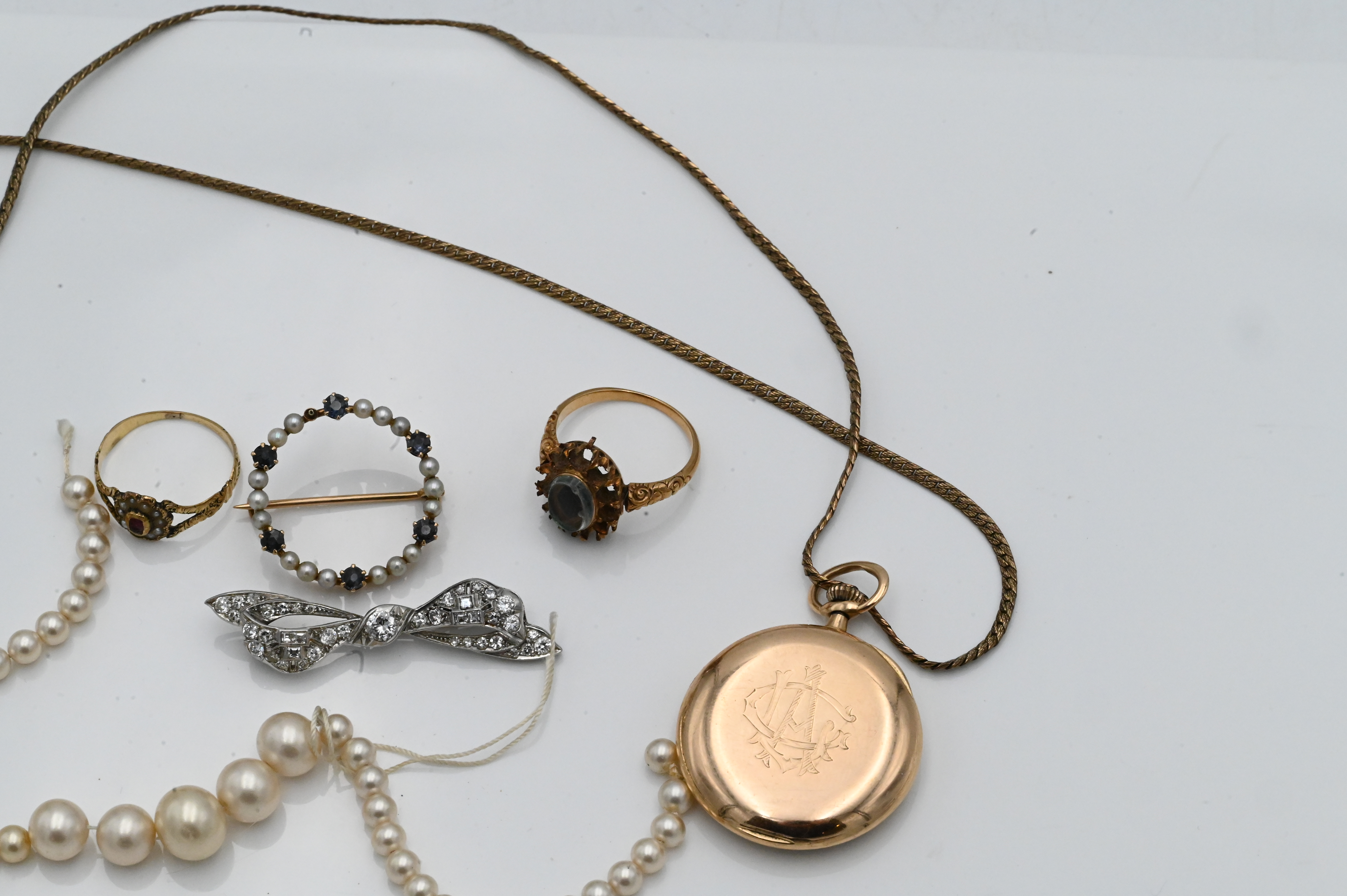 Group of Miscellaneous Jewelry, to include white gold and diamond bow pin, gold ring and pin, 14 karat gold small pocket watch.