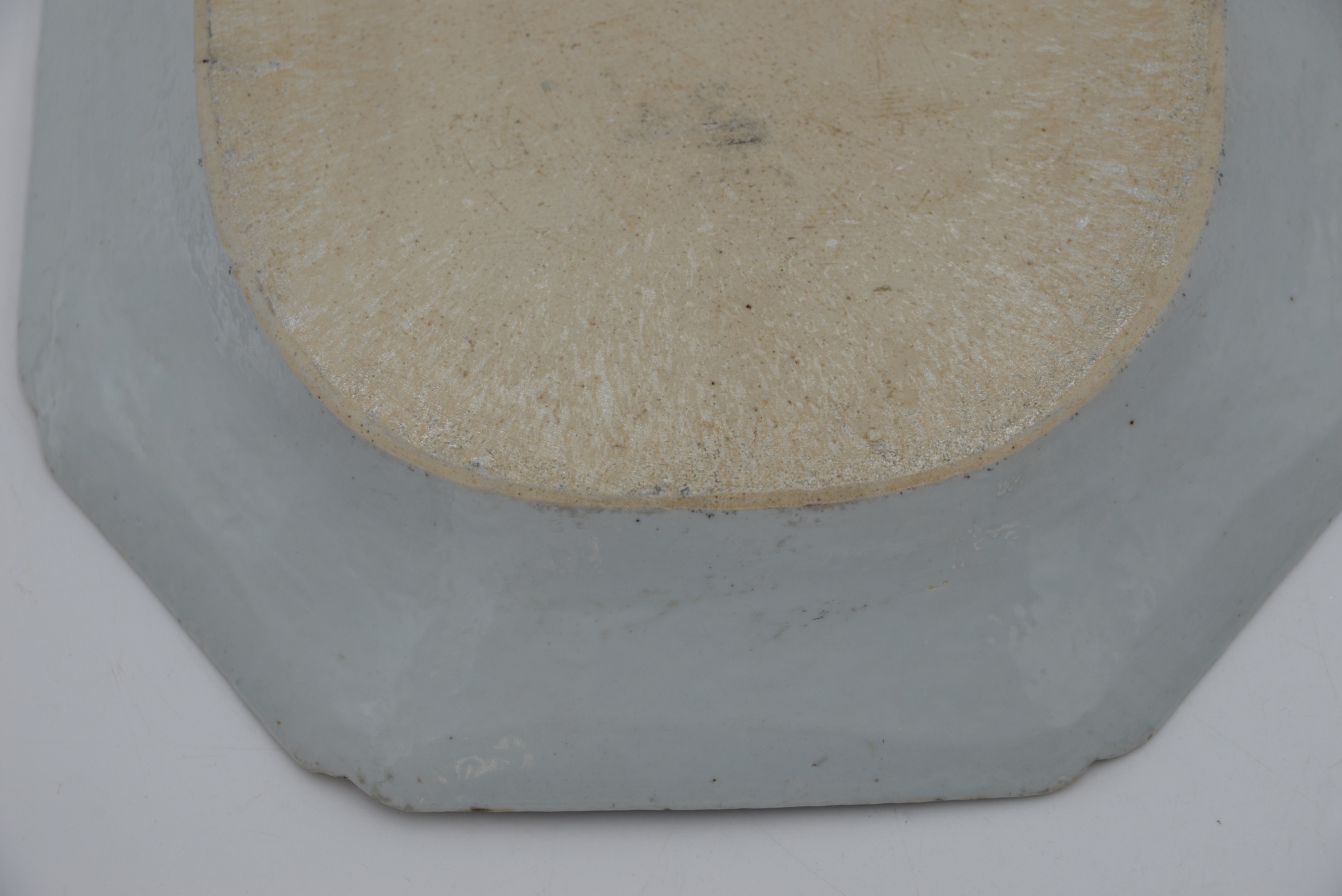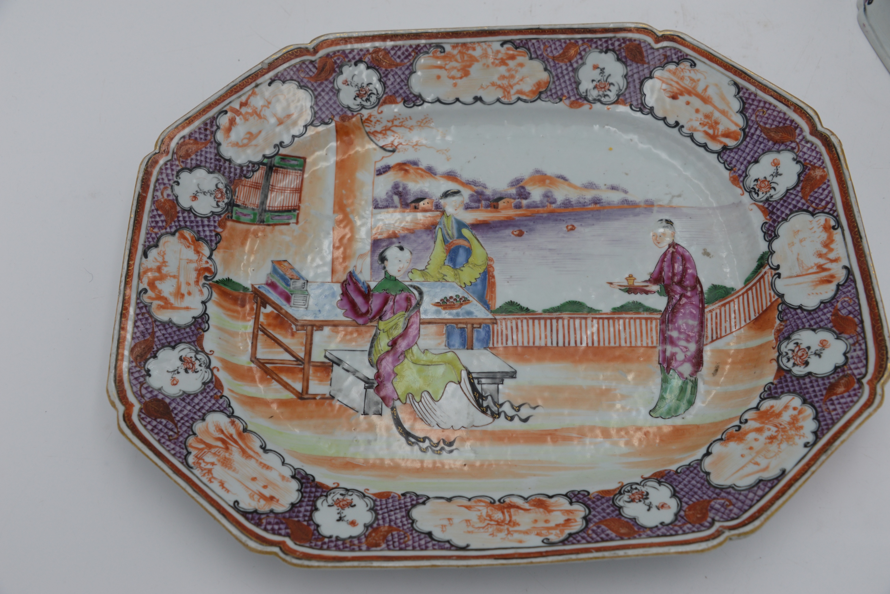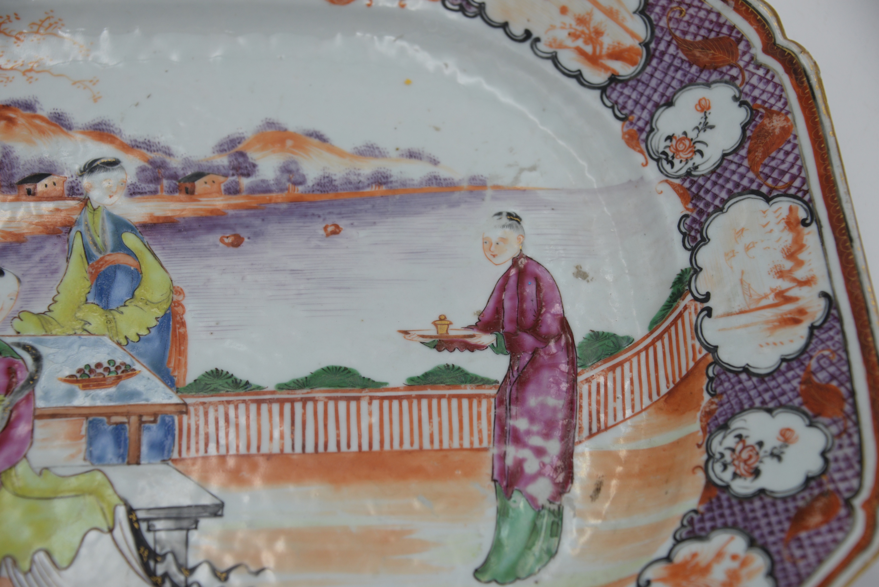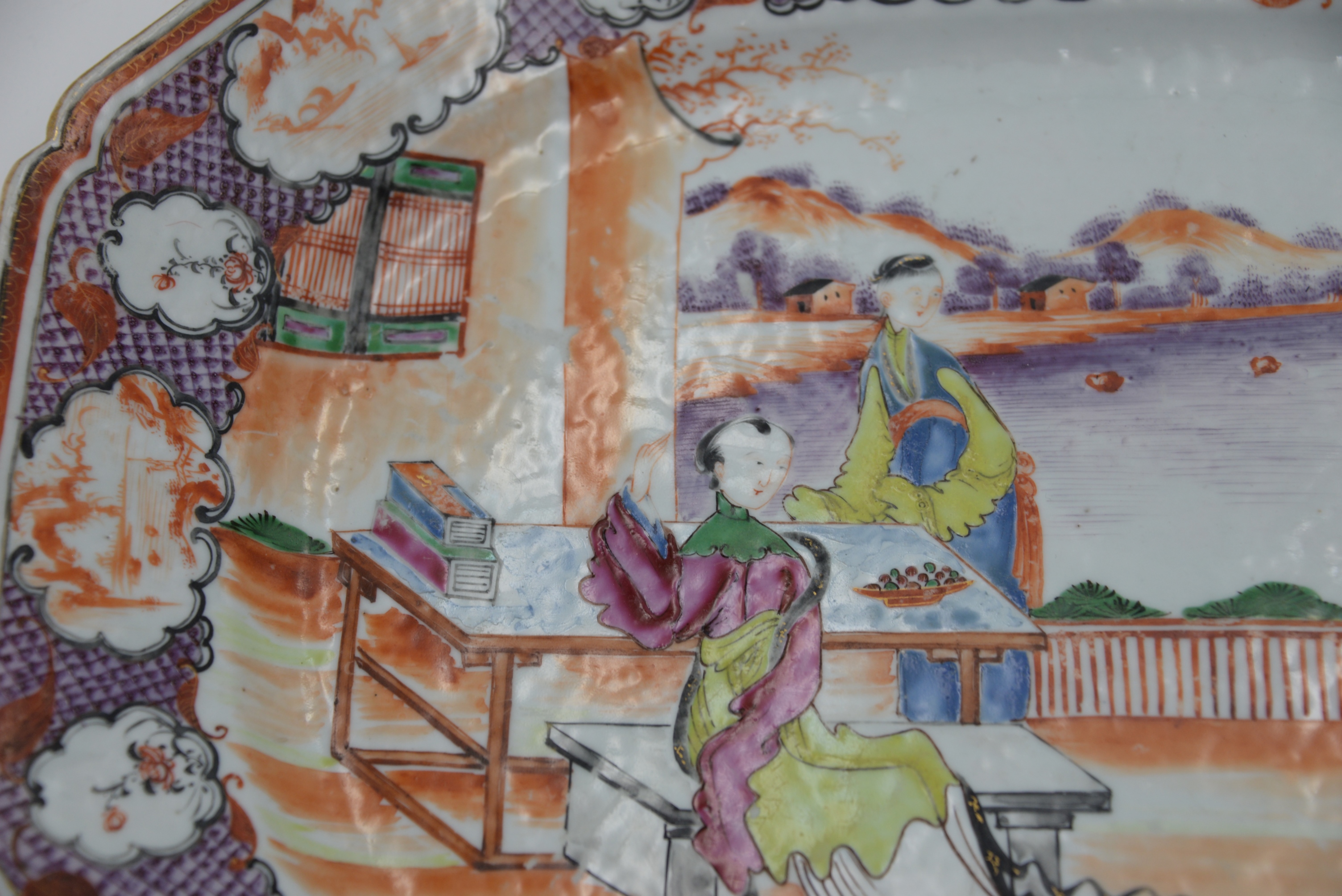 Chinese Famille Rose Export Covered Tureen and Undertray, 18th Century, decorated with Chinese women surrounded by cloud-shaped floral reserves on diamond-cross hatched background, no mark, tureen length 12 inches, platter length 15 1/2 inches