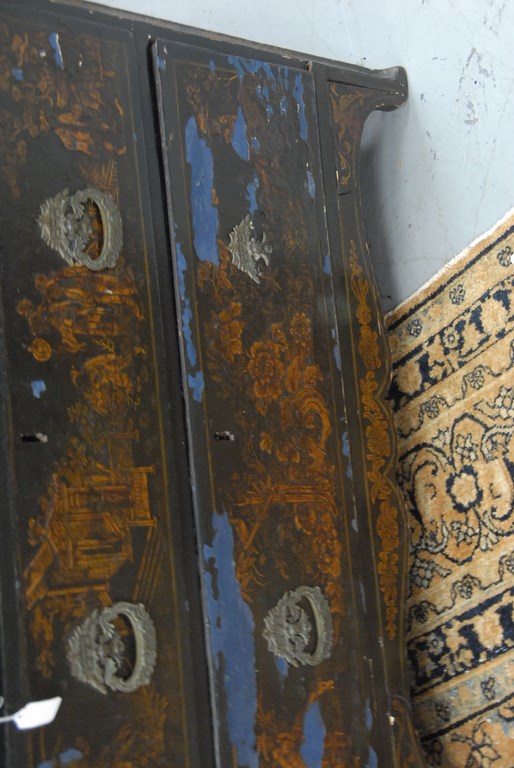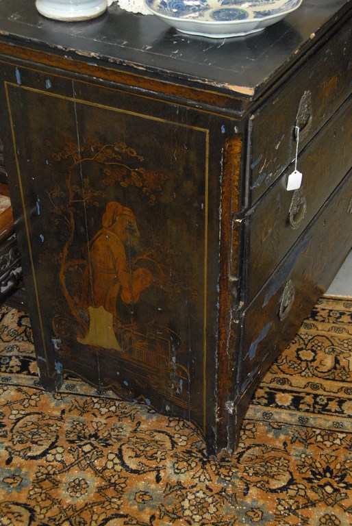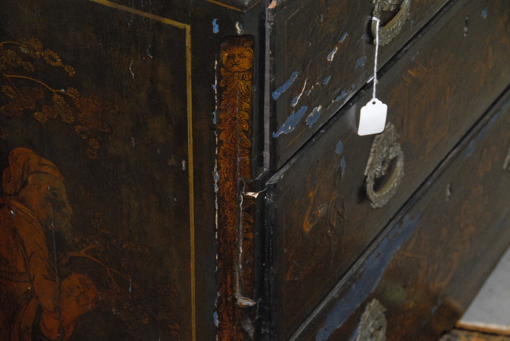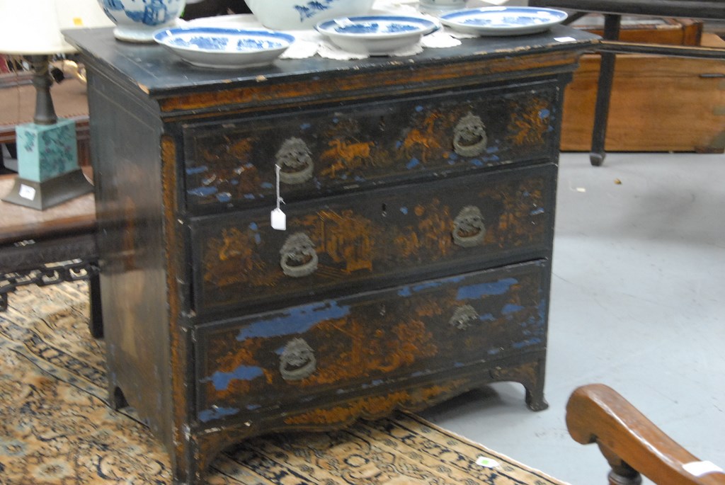 Lot 106: Chinoiserie decorated chest of three drawers, Georgian 18th century made from chest on chest top. ht. 36in. wd. 40in. dp. 21in.