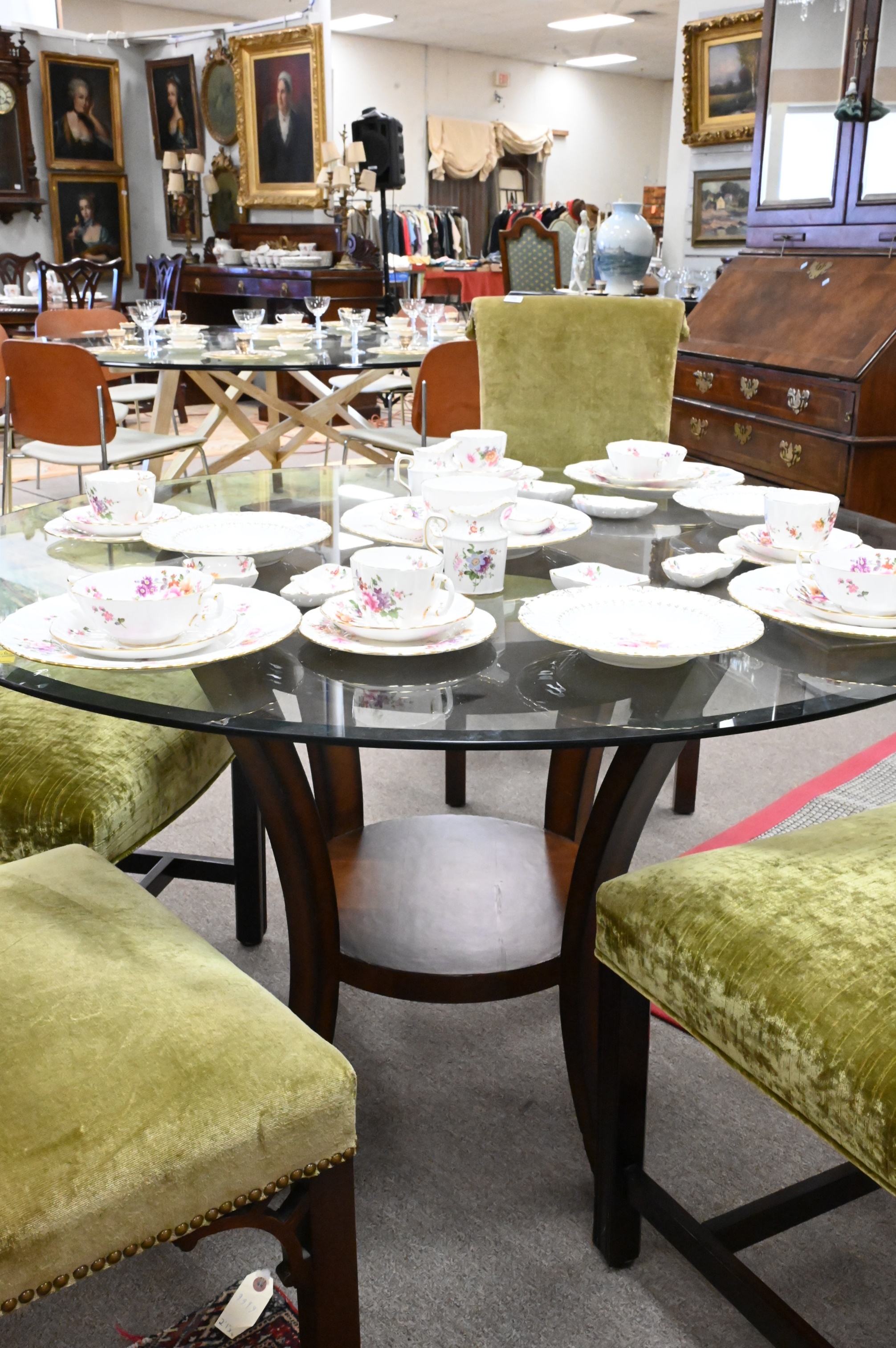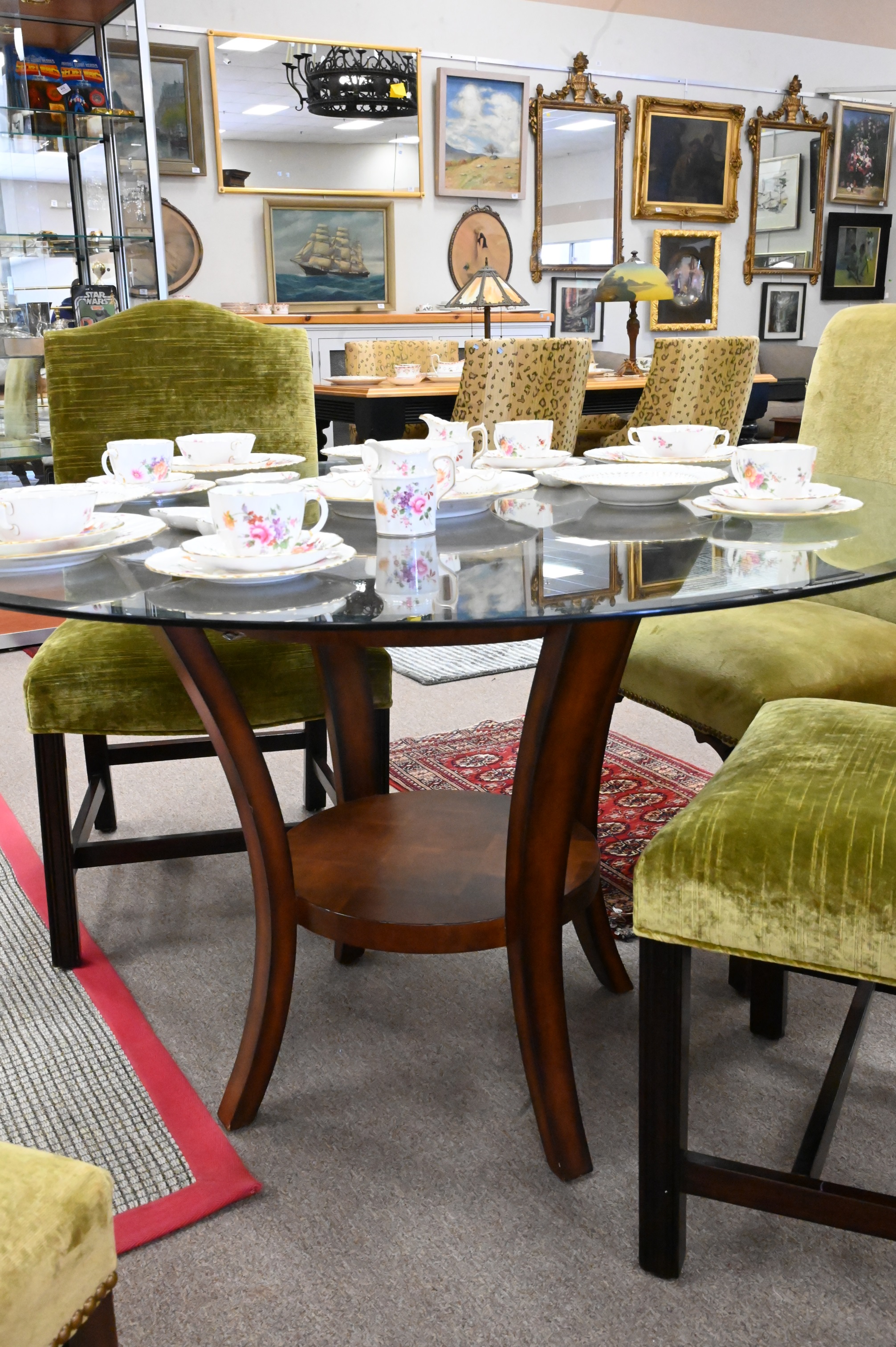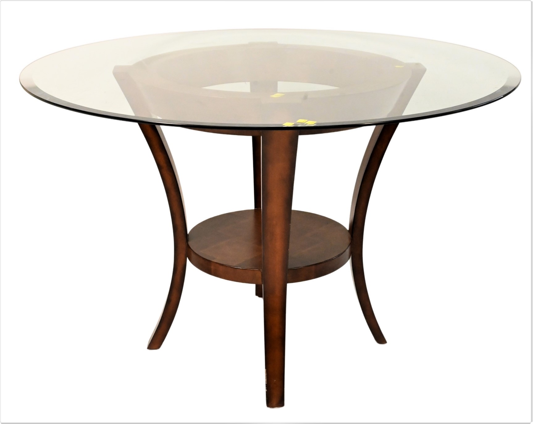 Contemporary Round Glass Top Table, having beveled glass, height 29 inches, width 49 inches.