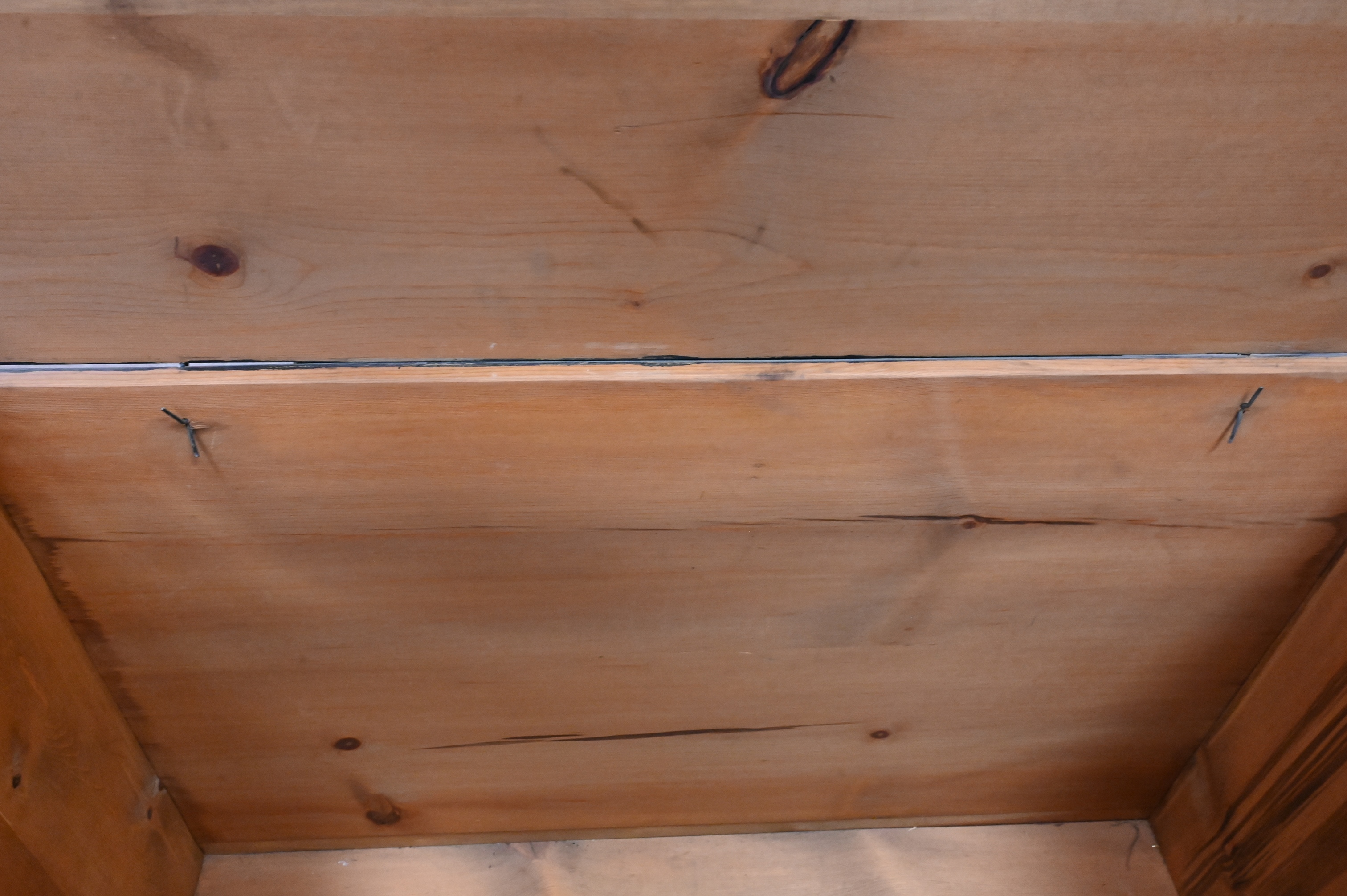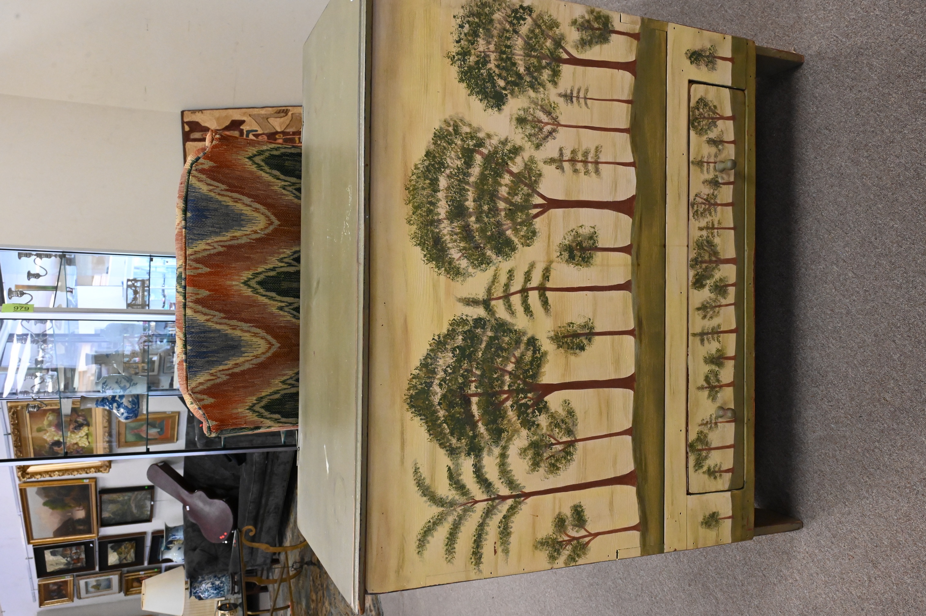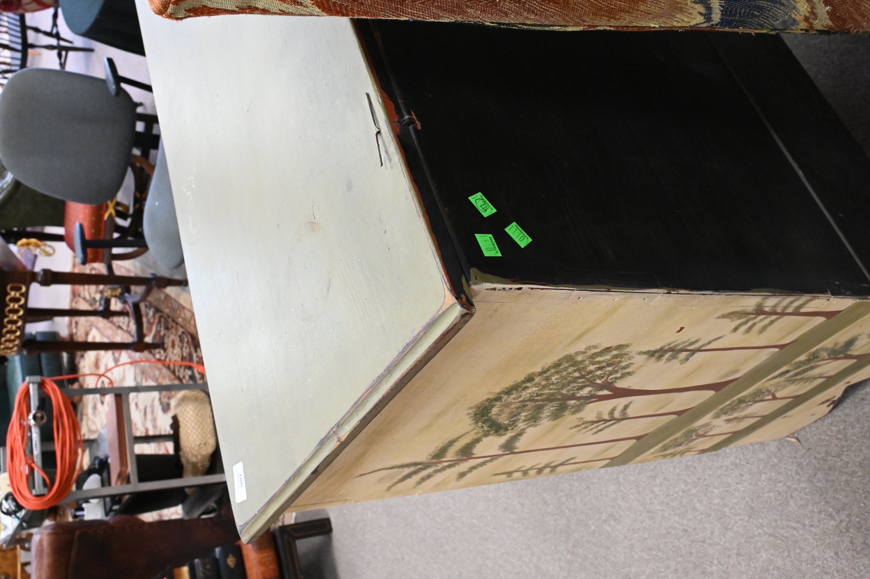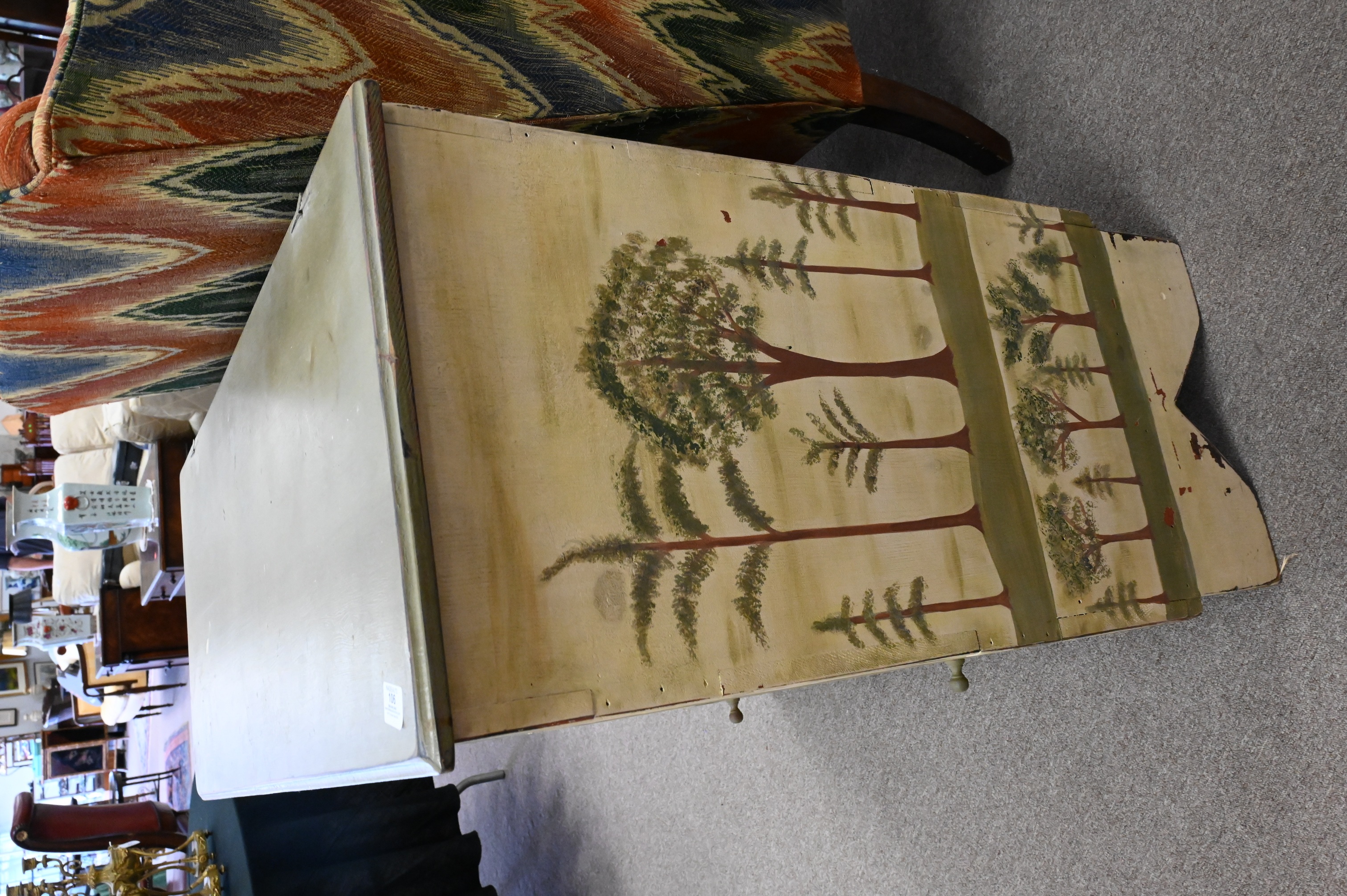 having lift top with snipe hinges set on painted body, one drawer and boot jack ends
