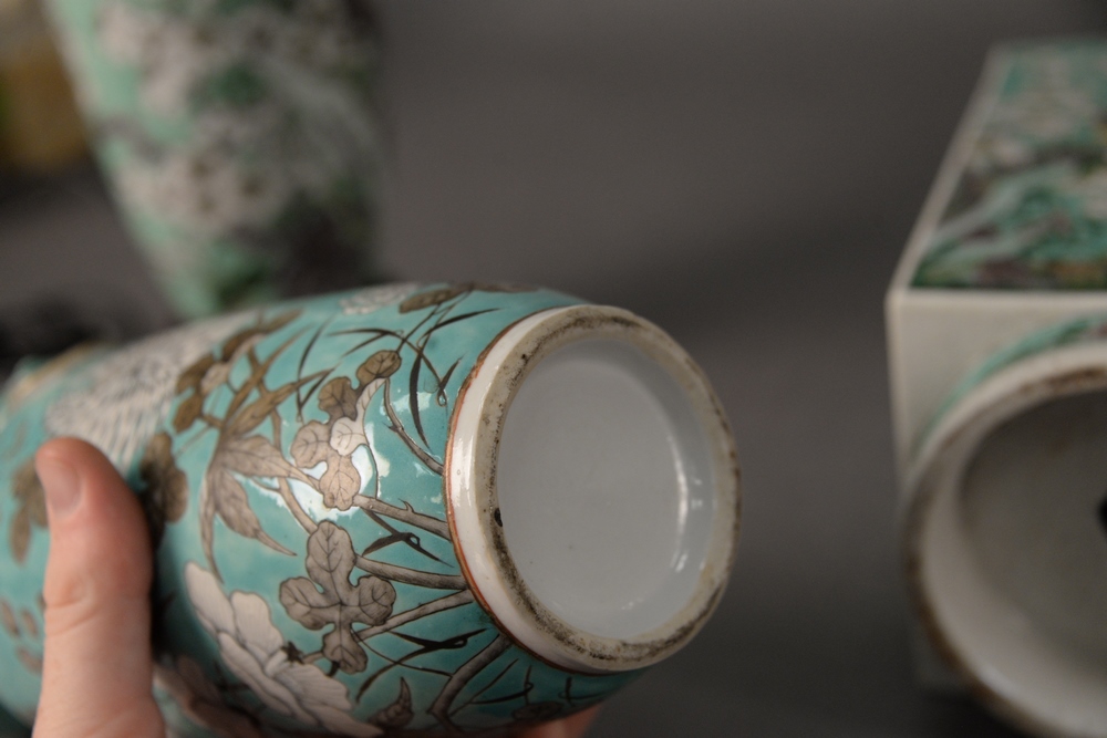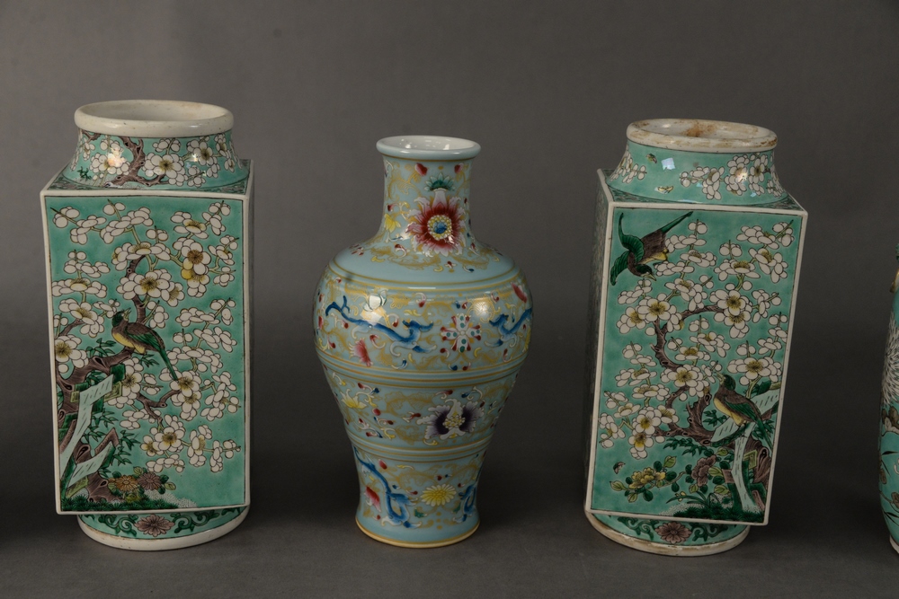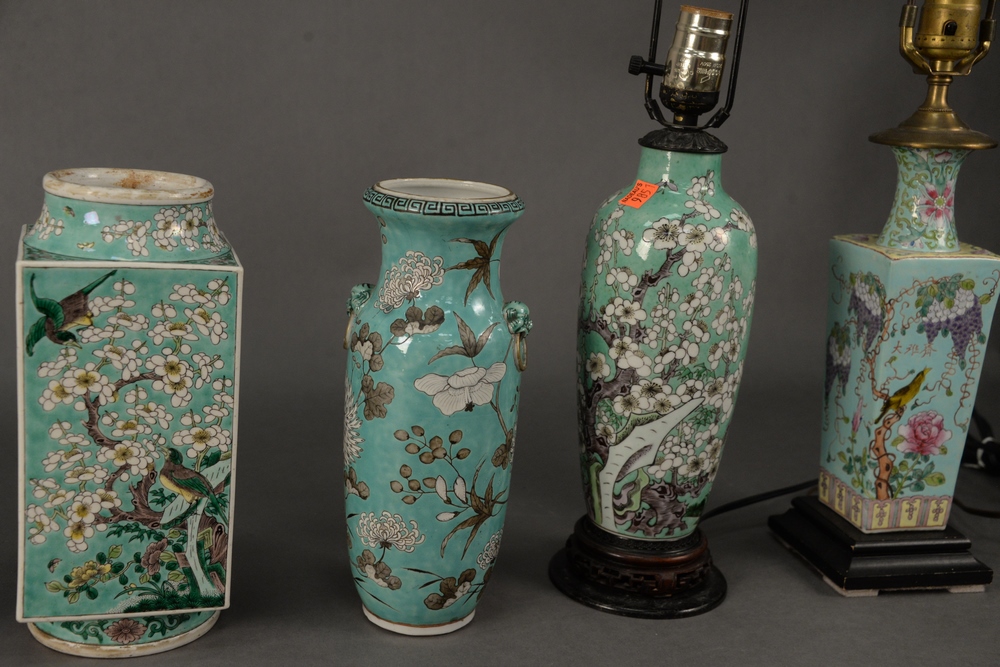 Eight Piece Chinese Group, to include a pair of table lamps having white flower blossoms; a pair of square vases (drilled), having white flowers and birds; a pair of ovoid form vases having white and black flowers, along with a table lamp and a vase having pink flowers and birds, tallest height 22 1/2 inches.