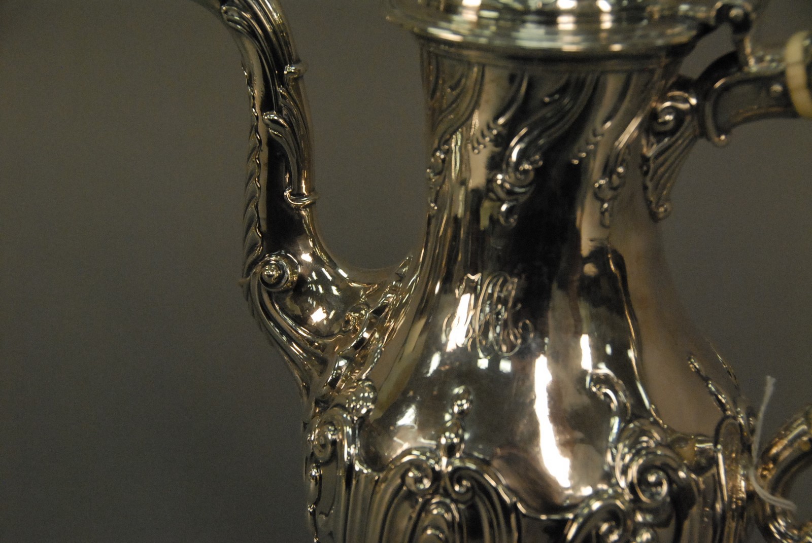 English silver tea pot having crown finial and all over scroll design, marked with monogram and 1860-1902. ht. 11 1/2 in. 32.9 t oz.