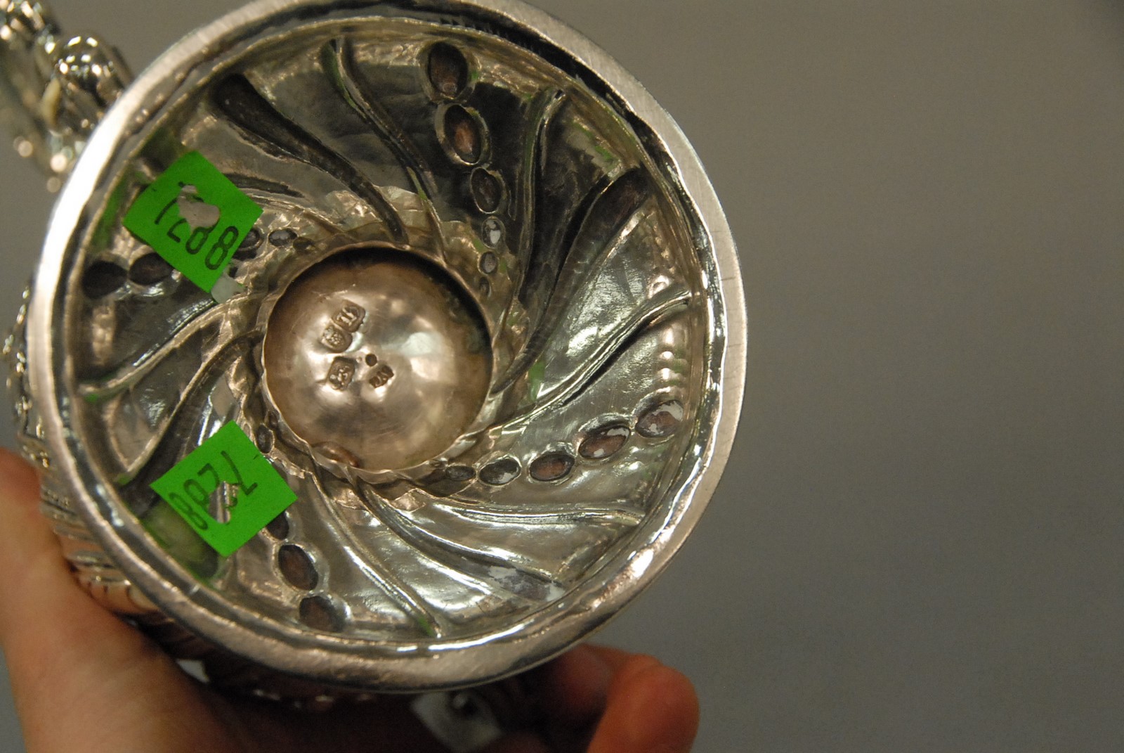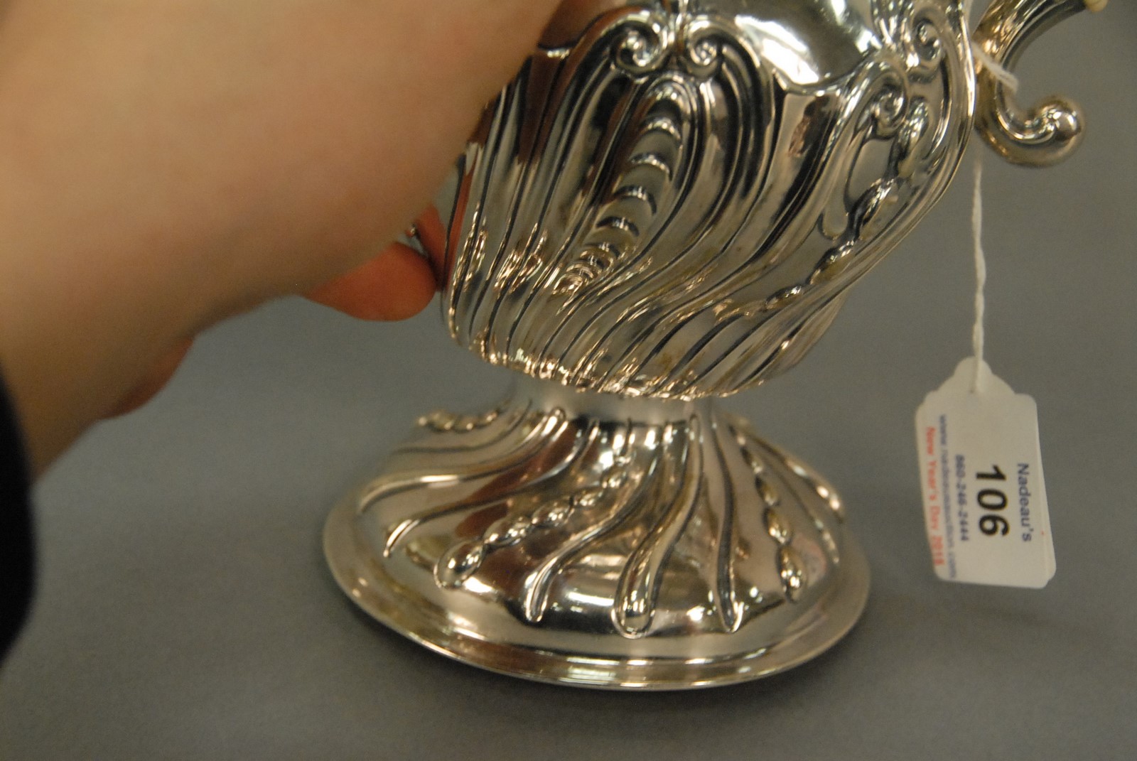Lot 106: English silver tea pot having crown finial and all over scroll design, marked with monogram and 1860-1902. ht. 11 1/2 in. 32.9 t oz.