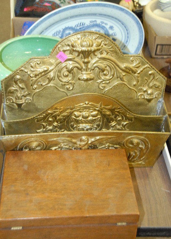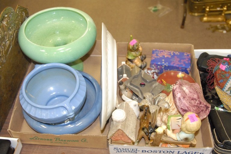Lot 106: Five boxes to include silverplate, beaded purses, opera glasses, paper weight, Hummel, cloisonn, Dansk dishes, etc.