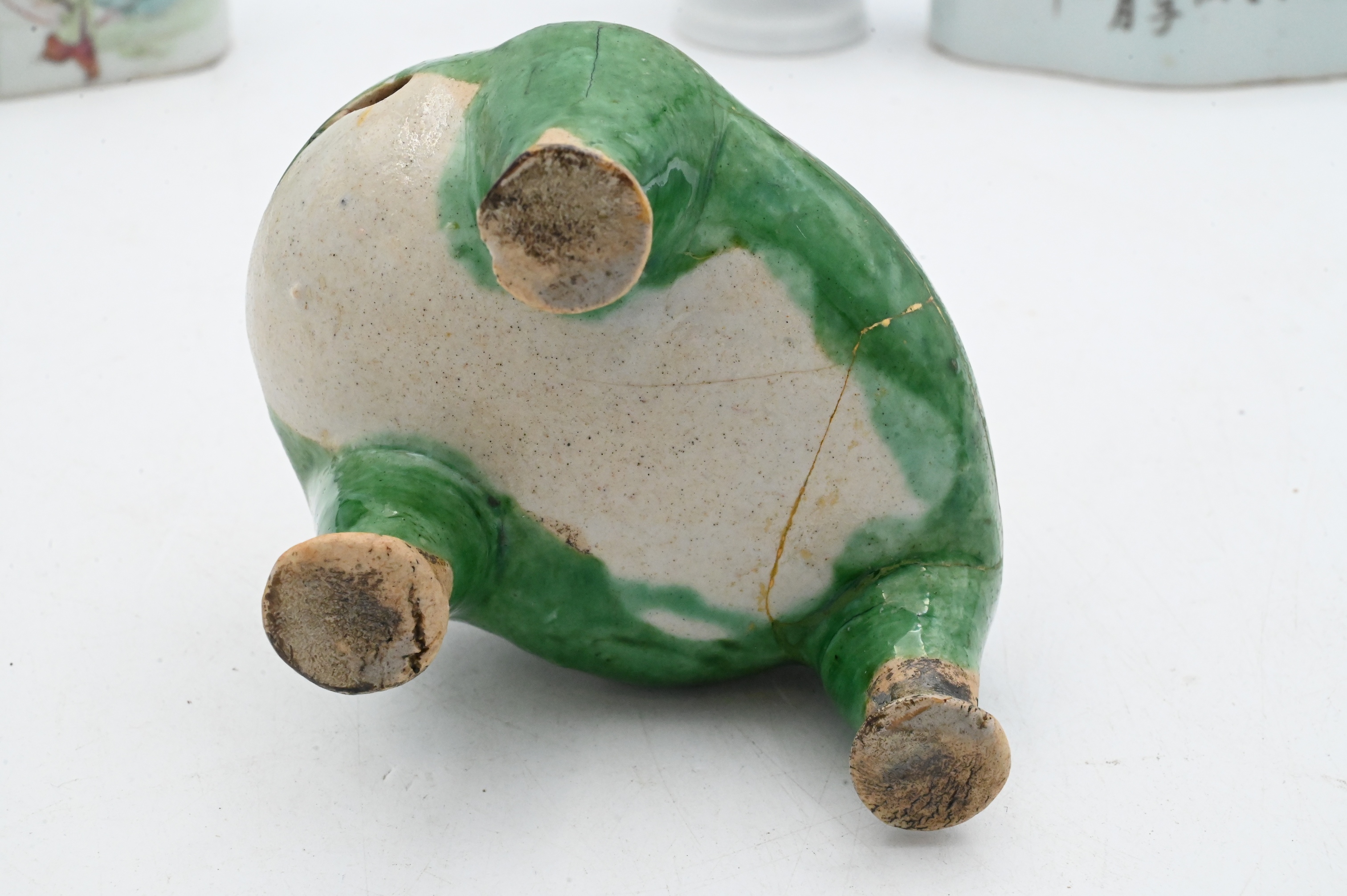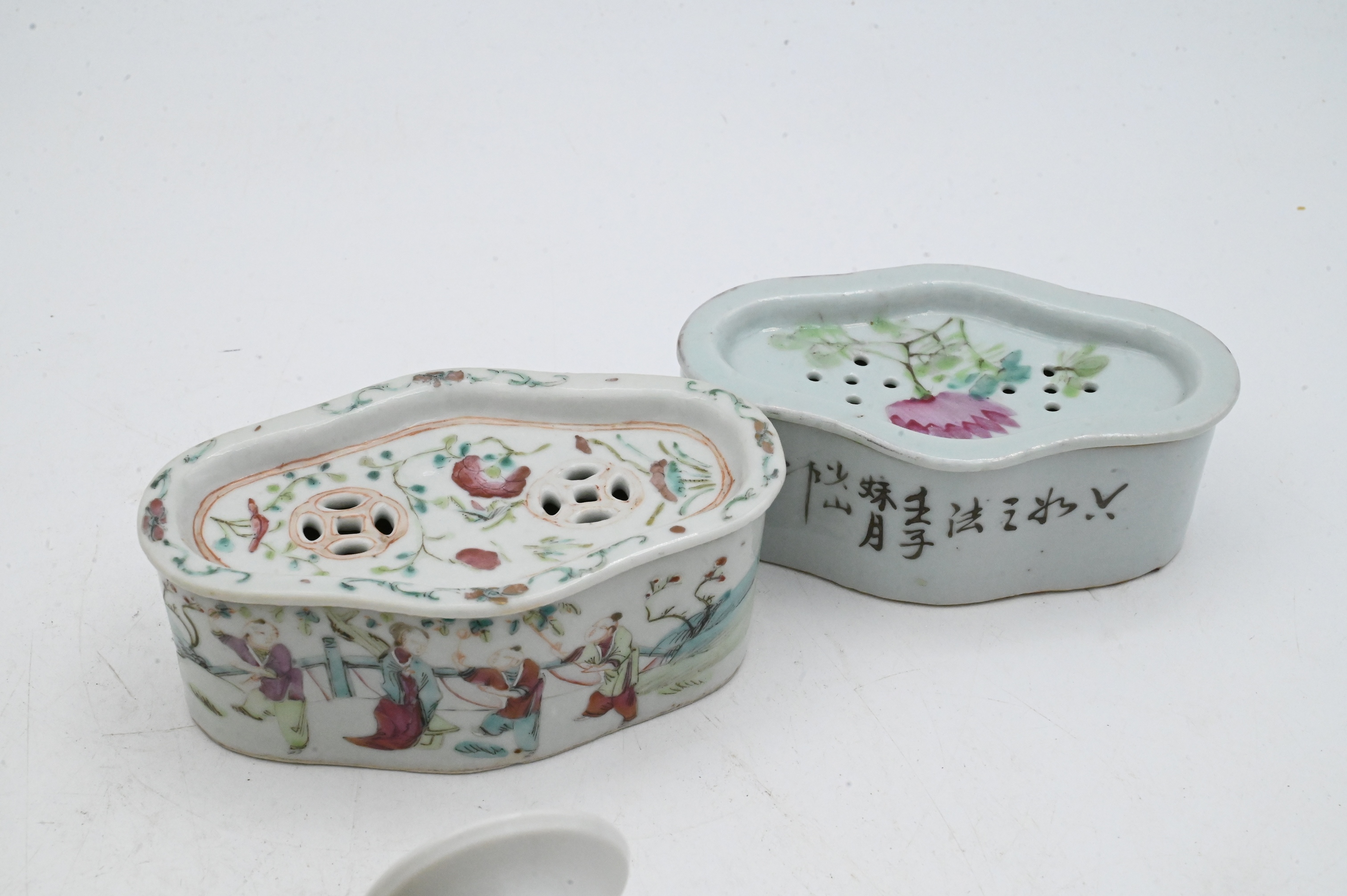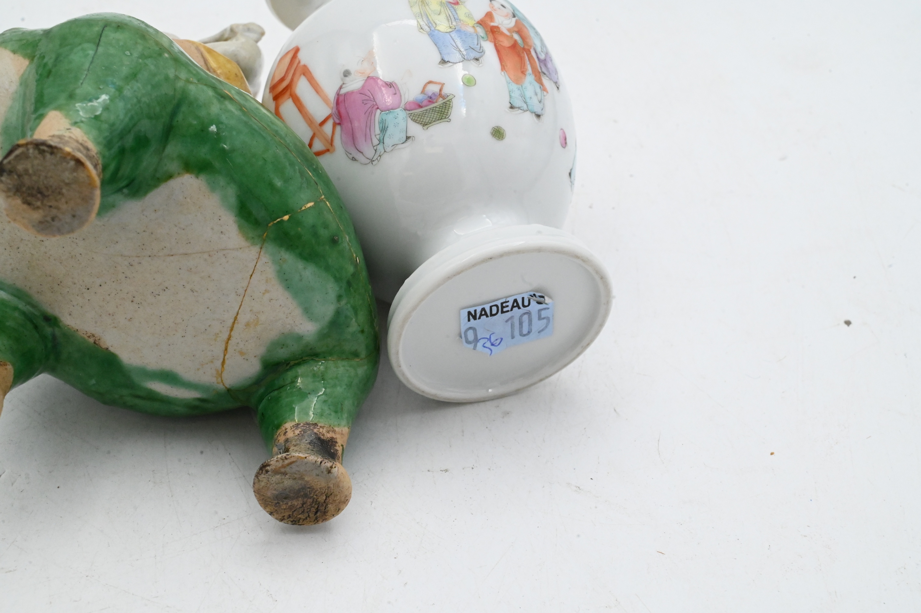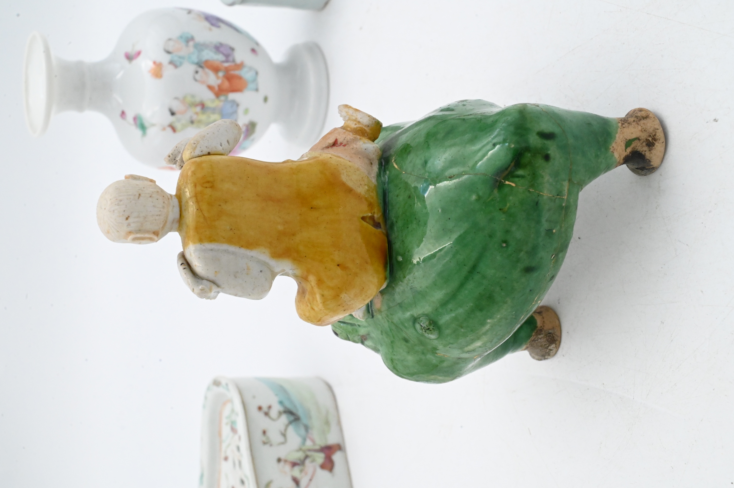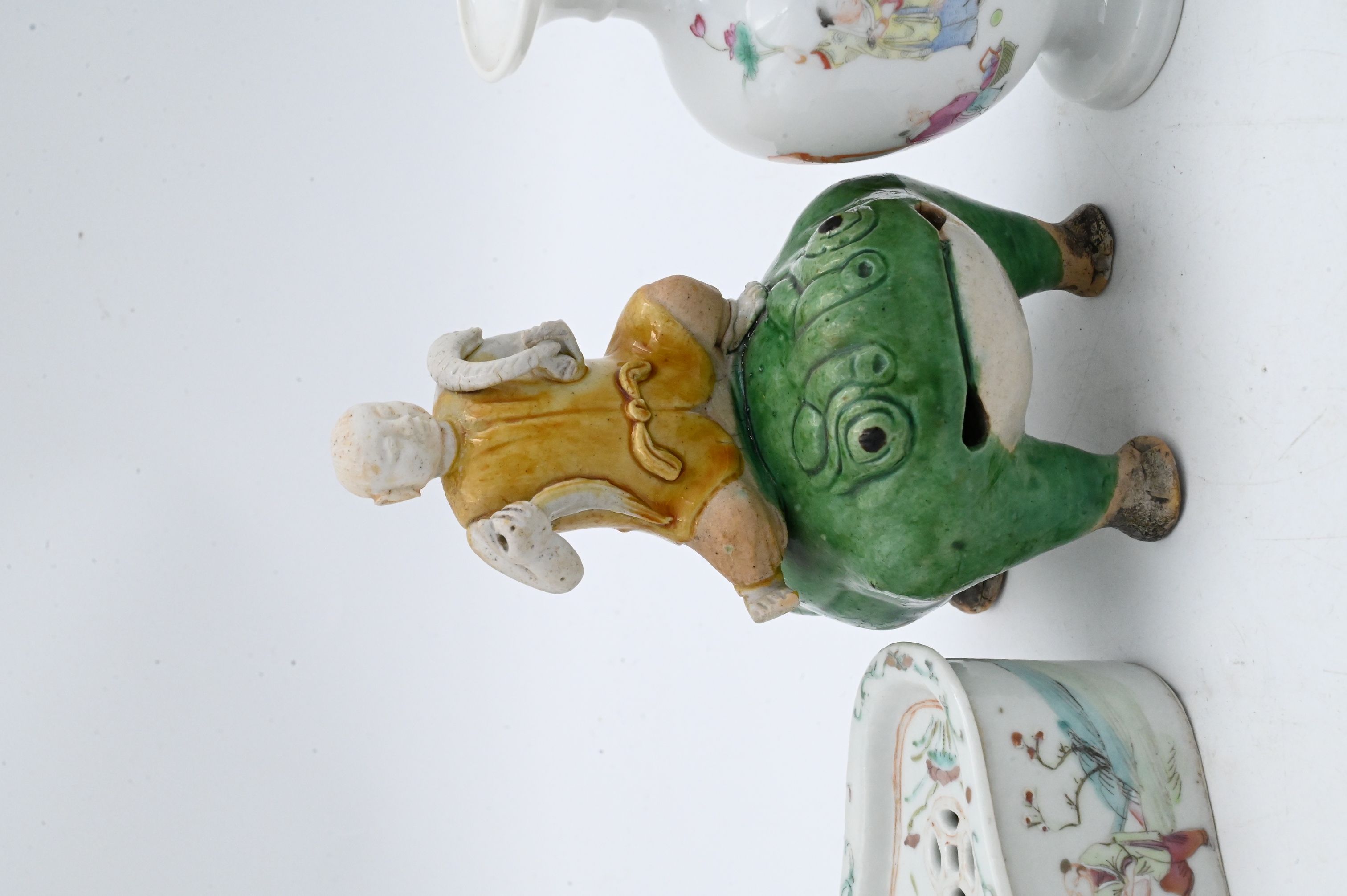 Including a figure of a boy riding a frog, a small famille rose vase probably Republic period decorated with figures and furniture, and two famille rose brush washers with pierced covers decorated with lotus.