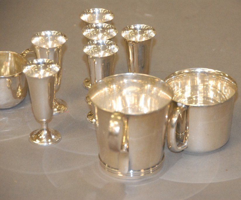 Lot 106: Group lot of sterling silver six shot glasses and six mugs, 12 t oz