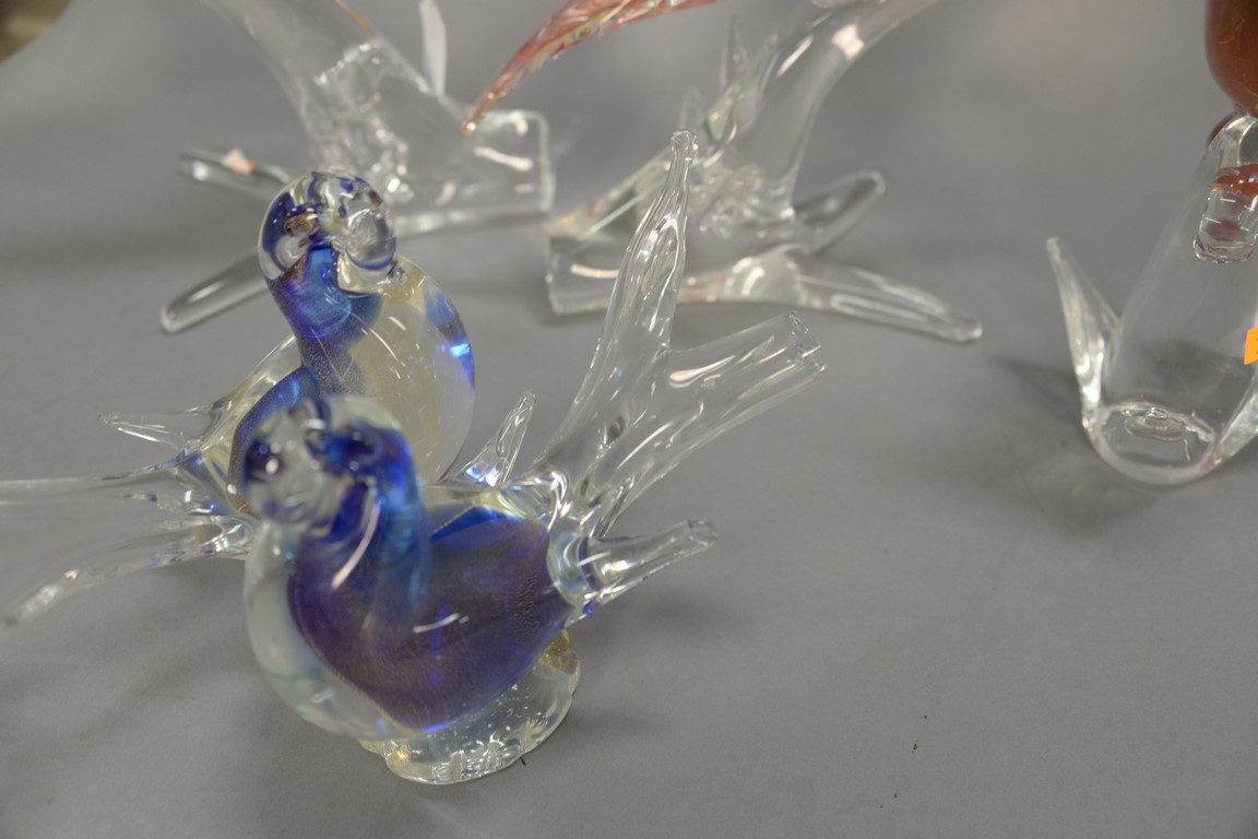 Group of four Murano art glass birds to include a double bird figure as is a cocatoo, and two birds of paradise. ht. 6 1/2 in. to 14 in.