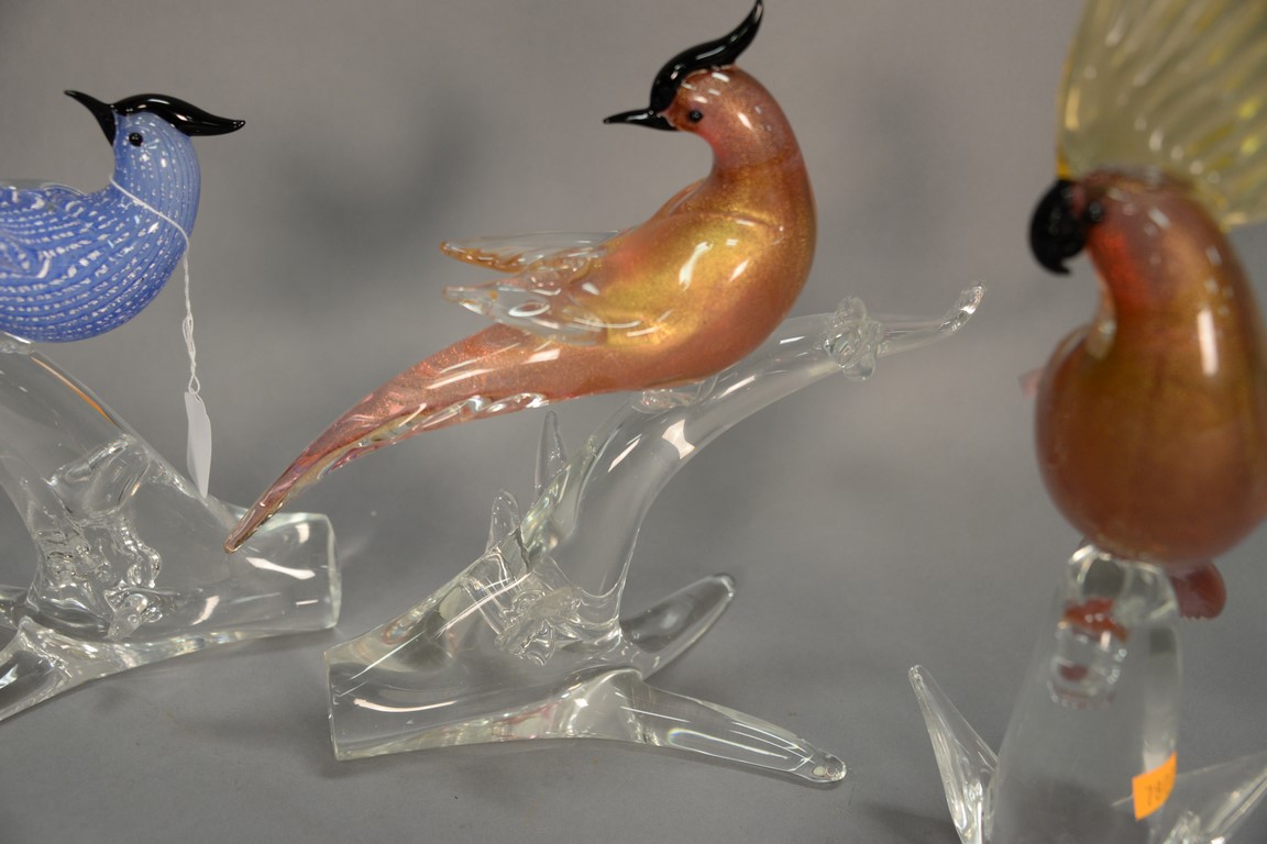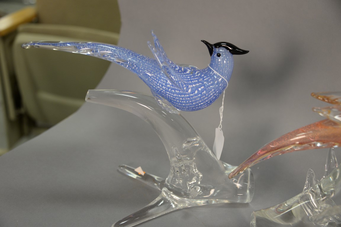 Lot 106: Group of four Murano art glass birds to include a double bird figure as is a cocatoo, and two birds of paradise. ht. 6 1/2 in. to …