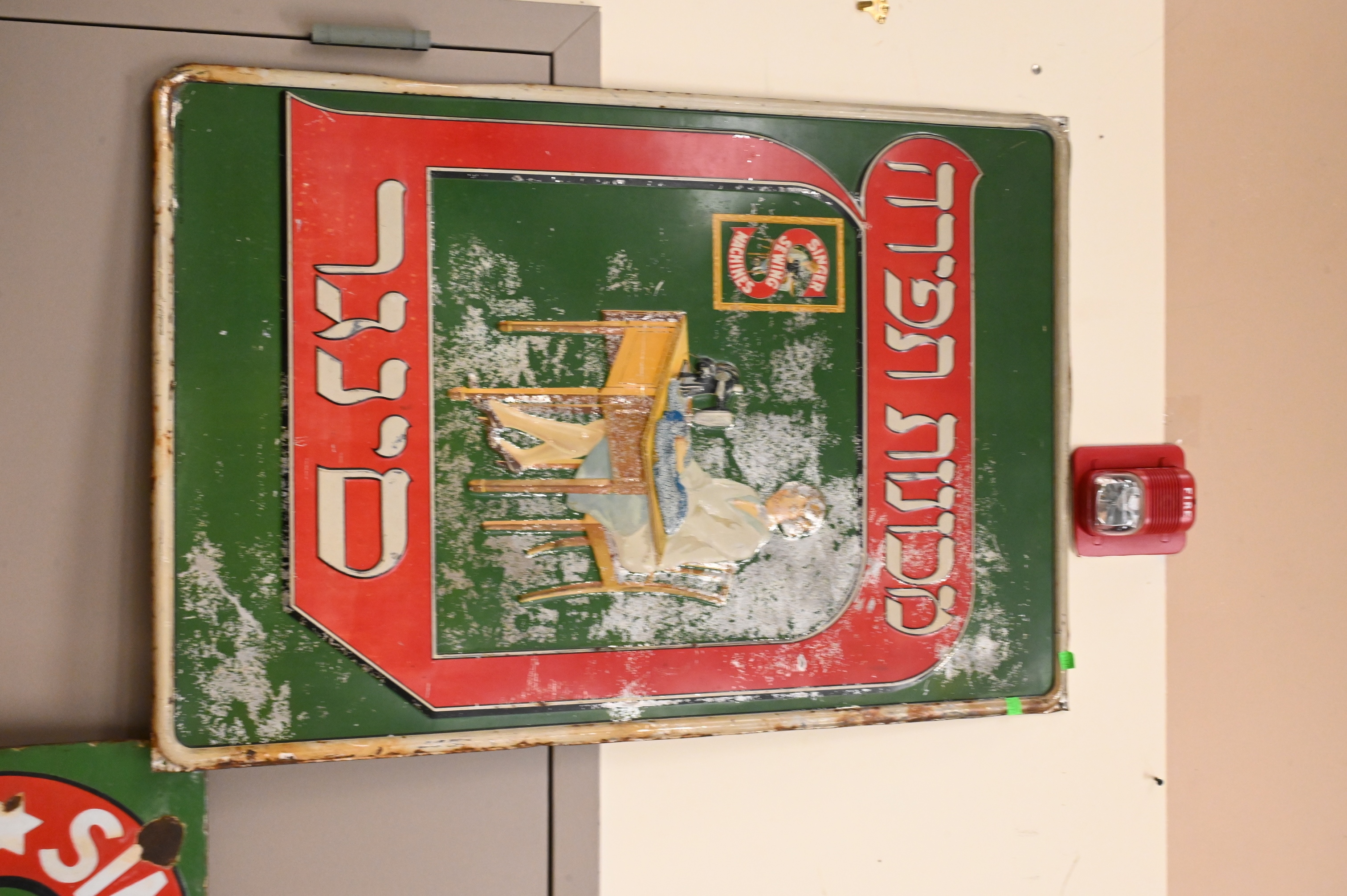 to include two enameled Hebrew Singer sewing machine advertisements, one with Hebrew writing, Palestine circa 1930, the other double sided tin sign having Star of David, four food advertisements “Stern’s Pickle Products” double sided tin sign, “Giant Ice Cream Cones 5¢ and 10¢” double sided wooden sign, a plastic Heinz pickle and strawberry milkshake tin sign