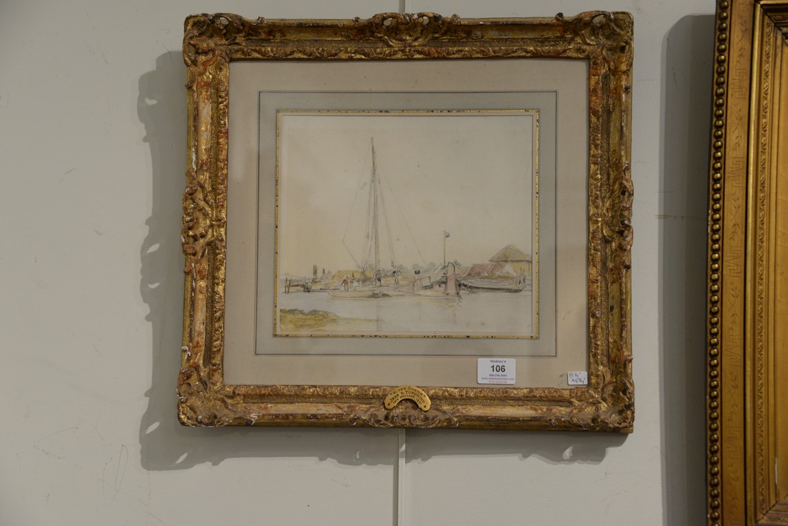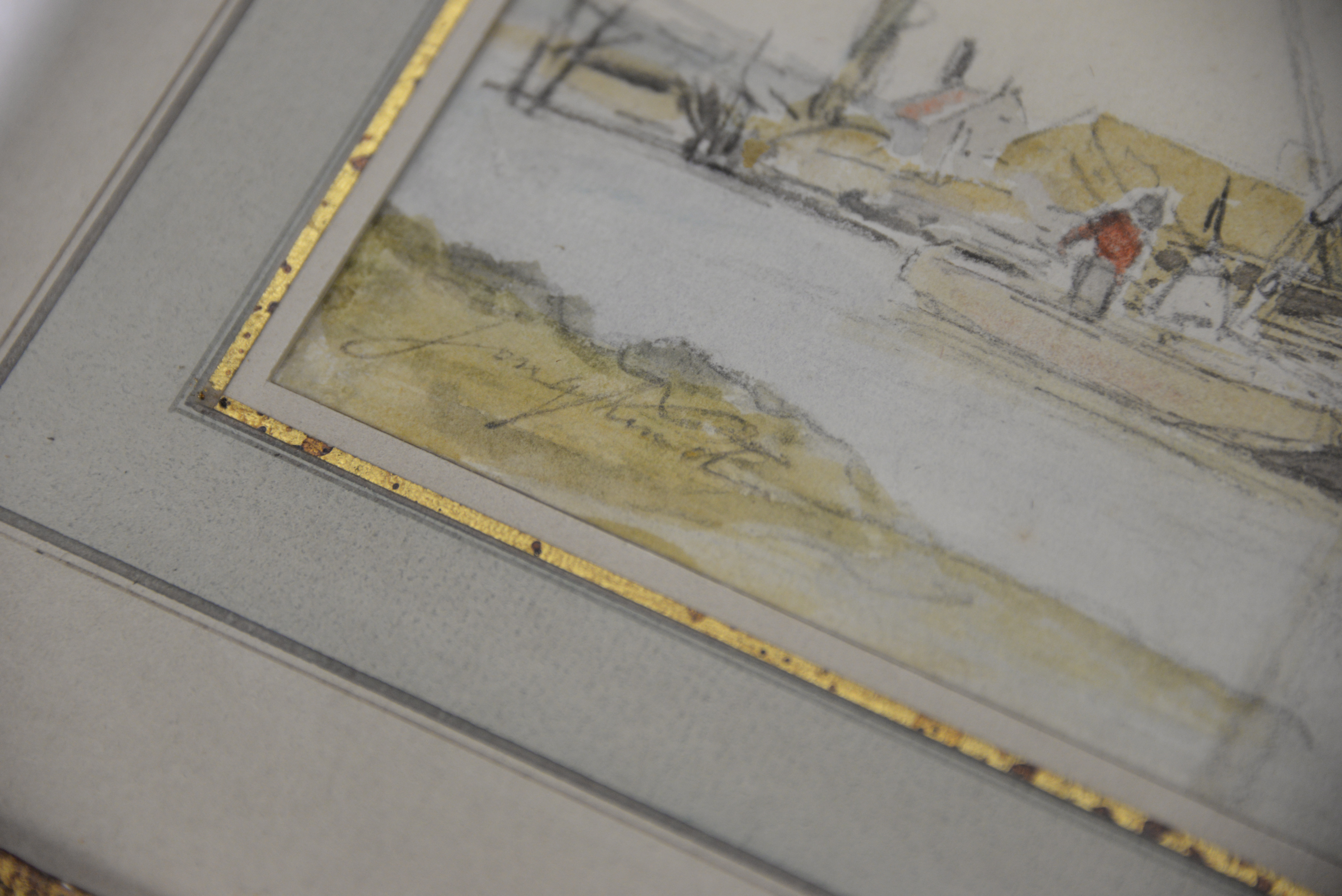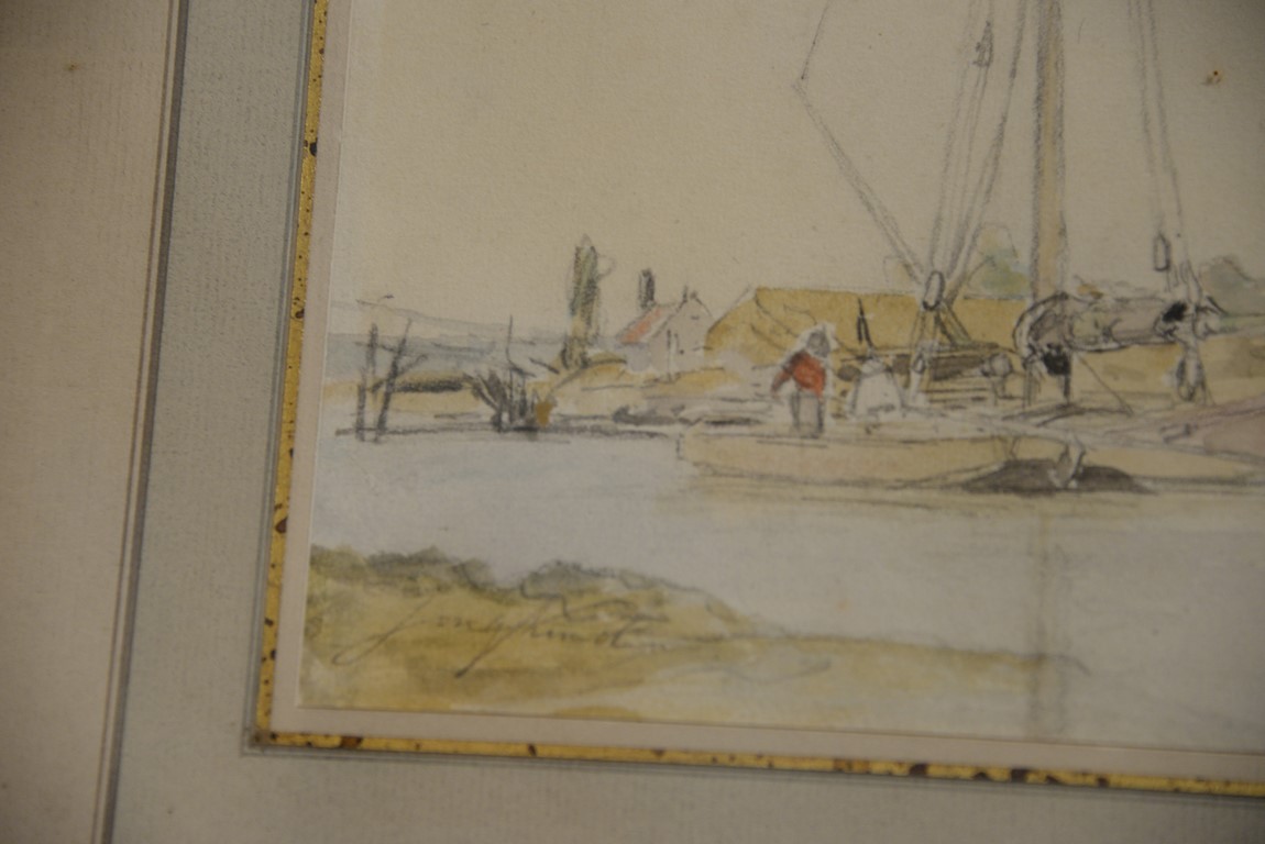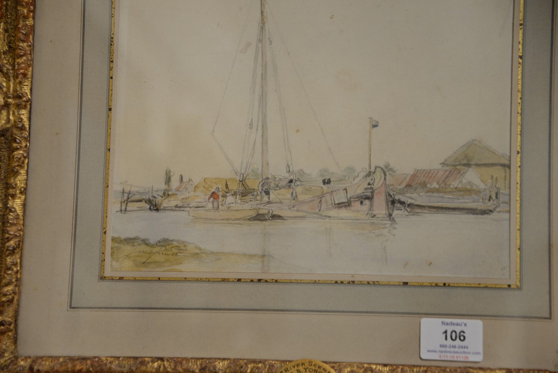 Lot 106: JOHAN J. BARTHOLD JONGKIND 1819-1891 River Scene watercolor and pencil on paper signed lower left Jongkind Hammer Galleries stamp on verso #20408-4 8 1/4 x 9 3/4 Provenance: Hammer Galleries 1
