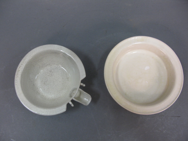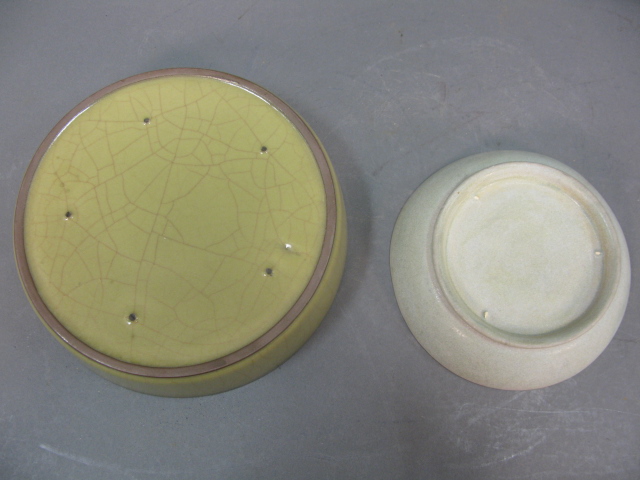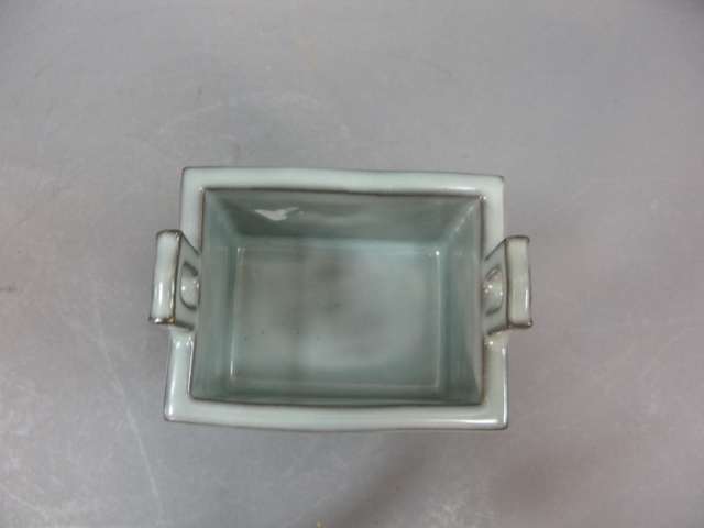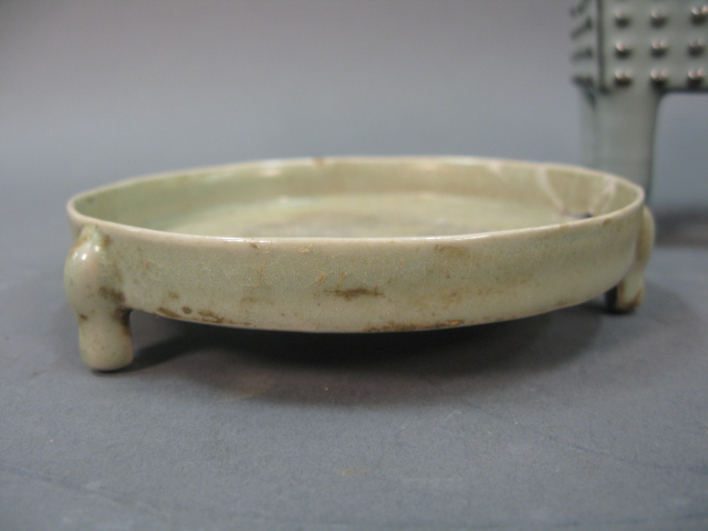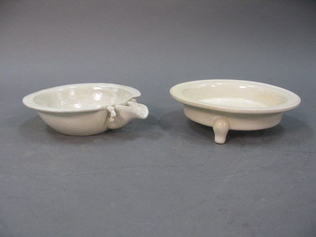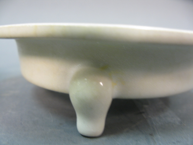 Lot of 7 items to include molded square incense burner, formed vase with three feet, rimmed plate incense burner, slight blue plate, crackled glazed shallow bowl, white pouring bowl and three footed white shallow bowl.