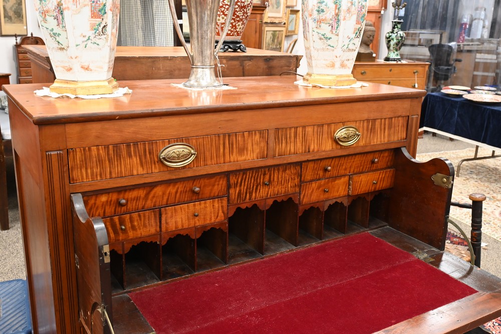 with tiger maple drawers having two short drawers over drop front desk opening to reveal tiger maple drawers all over three drawer set on turned legs